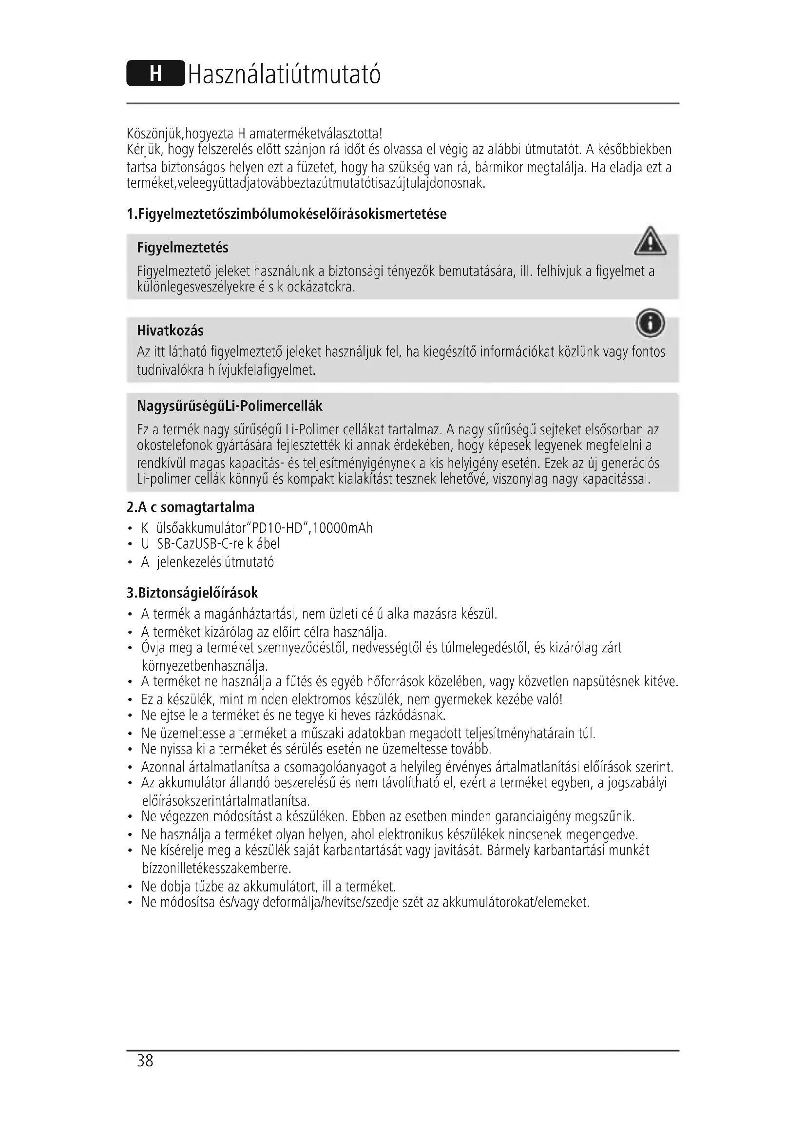 Figyelmeztetés Figyelmeztető jeleket használunk abiztonsági tényezőkbemutatására, ill. felhívjuk a gyelmet a különleges veszélyekreéskockázatokra. Hivatkozás Az itt látható gyelmeztető jeleket használjuk fel, ha kiegészítő információkat közlünk vagy fontos tudnivalókrahívjuk fel a gyelmet. Nagy sűrűségű Li-Polimer cellák Ez atermék nagy sűrűségű Li-Polimer cellákat tartalmaz. Anagy sűrűségű sejteket elsősorban az okostelefonok gyártásárafejlesztették ki annak érdekében, hogy képesek legyenek megfelelni a rendkívül magas kapacitás- és teljesítményigénynek akis helyigény esetén. Ezek az új generációs Li-polimer cellák könnyű és kompakt kialakítást tesznek lehetővé, viszonylag nagy kapacitással.