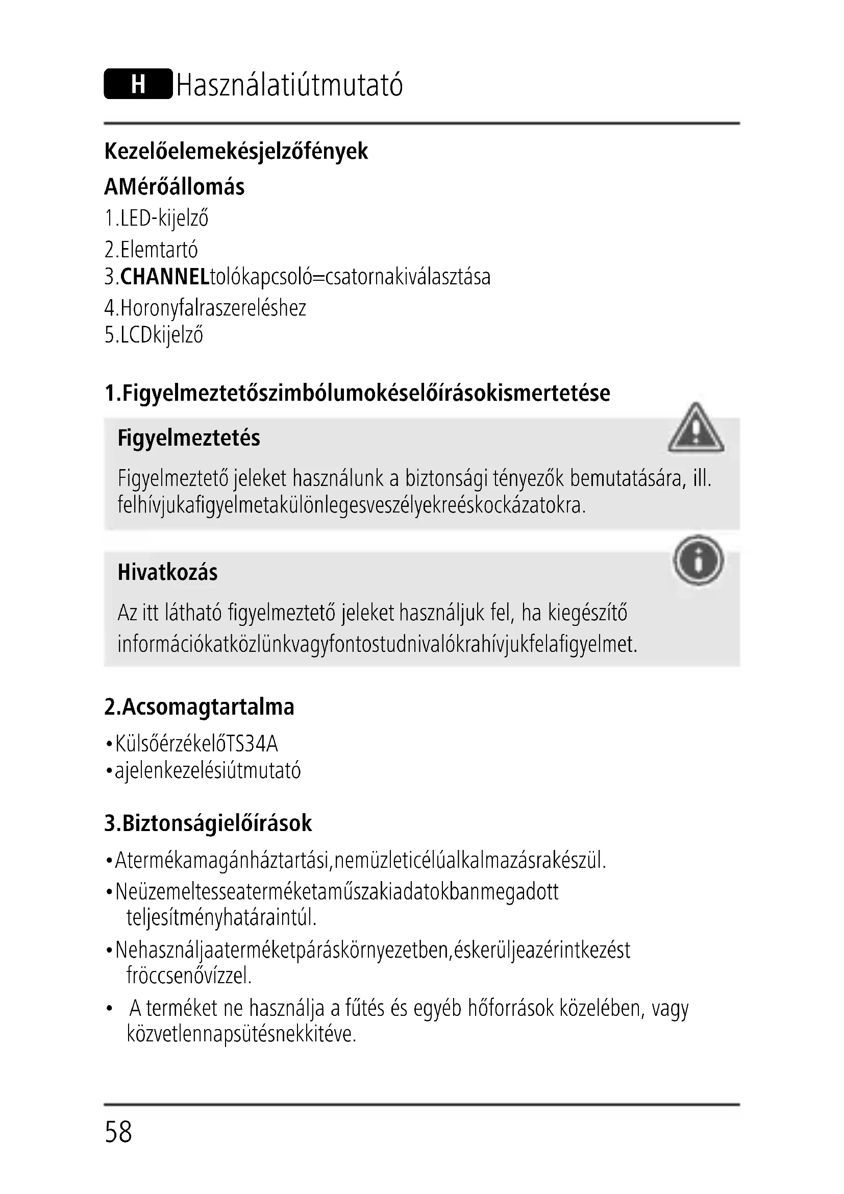 - A terméket ne használja a fűtés és egyéb hőforrások közelében, vagy közvetlen napsütésnek kitéve. H Használati útmutató59
