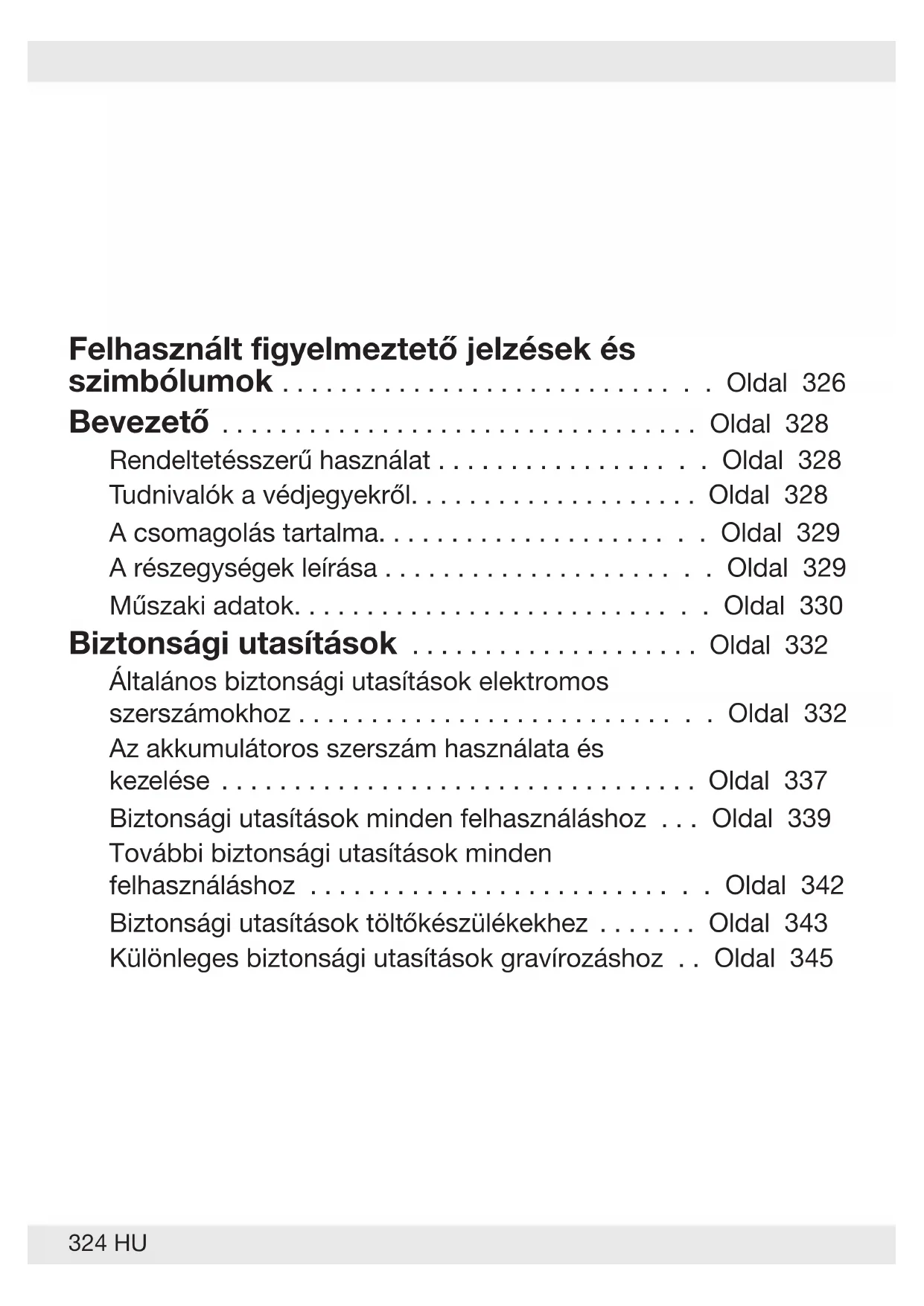 324 HU Felhasznált gyelmeztető jelzések és szimbólumok ........................... . . Oldal 326 Bevezető ............................... . . Oldal 328 Rendeltetésszerű használat ................ . . Oldal 328 Tudnivalók a védjegyekről.................. . . Oldal 328 A csomagolás tartalma.................... . . Oldal 329 A részegységek leírása .................... . . Oldal 329 Műszaki adatok.......................... . . Oldal 330 Biztonsági utasítások .................. . . Oldal 332 Általános biztonsági utasítások elektromos szerszámokhoz .......................... . . Oldal 332 Az akkumulátoros szerszám használata és kezelése ............................... . . Oldal 337 Biztonsági utasítások minden felhasználáshoz . . . Oldal 339 További biztonsági utasítások minden felhasználáshoz ......................... . . Oldal 342 Biztonsági utasítások töltőkészülékekhez ..... . . Oldal 343 Különleges biztonsági utasítások gravírozáshoz . . Oldal 345325HU Üzembehelyezés előtt .................. . . Oldal 346 Az akkumulátor feltöltése . . . . . . . . . . . . . . . . . . . . Oldal 346 Akkukapacitás-jelző ...................... . . Oldal 347 Kezelés ................................. . . Oldal 348 Be- és kikapcsolás ....................... . . Oldal 348 A gravírozás mélységének beállítása ......... . . Oldal 348 A gravírozó hegy cseréje................... . . Oldal 349 Utasítások a munkához ................... . . Oldal 349 Tisztítás és karbantartás ............... . . Oldal 350 Tisztítás................................ . . Oldal 350 Tárolás ................................. . . Oldal 350 Szállítás ................................ . . Oldal 351 Mentesítés ............................. . . Oldal 351 Garancia................................ . . Oldal 352 Garanciális ügyek lebonyolítása ............. . . Oldal 353 Szerviz ................................. . . Oldal 354 EU-megfelelőségi nyilatkozat .......... . . Oldal 355326 HU Felhasznált gyelmeztető jelzések és szimbólumok Ebben a használati útmutatóban és a csomagoláson az alábbi gyelmeztető jelzésekkel találkozhat: Olvassa el a használati útmutatót. VESZÉLY! Ez a szimbólum a „Veszély” szó mellett nagy kockázati tényezőre hívja fel a gyelmet, melyet ha nem kerülnek el, az súlyos sérülésekhez vagy halálesethez vezet. FIGYELMEZTETÉS! Ez a szimbólum a „Figyelmeztetés” szó mellett közepes kockázati tényezőre hívja fel a gyelmet, melyet ha nem kerülnek el, az súlyos sérülésekhez vagy akár halálesethez is vezethet. VIGYÁZAT! Ez a szimbólum a „Vigyázat” szó mellett alacsony kockázati tényezőre hívja fel a gyelmet, melyet ha nem kerülnek el, az kisebb vagy mérsékelt sérülésekhez vezethet. MEGJEGYZÉS: Ez a szimbólum a „Megjegyzés” szó mellett hasznos információkra hívja fel a gyelmet. Váltóáram/-feszültség Egyenáram/-feszültség327HU Viseljen fülvédőt! Viseljen védőszemüveget! Viseljen porvédőt! max. 45°C Az akkumulátorcsomagot óvja a hőtől, valamint a tartós és erős napfénytől. Az akkumulátorcsomagot óvja a víztől és a nedvességtől. Az akkumulátorcsomagot óvja a tűztől.