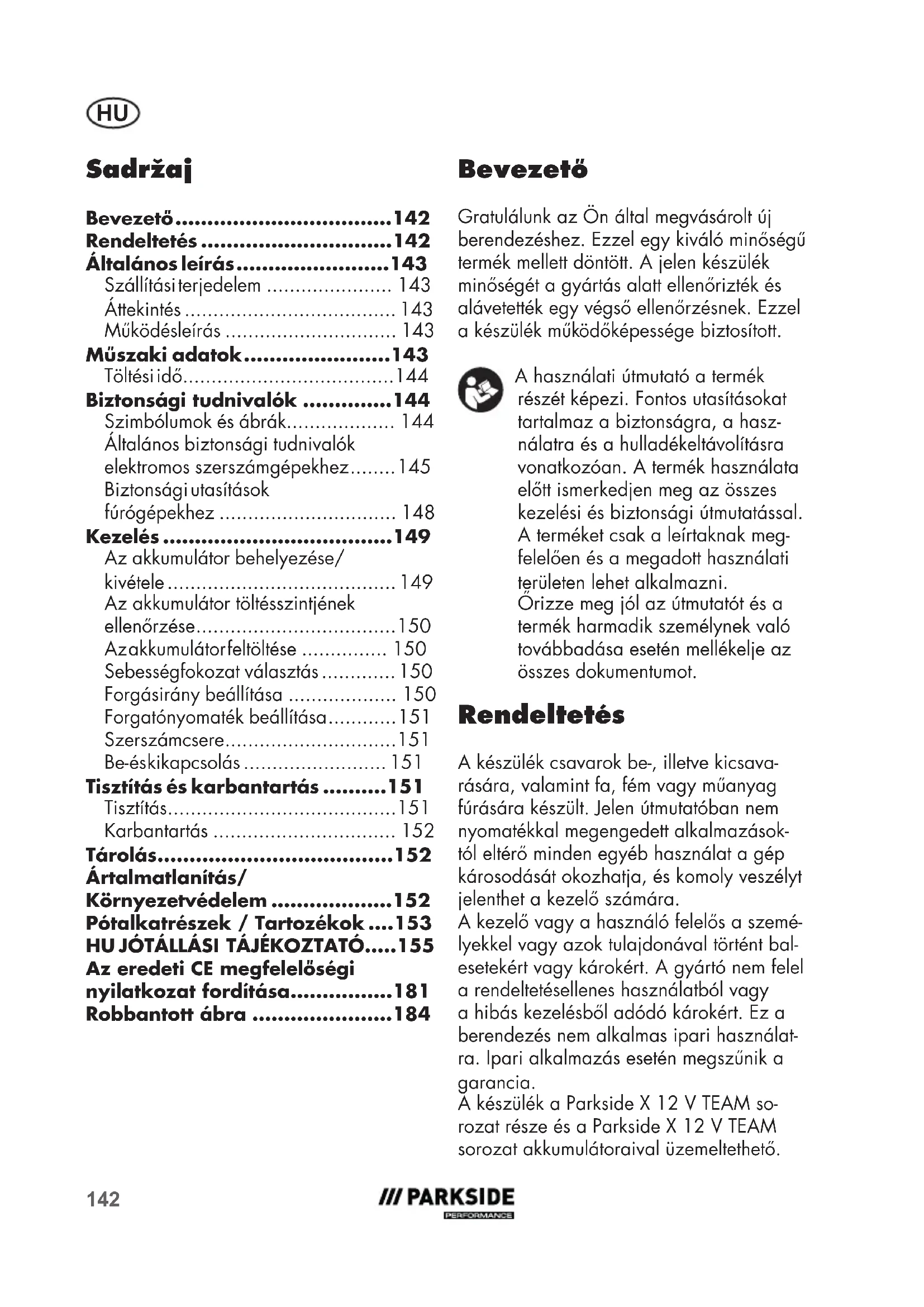 - Bevezető Gratulálunk az Ön által megvásárolt új berendezéshez. Ezzel egy kiváló minőségű termék mellett döntött. A jelen készülék minőségét a gyártás alatt ellenőrizték és alávetették egy végső ellenőrzésnek. Ezzel a készülék működőképessége biztosított. A használati útmutató a termék részét képezi. Fontos utasításokat tartalmaz a biztonságra, a hasz- nálatra és a hulladékeltávolításra vonatkozóan. A termék használata előtt ismerkedjen meg az összes kezelési és biztonsági útmutatással. A terméket csak a leírtaknak meg- felelően és a megadott használati területen lehet alkalmazni. Őrizze meg jól az útmutatót és a termék harmadik személynek való továbbadása esetén mellékelje az összes dokumentumot. Rendeltetés A készülék csavarok be-, illetve kicsava- rására, valamint fa, fém vagy műanyag fúrására készült. Jelen útmutatóban nem nyomatékkal megengedett alkalmazások- tól eltérő minden egyéb használat a gép károsodását okozhatja, és komoly veszélyt jelenthet a kezelő számára. A kezelő vagy a használó felelős a szemé- lyekkel vagy azok tulajdonával történt bal- esetekért vagy károkért. A gyártó nem felel a rendeltetésellenes használatból vagy a hibás kezelésből adódó károkért. Ez a berendezés nem alkalmas ipari használat- ra. Ipari alkalmazás esetén megszűnik a garancia. A készülék a Parkside X12VTEAM so- rozat része és a Parkside X12VTEAM sorozat akkumulátoraival üzemeltethető. Az eredeti CE megfelelőségi nyilatkozat fordítása p. 181
