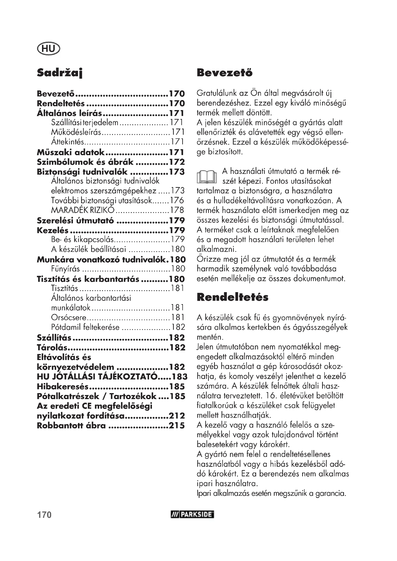 hibakeresés .............................185 Pótalkatrészek / Tartozékok ....185 Bevezető Gratulálunk az Ön által megvásárolt új berendezéshez. Ezzel egy kiváló minőségű termék mellett döntött. A jelen készülék minőségét a gyártás alatt ellenőrizték és alávetették egy végső ellen- őrzésnek. Ezzel a készülék működőképessé- ge biztosított. A használati útmutató a termék ré- szét képezi. Fontos utasításokat tartalmaz a biztonságra, a használatra és a hulladékeltávolításra vonatkozóan. A termék használata előtt ismerkedjen meg az összes kezelési és biztonsági útmutatással. A terméket csak a leírtaknak megfelelően és a megadott használati területen lehet alkalmazni. Őrizze meg jól az útmutatót és a termék harmadik személynek való továbbadása esetén mellékelje az összes dokumentumot. Rendeltetés A készülék csak fű és gyomnövények nyírá- sára alkalmas kertekben és ágyásszegélyek mentén. Jelen útmutatóban nem nyomatékkal meg- engedett alkalmazásoktól eltérő minden egyéb használat a gép károsodását okoz- hatja, és komoly veszélyt jelenthet a kezelő számára. A készülék felnőttek általi hasz- nálatra terveztetett. 16. életévüket betöltött atalkorúak a készüléket csak felügyelet mellett használhatják. A kezelő vagy a használó felelős a sze- mélyekkel vagy azok tulajdonával történt balesetekért vagy károkért. A gyártó nem felel a rendeltetésellenes használatból vagy a hibás kezelésből adó- dó károkért. Ez a berendezés nem alkalmas ipari használatra. Ipari alkalmazás esetén megszűnik a garancia.