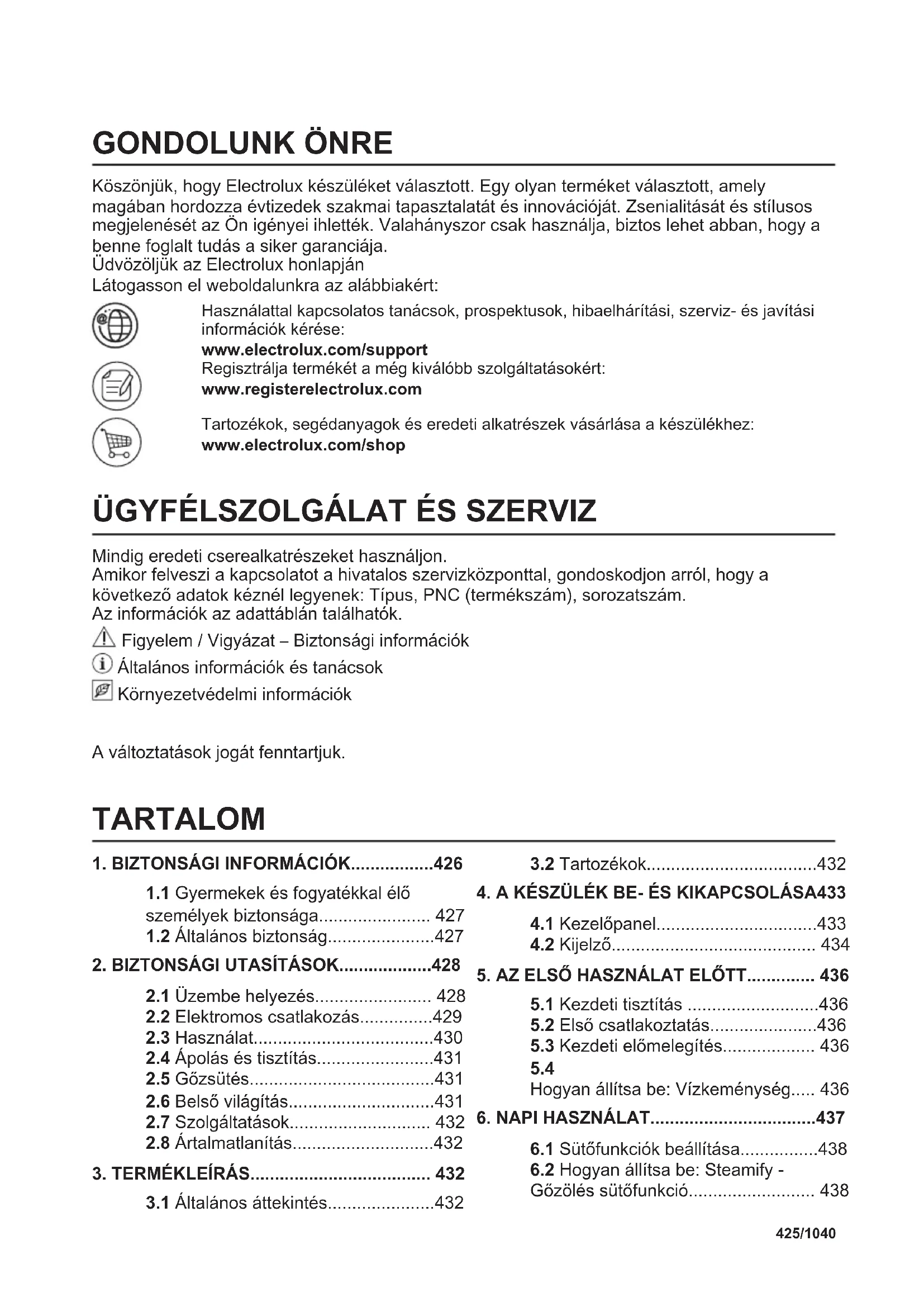 Ανακυκλώστε τα υλικά που φέρουν το σύμβολο . Τοποθετήστε τα υλικά συσκευασίας σε κατάλληλα δοχεία για ανακύκλωση. Συμβάλετε στην προστασία του περιβάλλοντος και της ανθρώπινης υγείας ανακυκλώνοντας τις άχρηστες ηλεκτρικές και ηλεκτρονικές συσκευές. Μην απορρίπτετε με τα οικιακά απορρίμματα συσκευές που φέρουν το σύμβολο . Επιστρέψτε το προϊόν στην τοπική σας μονάδα ανακύκλωσης ή επικοινωνήστε με τη δημοτική αρχή. 424/1040 ΧΡΗΣΙΜΟΠΟΙΉΣΤΕ ΜΙΑ ΣΥΝΤΌΜΕΥΣΗ!GONDOLUNK ÖNRE Köszönjük, hogy Electrolux készüléket választott. Egy olyan terméket választott, amely magában hordozza évtizedek szakmai tapasztalatát és innovációját. Zsenialitását és stílusos megjelenését az Ön igényei ihlették. Valahányszor csak használja, biztos lehet abban, hogy a benne foglalt tudás a siker garanciája. Üdvözöljük az Electrolux honlapján Látogasson el weboldalunkra az alábbiakért: Használattal kapcsolatos tanácsok, prospektusok, hibaelhárítási, szerviz- és javítási információk kérése: www.electrolux.com/support Regisztrálja termékét a még kiválóbb szolgáltatásokért: www.registerelectrolux.com Tartozékok, segédanyagok és eredeti alkatrészek vásárlása a készülékhez: www.electrolux.com/shop