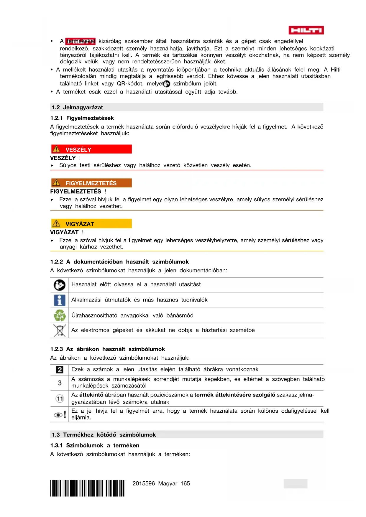 - A mellékelt használati utasítás a nyomtatás időpontjában a technika aktuális állásának felel meg. A Hilti termékoldalán mindig megtalálja a legfrissebb verziót. Ehhez kövesse a jelen használati utasításban található linket vagy QR-kódot, melyet a szimbólum jelölt.