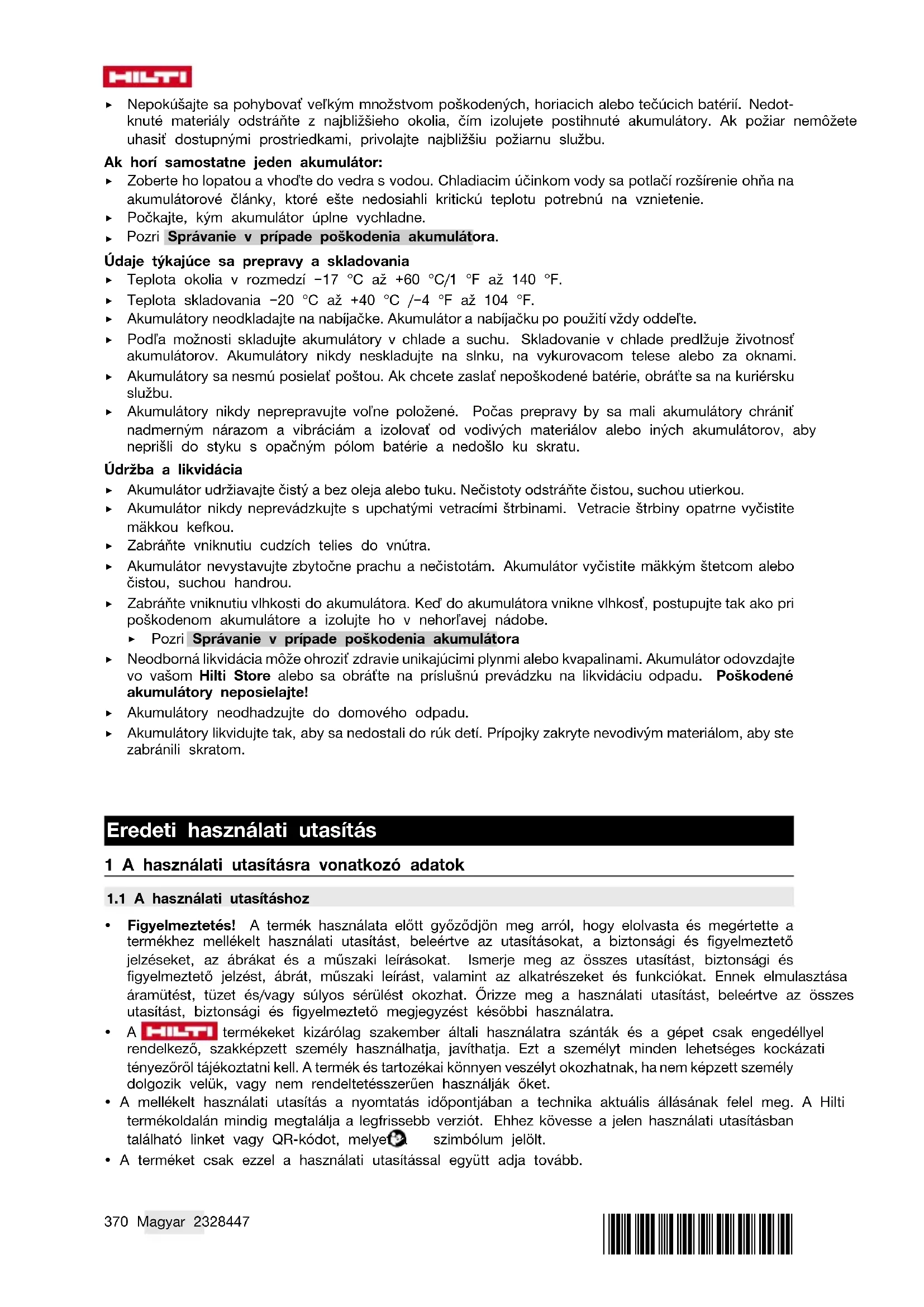 PM 20CG A12 ▶ A Li-ion akkuk biztonságos kezelésére és használatára vegye figyelembe a következő biztonsági tudnivalókat. Ezek figyelmen kívül hagyása bőrirritációt, súlyos korrozív sérülést, kémiai égési sérülést, tüzet és/vagy robbanást okozhat. ▶ Az akkut csak kifogástalan műszaki állapotban használja. ▶ A sérülések elkerülése és ez egészségre erősen ártalmas folyadékok kifolyásának megakadályozására odafigyeléssel használja az akkut! ▶ Az akkuk semmi esetre sem módosíthatók vagy manipulálhatók! ▶ Az akkut tilos szétszedni, összepréselni, 80 °C fölé hevíteni vagy elégetni. ▶ Ne használjon vagy töltsön olyan akkut, amelyet ütés ért, vagy egyéb más módon sérült. Rendszeresen ellenőrizze az akkukat sérülés szempontjából. ▶ Soha ne használjon újrafelhasznált vagy javított akkukat. ▶ Az akkut vagy akkumulátoros elektromos kéziszerszámot soha ne használja ütőszerszámként. ▶ Az akkukat soha ne tegye ki közvetlen napsugárzásnak, magas hőmérsékletnek, szikraképződésnek vagy nyílt lángnak. Ezek robbanást okozhatnak. ▶ Ne érintse ujjal, szerszámmal, ékszerrel vagy egyéb elektromosan vezető tárgyakkal az akkumulátor pólusait. Ez az akku sérülését okozhatja, valamint anyagi károkhoz és sérülésekhez vezethet. ▶ Tartsa távol az akkumulátort esőtől, nedvességtől és folyadékoktól. A behatoló folyadék rövidzárlatot, áramütést, égési sérülést, tüzet és robbanást okozhat. ▶ Csak az ehhez az akkumulátortípushoz tervezett töltőkészülékeket és elektromos kéziszerszámokat használja. Ehhez vegye figyelembe a megfelelő használati utasítás adatait. ▶ Ne használjon és ne tárolja az akkut robbanásveszélyes környezetben.*2328447* 2328447 Magyar 375 ▶ Ha érintésre túl forró az akku, akkor lehet, hogy meghibásodott. Állítsa az akkut egy látható, nem gyúlékony helyre, éghető anyagoktól elegendő távolságra. Hagyja lehűlni az akkut. Amennyiben egy óra elteltével még mindig túl forró az akku érintésre, akkor meghibásodott. Forduljon a Hilti Szervizhez vagy olvassa el a „Tudnivalók a Hilti Li-ion akkuk biztonságával és alkalmazásával kapcsolatban” c. dokumentumot. Vegye figyelembe a lítium-ion akkuk szállítására, tárolására és alkalmazására vonatkozó speciális irányelveket. → Oldal 388 Olvassael a Hilti Li-ion akkuk biztonságával és alkalmazásával kapcsolatos tudnivalókat, amelyeket a jelen használati utasítás végén található QR-kód beolvasásával érhet el.