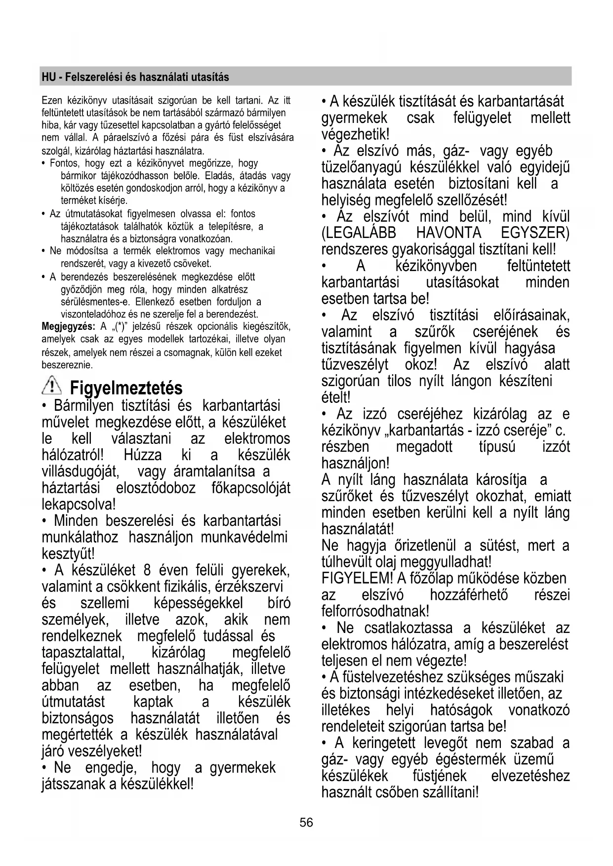 - Az elszívót SOHA ne használja tárolófelületként, hacsak az ilyen célra való használata nincs egyértelműen jelezve!