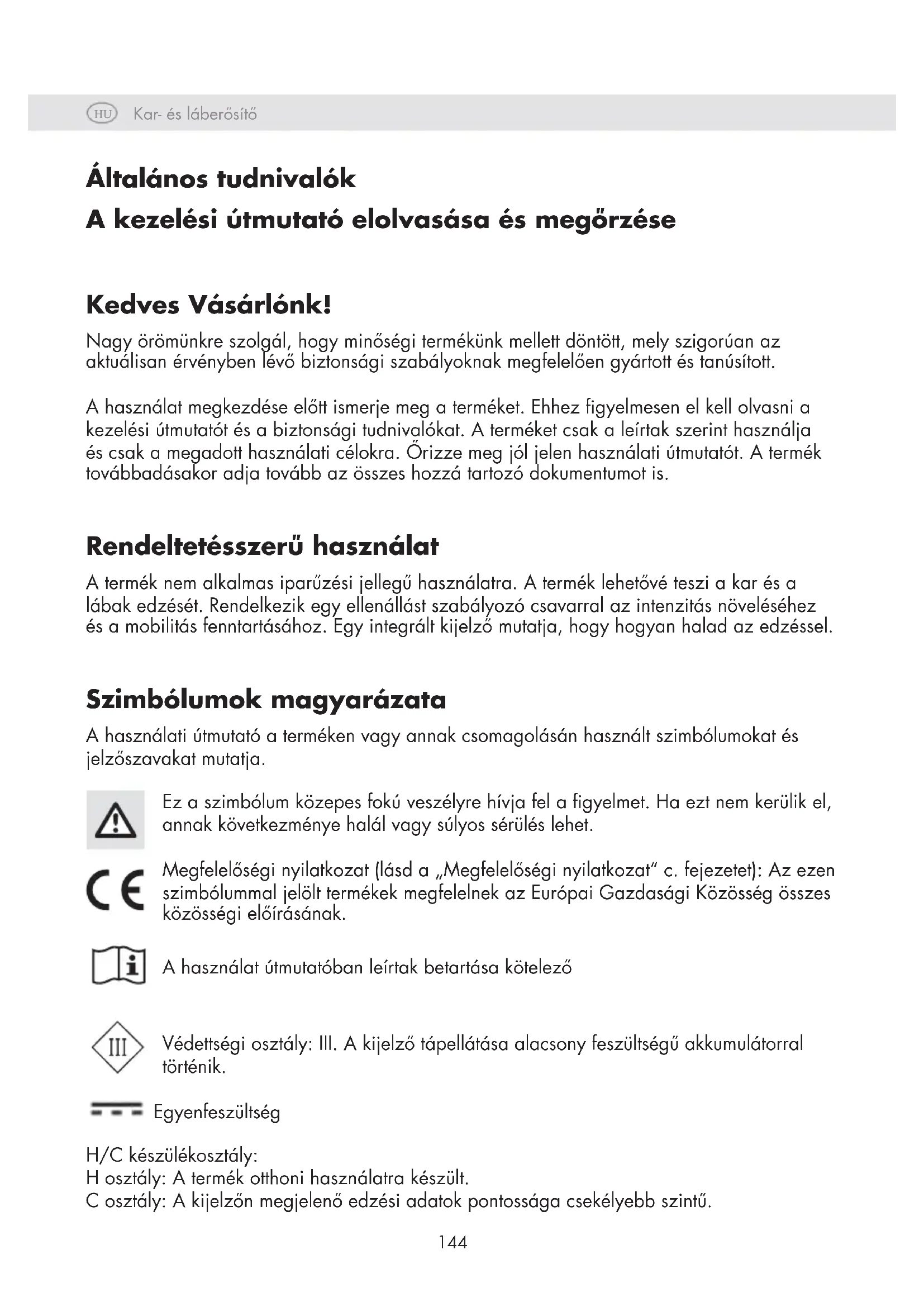 Általános tudnivalók A kezelési útmutató elolvasása és megőrzése Kedves Vásárlónk! Nagy örömünkre szolgál, hogy minőségi termékünk mellett döntött, mely szigorúan az aktuálisan érvényben lévő biztonsági szabályoknak megfelelően gyártott és tanúsított. A használat megkezdése előtt ismerje meg a terméket. Ehhez gyelmesen el kell olvasni a kezelési útmutatót és a biztonsági tudnivalókat. A terméket csak a leírtak szerint használja és csak a megadott használati célokra. Őrizze meg jól jelen használati útmutatót. A termék továbbadásakor adja tovább az összes hozzá tartozó dokumentumot is. Rendeltetésszerű használat A termék nem alkalmas iparűzési jellegű használatra. A termék lehetővé teszi a kar és a lábak edzését. Rendelkezik egy ellenállást szabályozó csavarral az intenzitás növeléséhez és a mobilitás fenntartásához. Egy integrált kijelző mutatja, hogy hogyan halad az edzéssel. Szimbólumok magyarázata A használati útmutató a terméken vagy annak csomagolásán használt szimbólumokat és jelzőszavakat mutatja. Ez a szimbólum közepes fokú veszélyre hívja fel a gyelmet. Ha ezt nem kerülik el, annak következménye halál vagy súlyos sérülés lehet. Megfelelőségi nyilatkozat (lásd a „Megfelelőségi nyilatkozat“ c. fejezetet): Az ezen szimbólummal jelölt termékek megfelelnek az Európai Gazdasági Közösség összes közösségi előírásának. A használat útmutatóban leírtak betartása kötelező Védettségi osztály: III. A kijelző tápellátása alacsony feszültségű akkumulátorral történik. Egyenfeszültség H/C készülékosztály: H osztály: A termék otthoni használatra készült. C osztály: A kijelzőn megjelenő edzési adatok pontossága csekélyebb szintű.HU Kar- és láberősítő Kar- és láberősítő