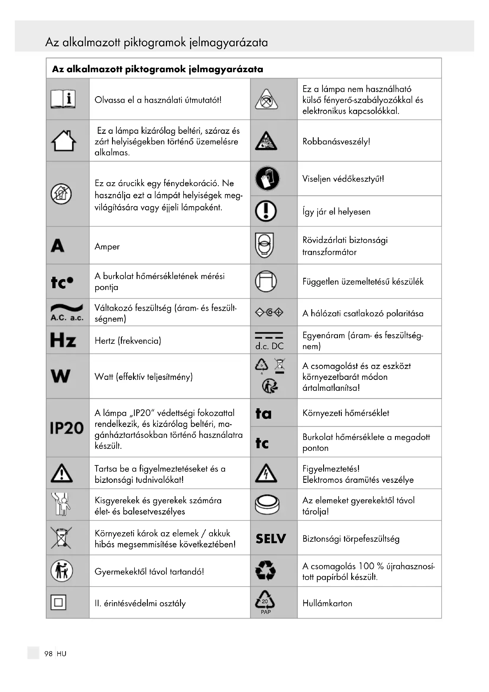 Burkolat hőmérséklete a megadott ponton Tartsa be a figyelmeztetéseket és a biztonsági tudnivalókat! Figyelmeztetés! Elektromos áramütés veszélye Kisgyerekek és gyerekek számára élet- és balesetveszélyes Az elemeket gyerekektől távol tárolja! Környezeti károk az elemek / akkuk hibás megsemmisítése következtében! SELV Biztonsági törpefeszültség Gyermekektől távol tartandó! A csomagolás 100 % újrahasznosí- tott papírból készült.