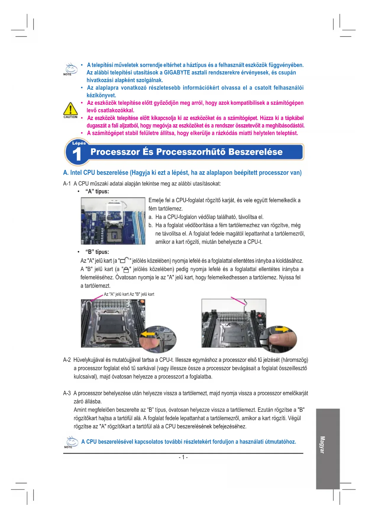 - “B” típus: Az "A" jelű kart (a " " jelölés közelében) nyomja lefelé és a foglalattal ellentétes irányba a kioldásához. A "B" jelű kart (a " " jelölés közelében) pedig nyomja lefelé és a foglalattal ellentétes irányba a felemeléséhez. Óvatosan nyomja le az "A" jelű kart, hogy felemelkedhessen a tartólemez. Nyissa fel a tartólemezt. A-1 A CPU műszaki adatai alapján tekintse meg az alábbi utasításokat: