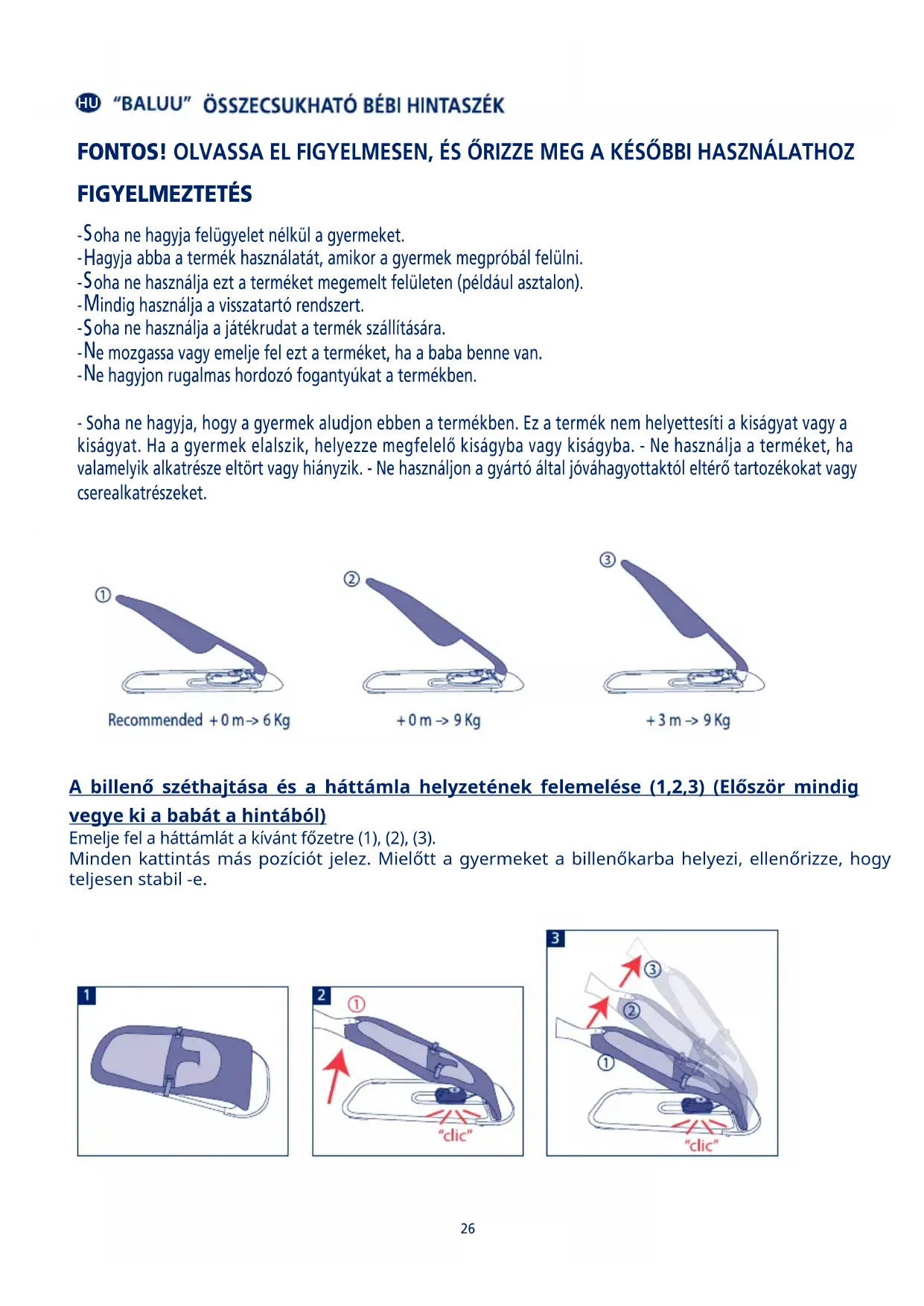 Vždy držte opěradlo 25HU A billenő széthajtása és a háttámla helyzetének felemelése (1,2,3) (Először mindig vegye ki a babát a hintából) Emelje fel a háttámlát a kívánt főzetre (1), (2), (3). Minden kattintás más pozíciót jelez. Mielőtt a gyermeket a billenőkarba helyezi, ellenőrizze, hogy teljesen stabil -e.