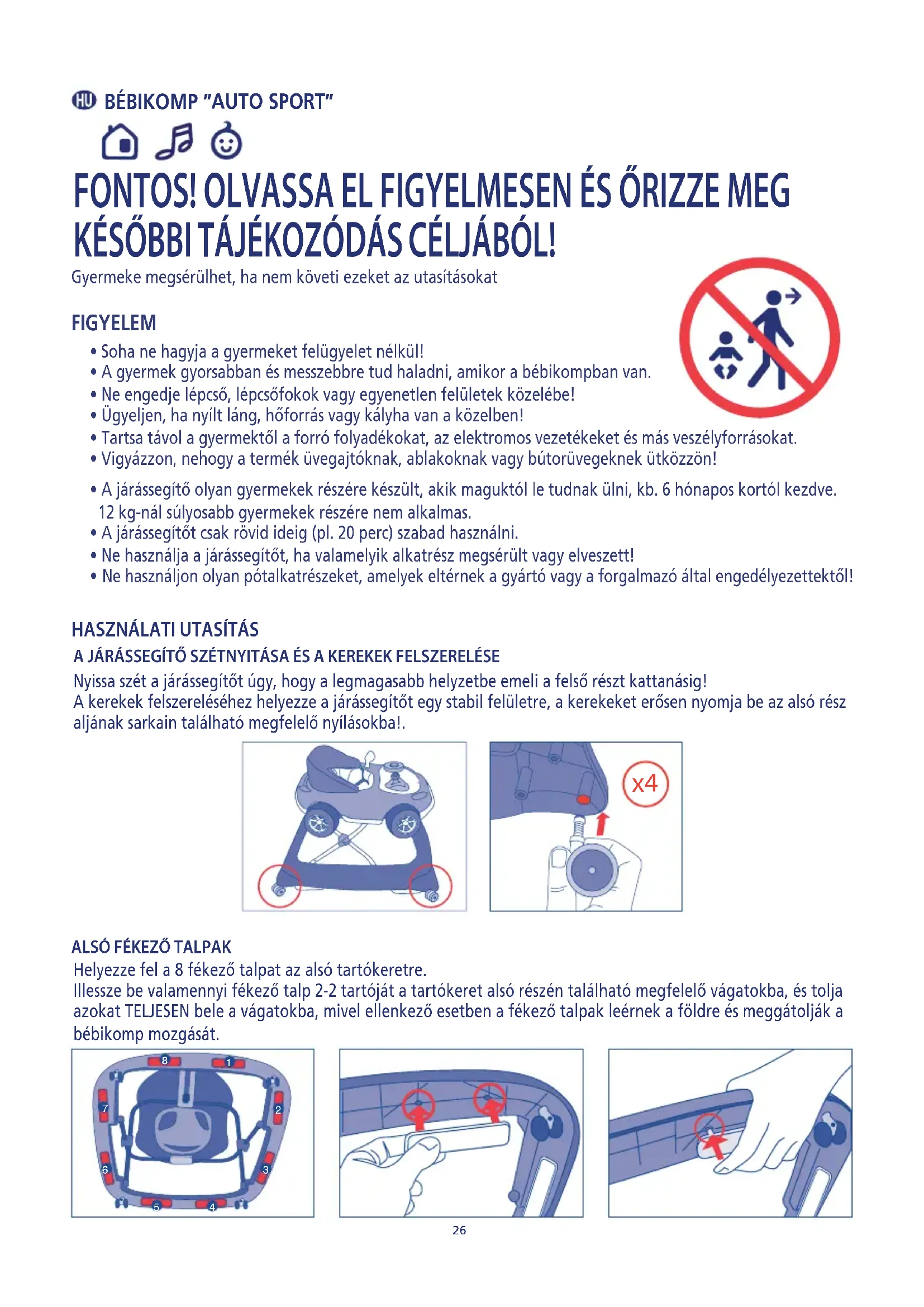 - A járássegítő olyan gyermekek részére készült, akik maguktól le tudnak ülni, kb. 6 hónapos kortól kezdve. 12 kg-nál súlyosabb gyermekek részére nem alkalmas.• A járássegítőt csak rövid ideig (pl. 20 perc) szabad használni.• Ne használja a járássegítőt, ha valamelyik alkatrész megsérült vagy elveszett! Ne használjon olyan pótalkatrészeket, amelyek eltérnek a gyártó vagy a forgalmazó által engedélyezettektől!• Soha ne hagyja a gyermeket felügyelet nélkül!• A gyermek gyorsabban és messzebbre tud haladni, amikor a bébikompban van.• Ne engedje lépcső, lépcsőfokok vagy egyenetlen felületek közelébe!• Ügyeljen, ha nyílt láng, hőforrás vagy kályha van a közelben!• Tartsa távol a gyermektől a forró folyadékokat, az elektromos vezetékeket és más veszélyforrásokat.• Vigyázzon, nehogy a termék üvegajtóknak, ablakoknak vagy bútorüvegeknek ütközzön!Gyermeke megsérülhet, ha nem követi ezeket az utasításokat
