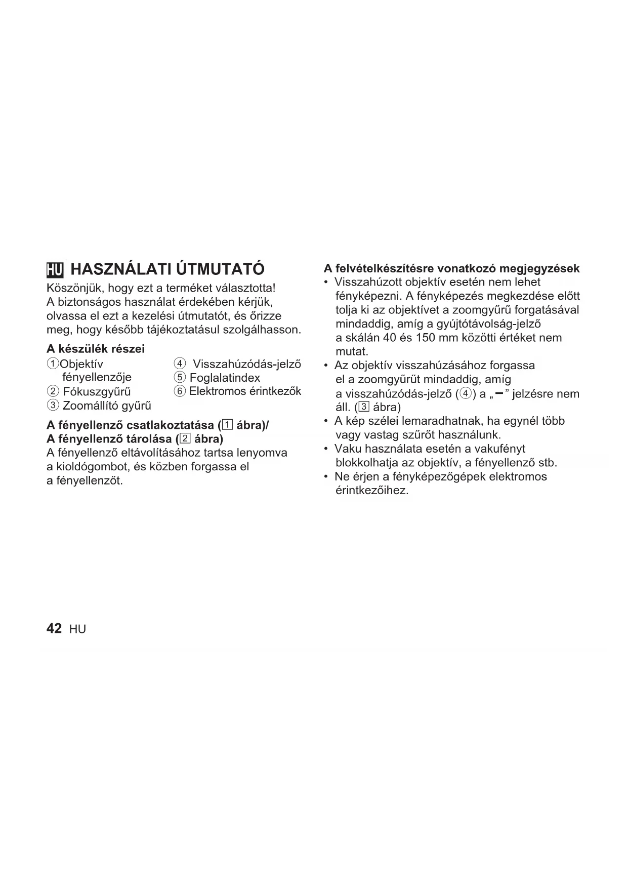 Köszönjük, hogy ezt a terméket választotta! A biztonságos használat érdekében kérjük, olvassa el ezt a kezelési útmutatót, és őrizze meg, hogy később tájékoztatásul szolgálhasson. A készülék részei 1 Objektív fényellenzője 2 Fókuszgyűrű 3 Zoomállító gyűrű 4 Visszahúzódás-jelző 5 Foglalatindex
