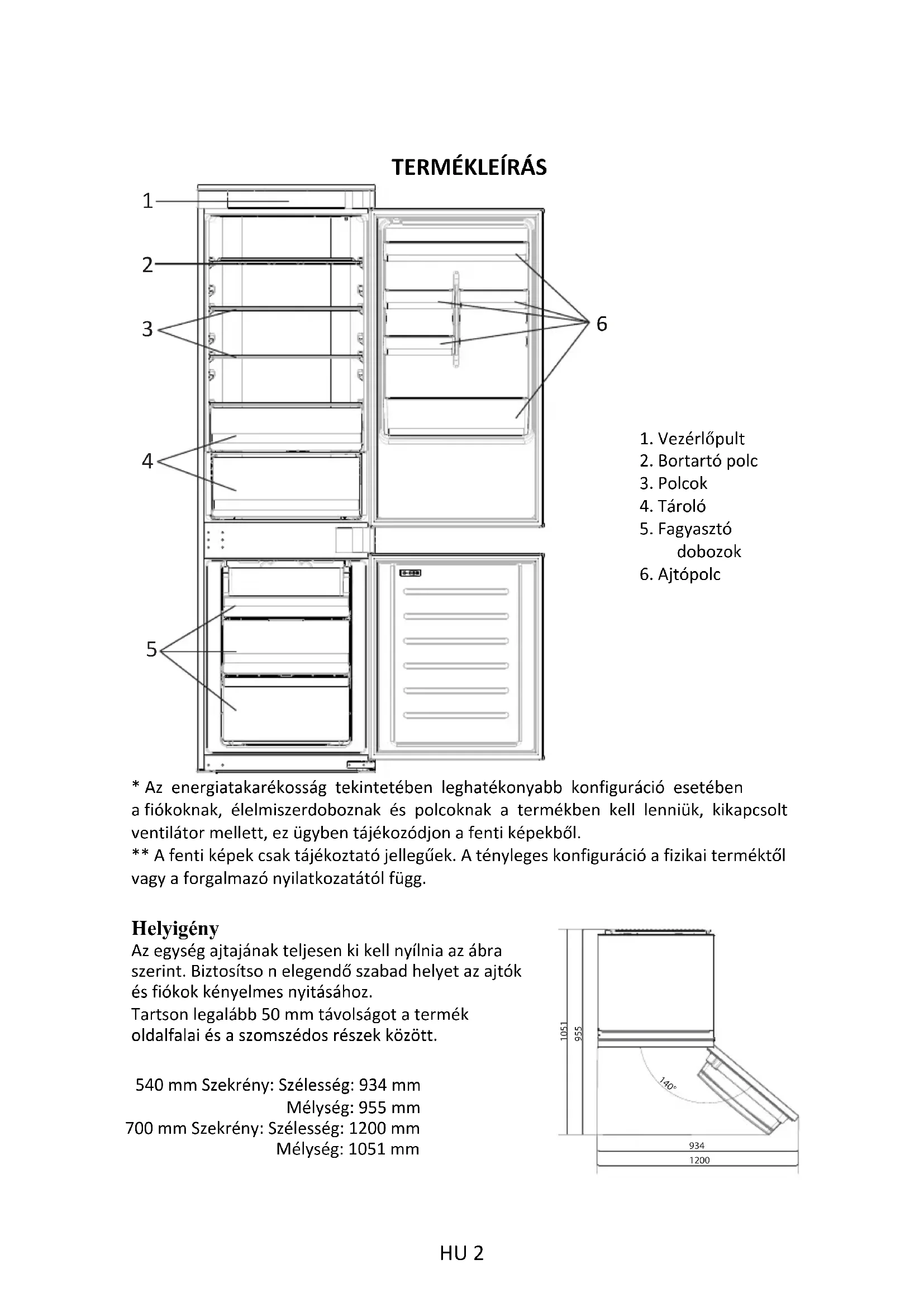 1. Vezérlőpult2. Bortartó polc3. Polcok4. Tároló5. Fagyasztódobozok6. Ajtópolc* Az energiatakarékosság tekintetében leghatékonyabb konfiguráció esetébena fiókoknak, élelmiszerdoboznak és polcoknak a termékben kell lenniük, kikapcsoltventilátor mellett, ez ügyben tájékozódjon a fenti képekből.** A fenti képek csak tájékoztató jellegűek. A tényleges konfiguráció a fizikai terméktőlvagy a forgalmazó nyilatkozatától függ.Helyigény Az egység ajtajának teljesen ki kell nyílnia az ábra szerint. Biztosítso n elegendő szabad helyet az ajtók és fiókok kényelmes nyitásához. Tartson legalább 50 mm távolságot a termék oldalfalai és a szomszédos részek között. 540 mm Szekrény: Szélesség: 934 mmMélység: 955 mm700 mm Szekrény: Szélesség: 1200 mmMélység: 1051 mm