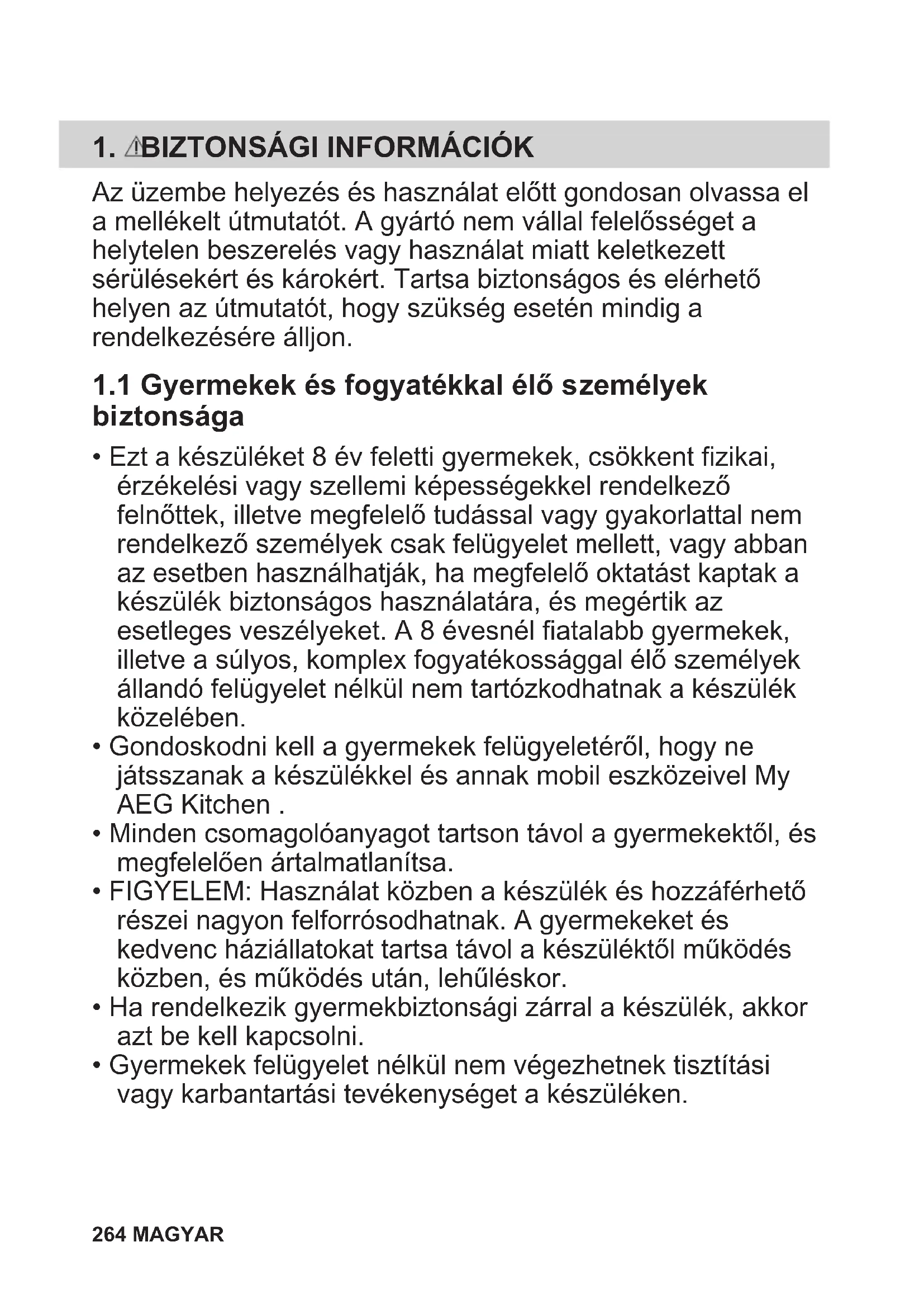 - Gondoskodni kell a gyermekek felügyeletéről, hogy ne játsszanak a készülékkel és annak mobil eszközeivel My AEG Kitchen .