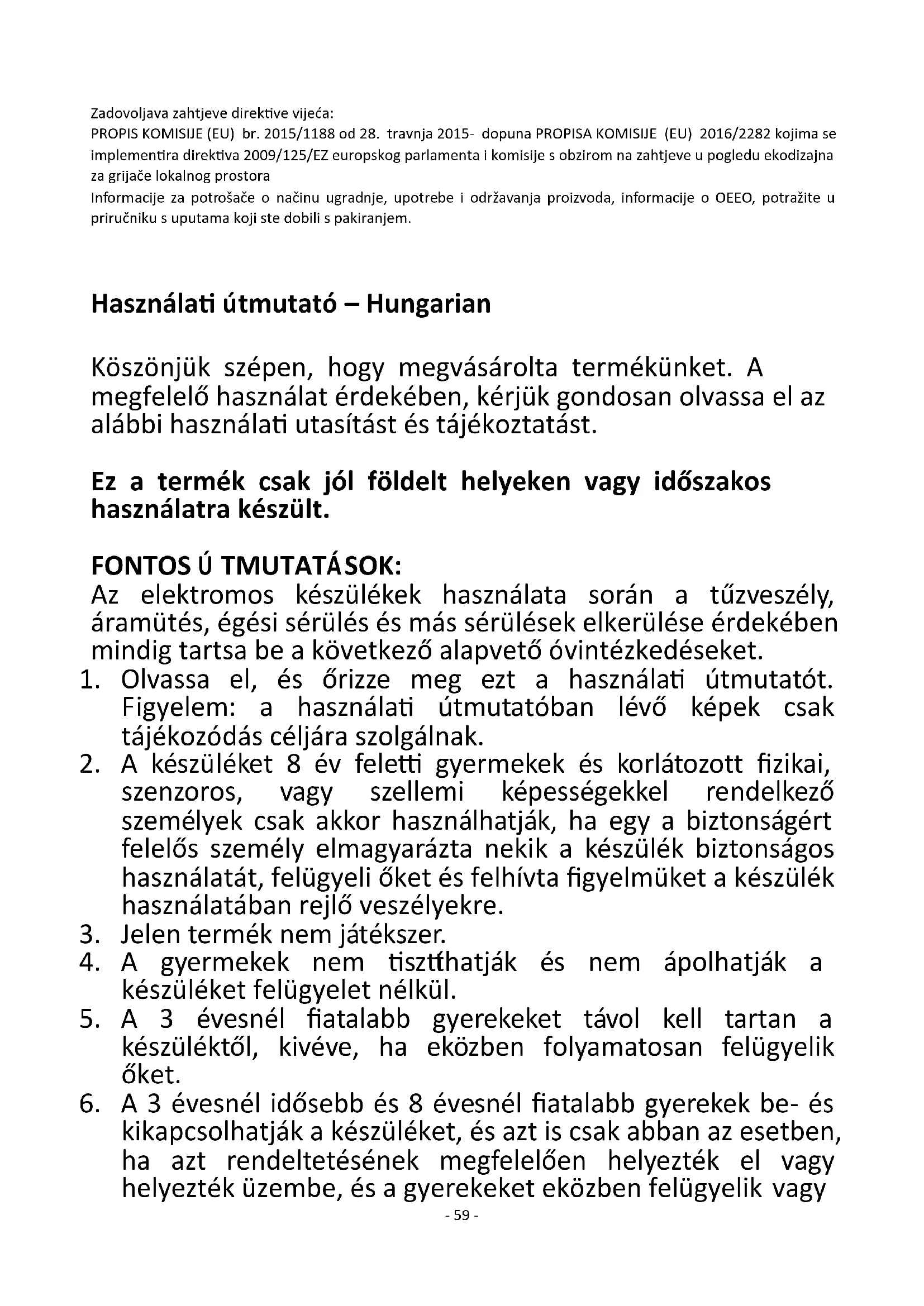 Podaci za kontakt BAHAG AG Gutenbergstr. 21 68167 Mannheim GERMANY- 59 - Zadovoljava zahtjeve direktive vijeća: PROPIS KOMISIJE (EU) br. 2015/1188 od 28. travnja 2015- dopuna PROPISA KOMISIJE (EU) 2016/2282 kojima se implementira direktiva 2009/125/EZ europskog parlamenta i komisije s obzirom na zahtjeve u pogledu ekodizajna za grijače lokalnog prostora Informacije za potrošače o načinu ugradnje, upotrebe i održavanja proizvoda, informacije o OEEO, potražite u priručniku s uputama koji ste dobili s pakiranjem. Használati útmutató – Hungarian Köszönjük szépen, hogy megvásárolta termékünket. A megfelelő használat érdekében, kérjük gondosan olvassa el az alábbi használati utasítást és tájékoztatást. Ez a termék csak jól földelt helyeken vagy időszakos használatra készült. FONTOS Ú TMUTATÁSOK: Az elektromos készülékek használata során a tűzveszély, áramütés, égési sérülés és más sérülések elkerülése érdekében mindig tartsa be a következő alapvető óvintézkedéseket.