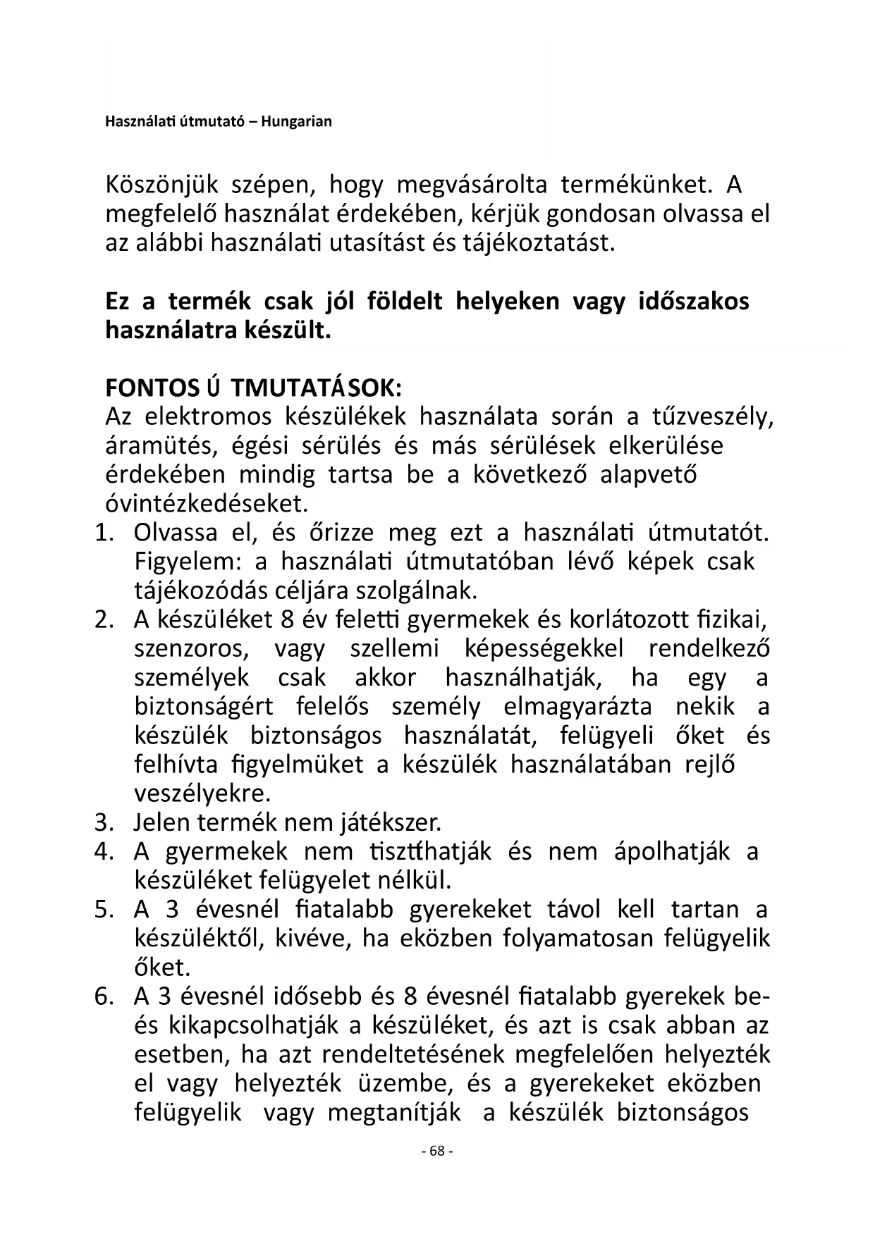 Zadovoljava zahtjeve direktive vijeća: PROPIS KOMISIJE (EU) br. 2015/1188 od 28. travnja 2015- dopuna PROPISA KOMISIJE (EU) 2016/2282 kojima se implementira direktiva 2009/125/EZ europskog parlamenta i komisije s obzirom na zahtjeve u pogledu ekodizajna za grijače lokalnog prostora Informacije za potrošače o načinu ugradnje, upotrebe i održavanja proizvoda, informacije o OEEO, potražite u priručniku s uputama koji ste dobili s pakiranjem.- 68 - Használati útmutató – Hungarian Köszönjük szépen, hogy megvásárolta termékünket. A megfelelő használat érdekében, kérjük gondosan olvassa el az alábbi használati utasítást és tájékoztatást. Ez a termék csak jól földelt helyeken vagy időszakos használatra készült. FONTOS Ú TMUTATÁSOK: Az elektromos készülékek használata során a tűzveszély, áramütés, égési sérülés és más sérülések elkerülése érdekében mindig tartsa be a következő alapvető óvintézkedéseket.