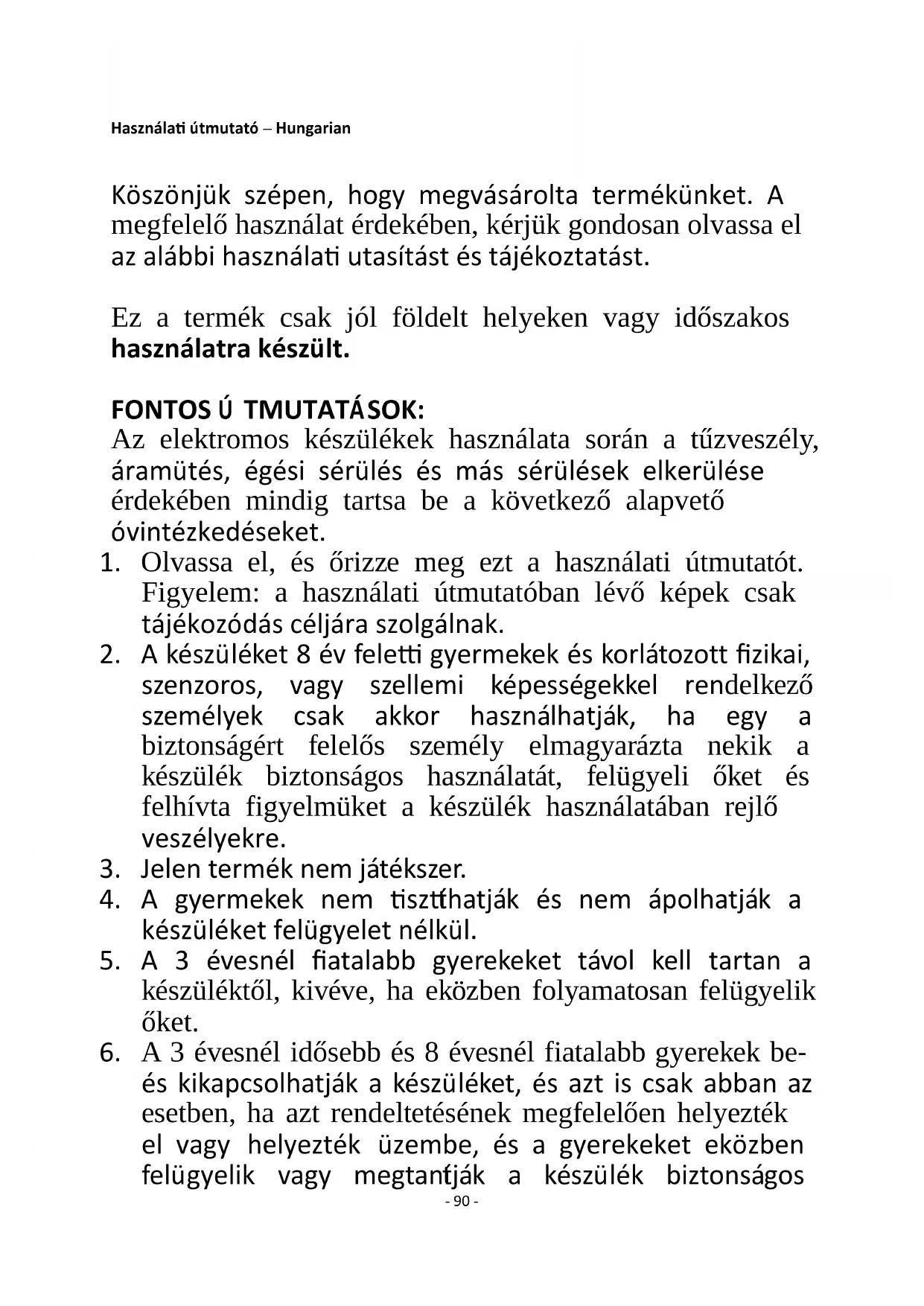 Zadovoljava zahtjeve direktive vijeća: PROPIS KOMISIJE (EU) br. 2015/1188 od 28. travnja 2015- dopuna PROPISA KOMISIJE (EU) 2016/2282 kojima se implementira direktiva 2009/125/EZ europskog parlamenta i komisije s obzirom na zahtjeve u pogledu ekodizajna za grijače lokalnog prostora Informacije za potrošače o načinu ugradnje, upotrebe i održavanja proizvoda, informacije o OEEO, potražite u priručniku s uputama koji ste dobili s pakiranjem.- 90 - Használati útmutató – Hungarian Köszönjük szépen, hogy megvásárolta termékünket. A megfelelő használat érdekében, kérjük gondosan olvassa el az alábbi használati utasítást és tájékoztatást. Ez a termék csak jól földelt helyeken vagy időszakos használatra készült. FONTOS Ú TMUTATÁSOK: Az elektromos készülékek használata során a tűzveszély, áramütés, égési sérülés és más sérülések elkerülése érdekében mindig tartsa be a következő alapvető óvintézkedéseket.