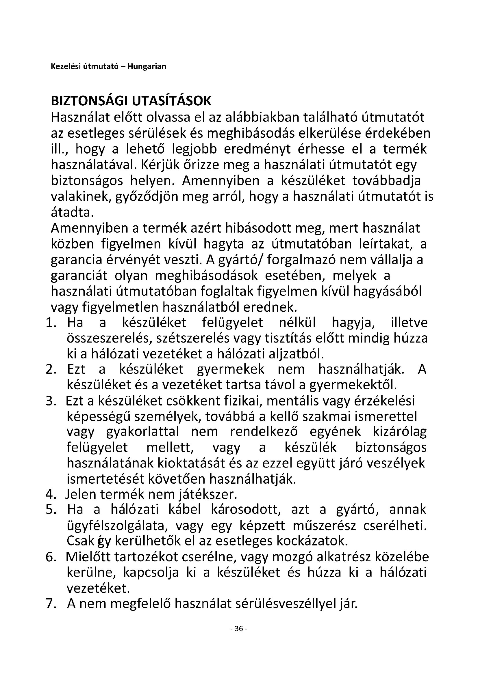 Használat előtt olvassa el az alábbiakban található útmutatót az esetleges sérülések és meghibásodás elkerülése érdekében ill., hogy a lehető legjobb eredményt érhesse el a termék használatával. Kérjük őrizze meg a használati útmutatót egy biztonságos helyen. Amennyiben a készüléket továbbadja valakinek, győződjön meg arról, hogy a használati útmutatót is átadta. Amennyiben a termék azért hibásodott meg, mert használat közben figyelmen kívül hagyta az útmutatóban leírtakat, a garancia érvényét veszti. A gyártó/ forgalmazó nem vállalja a garanciát olyan meghibásodások esetében, melyek a használati útmutatóban foglaltak figyelmen kívül hagyásából vagy figyelmetlen használatból erednek.