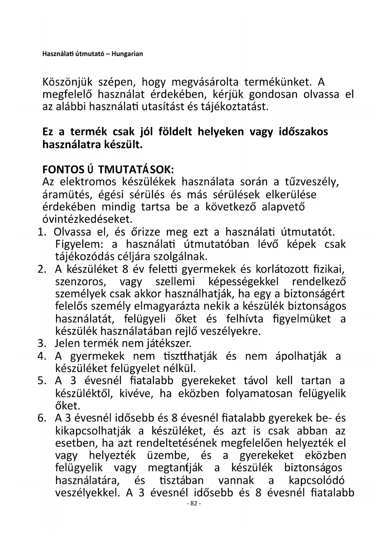Zadovoljava zahtjeve direktive vijeća: PROPIS KOMISIJE (EU) br. 2015/1188 od 28. travnja 2015- dopuna PROPISA KOMISIJE (EU) 2016/2282 kojima se implementira direktiva 2009/125/EZ europskog parlamenta i komisije s obzirom na zahtjeve u pogledu ekodizajna za grijače lokalnog prostora Informacije za potrošače o načinu ugradnje, upotrebe i održavanja proizvoda, informacije o OEEO, potražite u priručniku s uputama koji ste dobili s pakiranjem.- 82 - Használati útmutató – Hungarian Köszönjük szépen, hogy megvásárolta termékünket. A megfelelő használat érdekében, kérjük gondosan olvassa el az alábbi használati utasítást és tájékoztatást. Ez a termék csak jól földelt helyeken vagy időszakos használatra készült. FONTOS Ú TMUTATÁSOK: Az elektromos készülékek használata során a tűzveszély, áramütés, égési sérülés és más sérülések elkerülése érdekében mindig tartsa be a következő alapvető óvintézkedéseket.