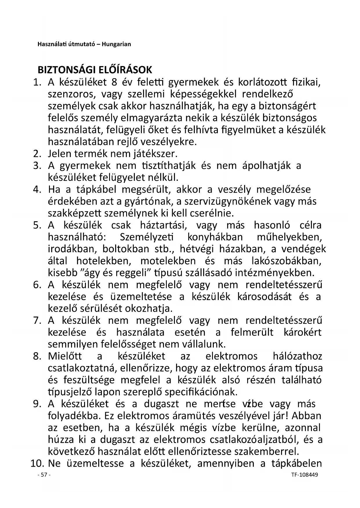 10. Ne üzemeltesse a készüléket, amennyiben a tápkábelen- 58 - TF-108449