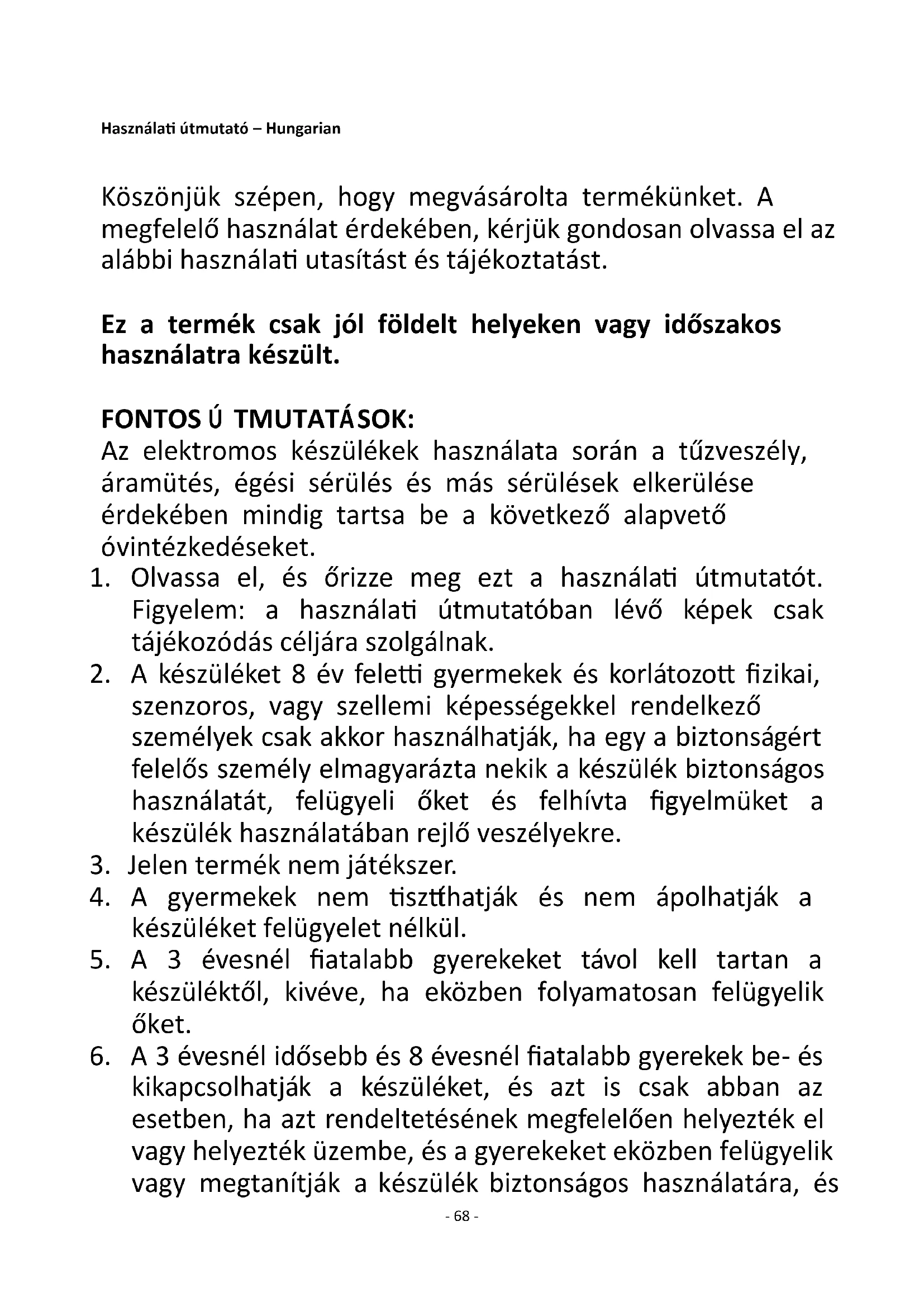 Zadovoljava zahtjeve direktive vijeća: PROPIS KOMISIJE (EU) br. 2015/1188 od 28. travnja 2015- dopuna PROPISA KOMISIJE (EU) 2016/2282 kojima se implementira direktiva 2009/125/EZ europskog parlamenta i komisije s obzirom na zahtjeve u pogledu ekodizajna za grijače lokalnog prostora Informacije za potrošače o načinu ugradnje, upotrebe i održavanja proizvoda, informacije o OEEO, potražite u priručniku s uputama koji ste dobili s pakiranjem.- 68 - Használati útmutató – Hungarian Köszönjük szépen, hogy megvásárolta termékünket. A megfelelő használat érdekében, kérjük gondosan olvassa el az alábbi használati utasítást és tájékoztatást. Ez a termék csak jól földelt helyeken vagy időszakos használatra készült. FONTOS Ú TMUTATÁSOK: Az elektromos készülékek használata során a tűzveszély, áramütés, égési sérülés és más sérülések elkerülése érdekében mindig tartsa be a következő alapvető óvintézkedéseket.