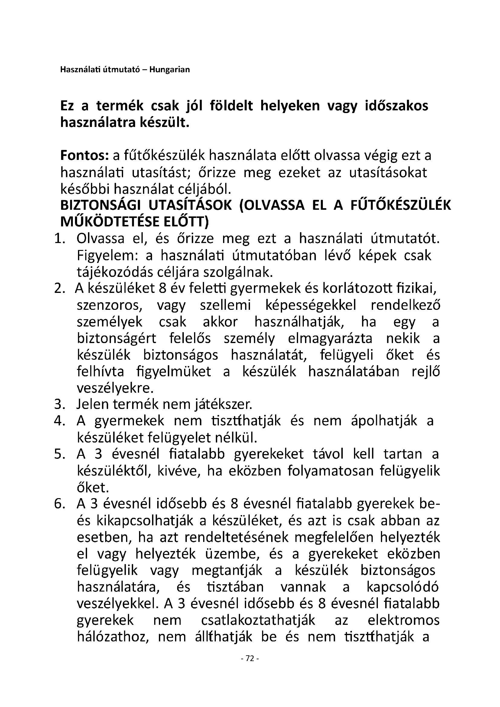 Zadovoljava zahtjeve direktive vijeća: PROPIS KOMISIJE (EU) br. 2015/1188 od 28. travnja 2015- dopuna PROPISA KOMISIJE (EU) 2016/2282 kojima se implementira direktiva 2009/125/EZ europskog parlamenta i komisije s obzirom na zahtjeve u pogledu ekodizajna za grijače lokalnog prostora Informacije za potrošače o načinu ugradnje, upotrebe i održavanja proizvoda, informacije o OEEO, potražite u priručniku s uputama koji ste dobili s pakiranjem.- 72 - Használati útmutató – Hungarian Ez a termék csak jól földelt helyeken vagy időszakos használatra készült. Fontos: a fűtőkészülék használata előtt olvassa végig ezt a használati utasítást; őrizze meg ezeket az utasításokat későbbi használat céljából. BIZTONSÁGI UTASÍTÁSOK (OLVASSA EL A FŰTŐKÉSZÜLÉK MŰKÖDTETÉSE ELŐTT)