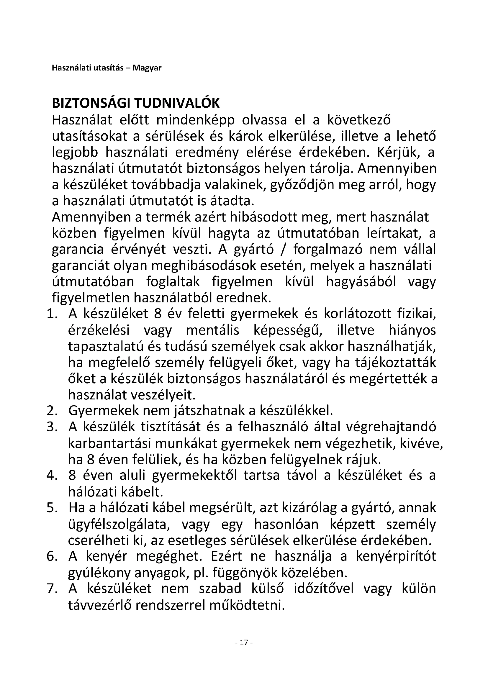 Használat előtt mindenképp olvassa el a következő utasításokat a sérülések és károk elkerülése, illetve a lehető legjobb használati eredmény elérése érdekében. Kérjük, a használati útmutatót biztonságos helyen tárolja. Amennyiben a készüléket továbbadja valakinek, győződjön meg arról, hogy a használati útmutatót is átadta. Amennyiben a termék azért hibásodott meg, mert használat közben figyelmen kívül hagyta az útmutatóban leírtakat, a garancia érvényét veszti. A gyártó / forgalmazó nem vállal garanciát olyan meghibásodások esetén, melyek a használati útmutatóban foglaltak figyelmen kívül hagyásából vagy figyelmetlen használatból erednek.