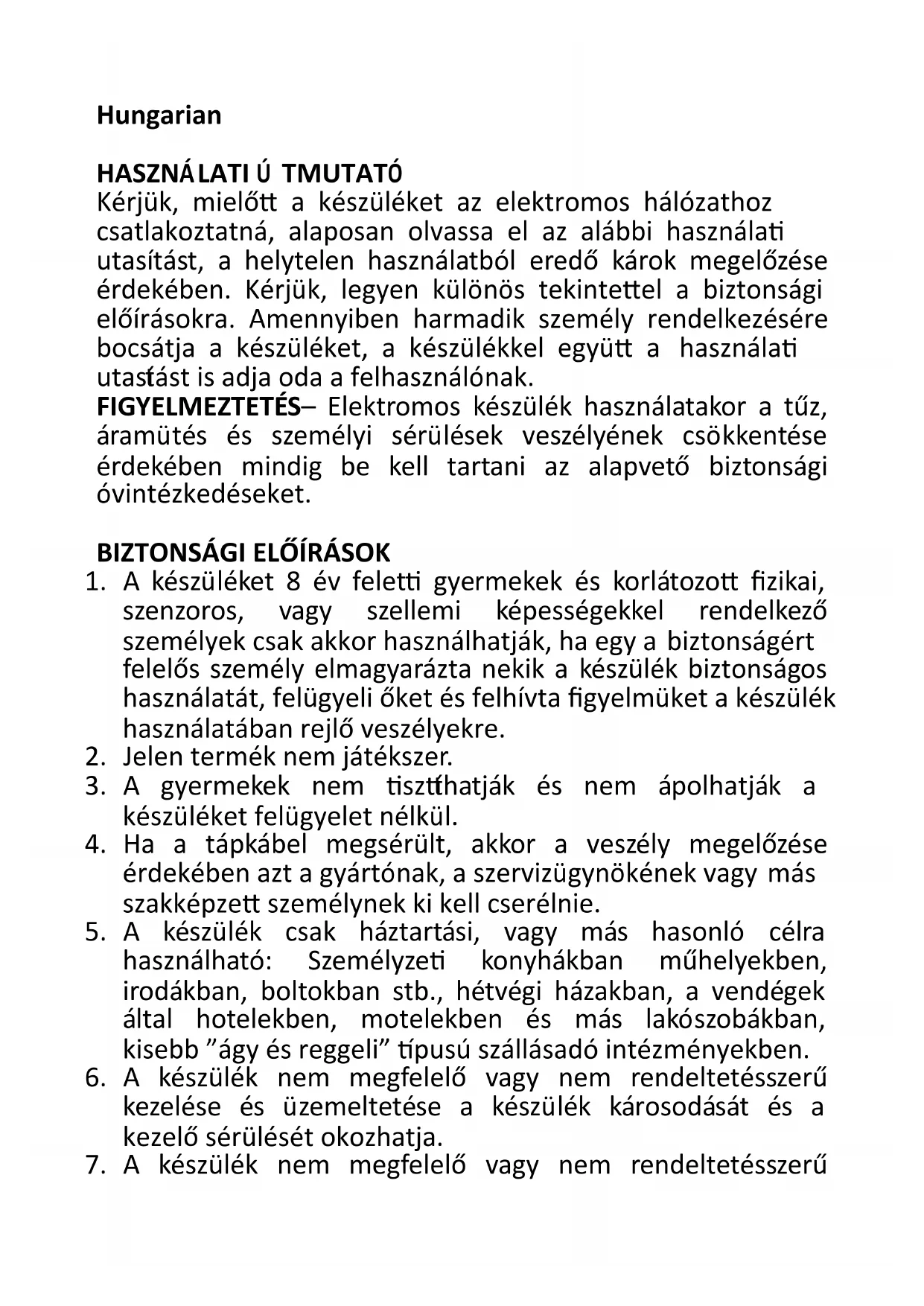 7. A készülék nem megfelelő vagy nem rendeltetésszerűkezelése és használata esetén a felmerült károkért