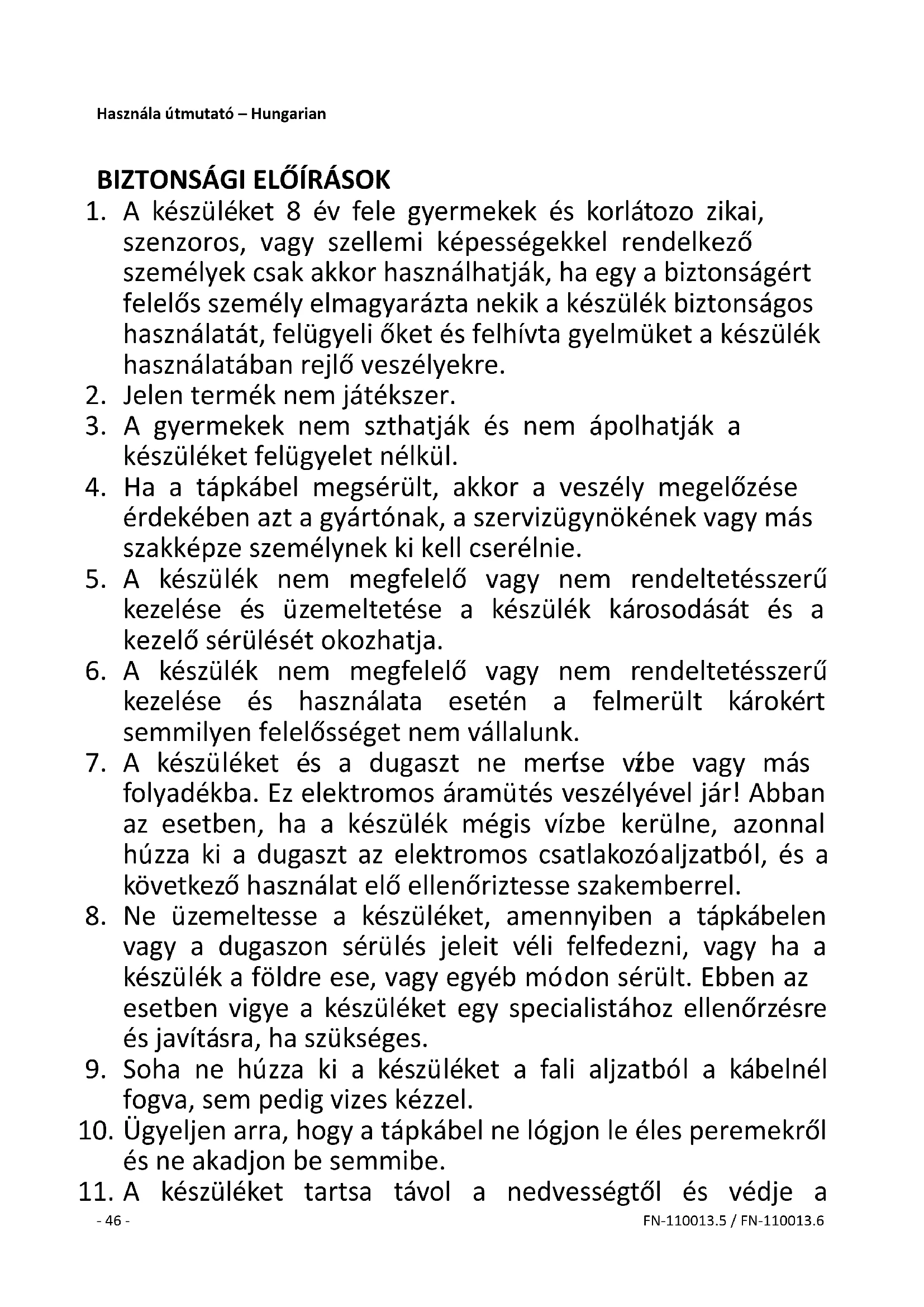 11. A készüléket tartsa távol a nedvességtől és védje a- 47 - FN-110013.5 / FN-110013.6
