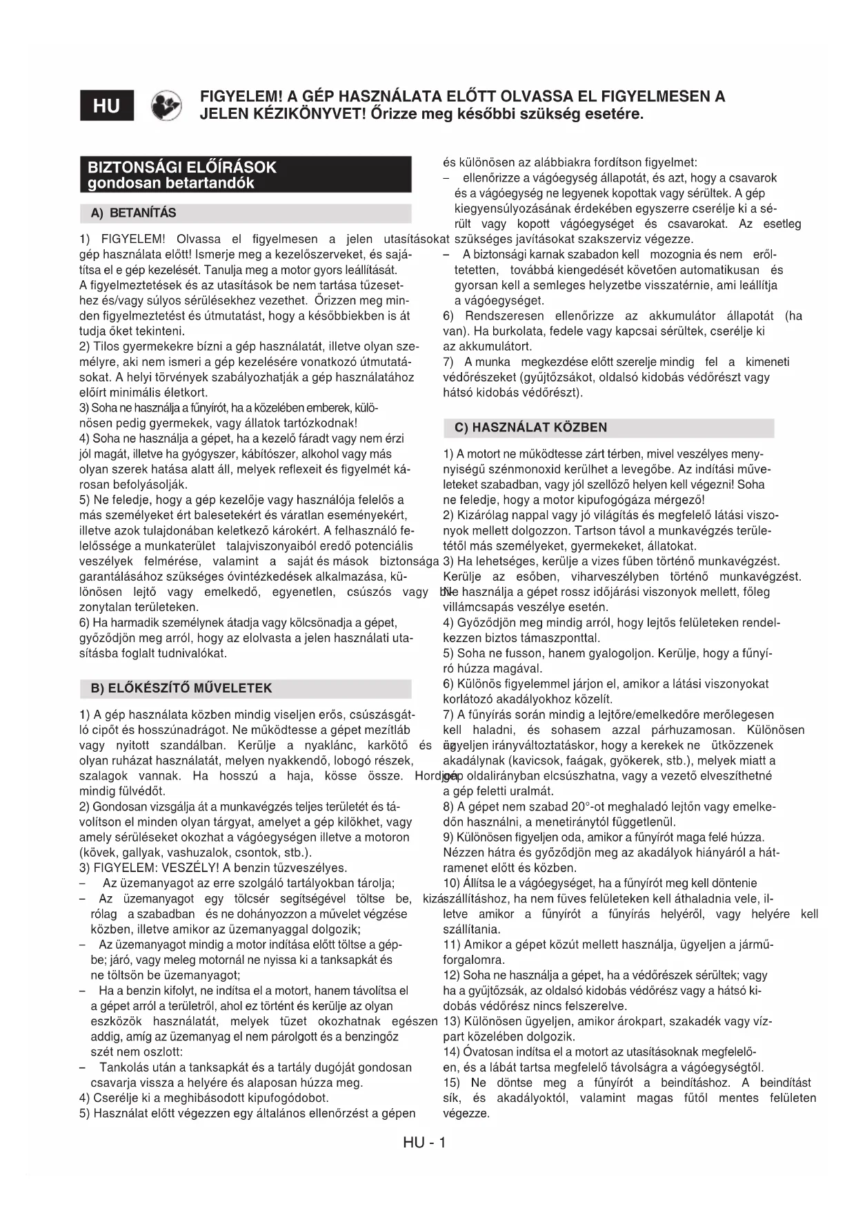 FIGYELEM! A GÉP HASZNÁLATA ELŐTT OLVASSA EL FIGYELMESEN A JELEN KÉZIKÖNYVET! Őrizze meg későbbi szükség esetére. és különösen az alábbiakra fordítson gyelmet: – ellenőrizze a vágóegység állapotát, és azt, hogy a csavarok és a vágóegység ne legyenek kopottak vagy sérültek. A gép kiegyensúlyozásának érdekében egyszerre cserélje ki a sé- rült vagy kopott vágóegységet és csavarokat. Az esetleg szükséges javításokat szakszerviz végezze. – A biztonsági karnak szabadon kell mozognia és nem eről- tetetten, továbbá kiengedését követően automatikusan és gyorsan kell a semleges helyzetbe visszatérnie, ami leállítja a vágóegységet. 6) Rendszeresen ellenőrizze az akkumulátor állapotát (ha van). Ha burkolata, fedele vagy kapcsai sérültek, cserélje ki az akkumulátort. 7) A munka megkezdése előtt szerelje mindig fel a kimeneti védőrészeket (gyűjtőzsákot, oldalsó kidobás védőrészt vagy hátsó kidobás védőrészt).