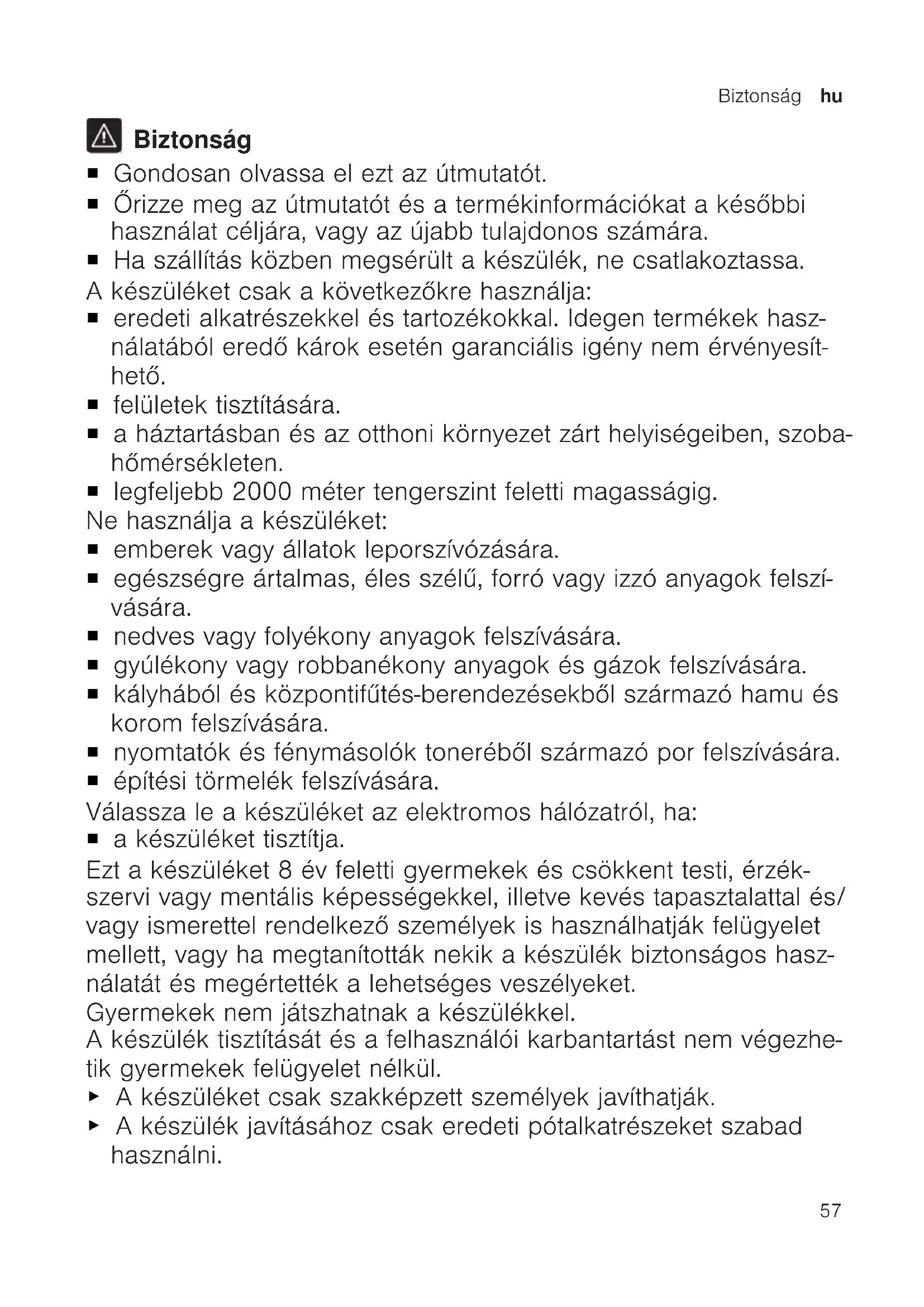 Biztonság ¡ Gondosan olvassa el ezt az útmutatót. ¡ Őrizze meg az útmutatót és a termékinformációkat a későbbi használat céljára, vagy az újabb tulajdonos számára. ¡ Ha szállítás közben megsérült a készülék, ne csatlakoztassa. A készüléket csak a következőkre használja: ¡ eredeti alkatrészekkel és tartozékokkal. Idegen termékek hasz- nálatából eredő károk esetén garanciális igény nem érvényesít- hető. ¡ felületek tisztítására. ¡ a háztartásban és az otthoni környezet zárt helyiségeiben, szoba- hőmérsékleten. ¡ legfeljebb 2000 méter tengerszint feletti magasságig. Ne használja a készüléket: ¡ emberek vagy állatok leporszívózására. ¡ egészségre ártalmas, éles szélű, forró vagy izzó anyagok felszí- vására. ¡ nedves vagy folyékony anyagok felszívására. ¡ gyúlékony vagy robbanékony anyagok és gázok felszívására. ¡ kályhából és központifűtés-berendezésekből származó hamu és korom felszívására. ¡ nyomtatók és fénymásolók toneréből származó por felszívására. ¡ építési törmelék felszívására. Válassza le a készüléket az elektromos hálózatról, ha: ¡ a készüléket tisztítja. Ezt a készüléket 8év feletti gyermekek és csökkent testi, érzék- szervi vagy mentális képességekkel, illetve kevés tapasztalattal és/ vagy ismerettel rendelkező személyek is használhatják felügyelet mellett, vagy ha megtanították nekik a készülék biztonságos hasz- nálatát és megértették a lehetséges veszélyeket. Gyermekek nem játszhatnak a készülékkel. A készülék tisztítását és a felhasználói karbantartást nem végezhe- tik gyermekek felügyelet nélkül. ▶ A készüléket csak szakképzett személyek javíthatják. ▶ A készülék javításához csak eredeti pótalkatrészeket szabad használni.hu Biztonság
