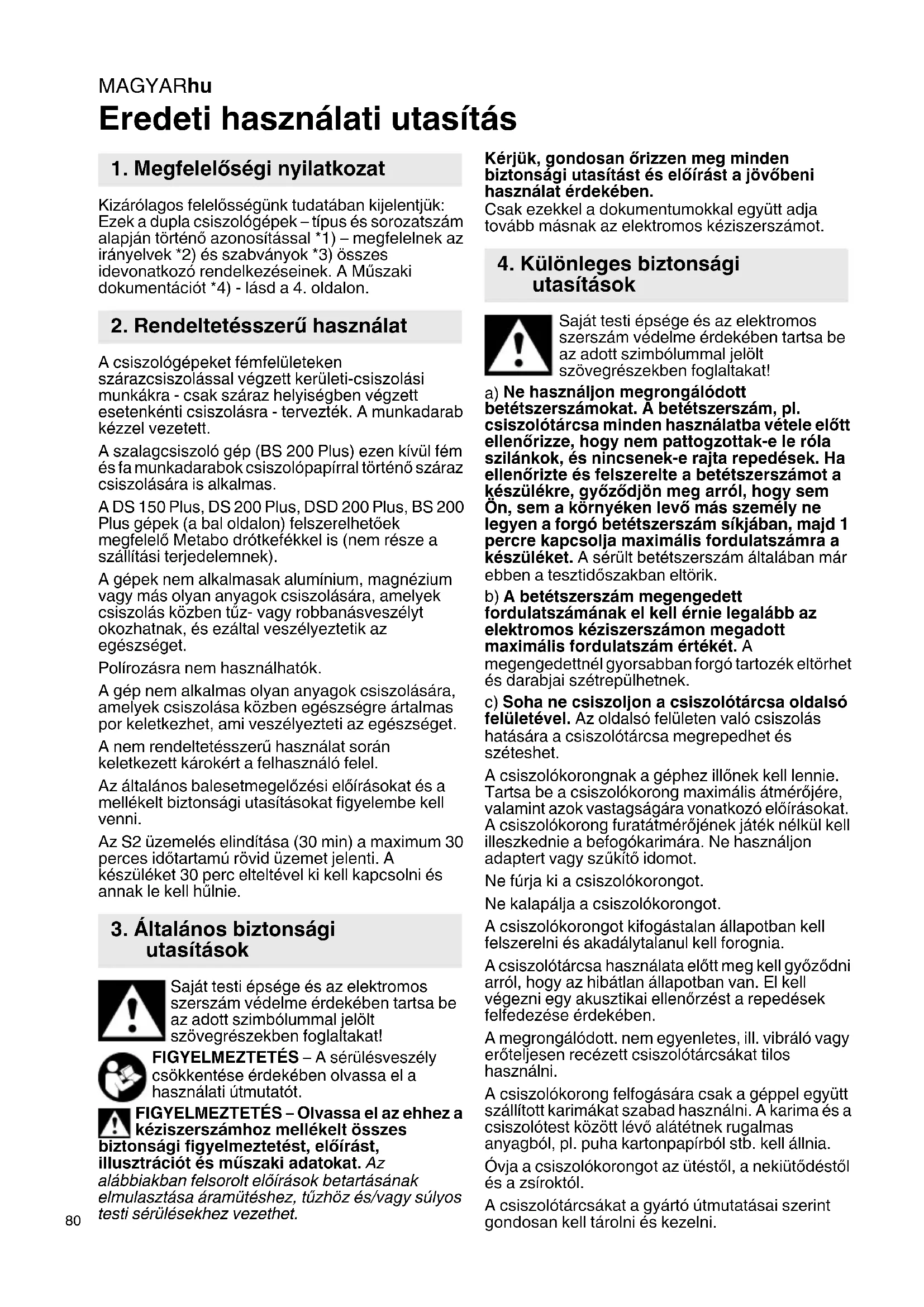 Eredeti használati utasítás Kizárólagos felelősségünk tudatában kijelentjük: Ezek a dupla csiszológépek – típus és sorozatszám alapján történő azonosítással *1) – megfelelnek az irányelvek *2) és szabványok *3) összes idevonatkozó rendelkezéseinek. A Műszaki dokumentációt *4) - lásd a 4. oldalon. A csiszológépeket fémfelületeken szárazcsiszolással végzett kerületi-csiszolási munkákra - csak száraz helyiségben végzett esetenkénti csiszolásra - tervezték. A munkadarab kézzel vezetett. A szalagcsiszoló gép (BS 200 Plus) ezen kívül fém és fa munkadarabok csiszolópapírral történő száraz csiszolására is alkalmas. A DS 150 Plus, DS 200 Plus, DSD 200 Plus, BS 200 Plus gépek (a bal oldalon) felszerelhetőek megfelelő Metabo drótkefékkel is (nem része a szállítási terjedelemnek). A gépek nem alkalmasak alumínium, magnézium vagy más olyan anyagok csiszolására, amelyek csiszolás közben tűz- vagy robbanásveszélyt okozhatnak, és ezáltal veszélyeztetik az egészséget. Polírozásra nem használhatók. A gép nem alkalmas olyan anyagok csiszolására, amelyek csiszolása közben egészségre ártalmas por keletkezhet, ami veszélyezteti az egészséget. A nem rendeltetésszerű használat során keletkezett károkért a felhasználó felel. Az általános balesetmegelőzési előírásokat és a mellékelt biztonsági utasításokat figyelembe kell venni. Az S2 üzemelés elindítása (30 min) a maximum 30 perces időtartamú rövid üzemet jelenti. A készüléket 30 perc elteltével ki kell kapcsolni és annak le kell hűlnie. Saját testi épsége és az elektromos szerszám védelme érdekében tartsa be az adott szimbólummal jelölt szövegrészekben foglaltakat! FIGYELMEZTETÉS – A sérülésveszély csökkentése érdekében olvassa el a használati útmutatót. FIGYELMEZTETÉS – Olvassa el az ehhez a kéziszerszámhoz mellékelt összes biztonsági figyelmeztetést, előírást, illusztrációt és műszaki adatokat. Az alábbiakban felsorolt előírások betartásának elmulasztása áramütéshez, tűzhöz és/vagy súlyos testi sérülésekhez vezethet. Kérjük, gondosan őrizzen meg minden biztonsági utasítást és előírást a jövőbeni használat érdekében. Csak ezekkel a dokumentumokkal együtt adja tovább másnak az elektromos kéziszerszámot. Saját testi épsége és az elektromos szerszám védelme érdekében tartsa be az adott szimbólummal jelölt szövegrészekben foglaltakat!