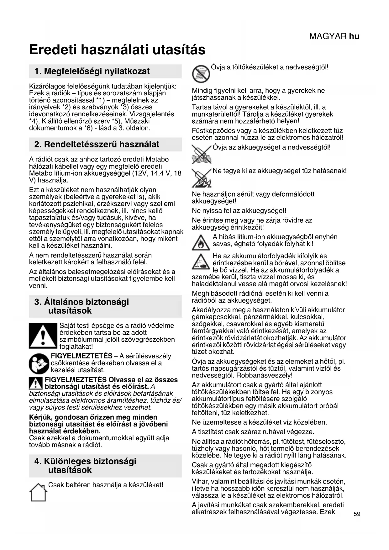 Csak eredeti Metabo akkuegységeket és tartozékokat használjon. Csak olyan tartozékokat használjon, amelyek megfelelnek a jelen használati utasításban megadott követelményeknek és adatoknak. A teljes tartozékprogram megtalálható a www.metabo.com honlapon vagy a katalógusban. A rádión való javításokat csak elektromos szakember végezheti el! Ha a készülék tápegysége megsérül, azt a veszélyeztetés elkerülése érdekében csak eredeti Metabo pótalkatrészre szabad kicserélni. A javításra szoruló Metabo rádiókkal, kérjük, forduljon Metabo szakkereskedőjéhez. A címeket a www.metabo.com honlapon találja. A pótalkatrészek listája letölthető a www.metabo.com honlapról. Kövesse a régi gépek, csomagolások és tartozékok környezetbarát ártalmatlanítására és újrahasznosítására vonatkozó helyi előírásokat. Ne dobja az akkuegységet a háztartási szemétbe! Juttassa vissza a sérült vagy elhasználódott akkuegységet a Metabo kereskedőknek! Ne dobja vízbe az akkuegységet! Csak az EU tagországok esetében: soha ne dobjon elektromos kéziszerszámot háztar- tási hulladék közé! A 2012/19/EU sz., a régi elektromos és elektronikus berendezésekről és annak nemzeti jogba való átvételéről szóló Európai Irányelvnek megfelelően a használt elektromos szerszámokat külön kell gyűjteni és környezetbarát újrahasznosításba kell helyezni. A hulladékeltávolítás előtt működtesse a készüléket az akkuegység teljes lemerüléséig. Biztosítsa az érintkezők rövidzárlat elleni védelmét (pl. ragasztó- szalaggal). Az adatok értelmezését lásd a 3. oldalon. A műszaki változtatás joga a továbbfejlesztés érdekében fenntartva. FM (UKW) = URH vevő tartomány AM (MW) = KH vevő tartomány