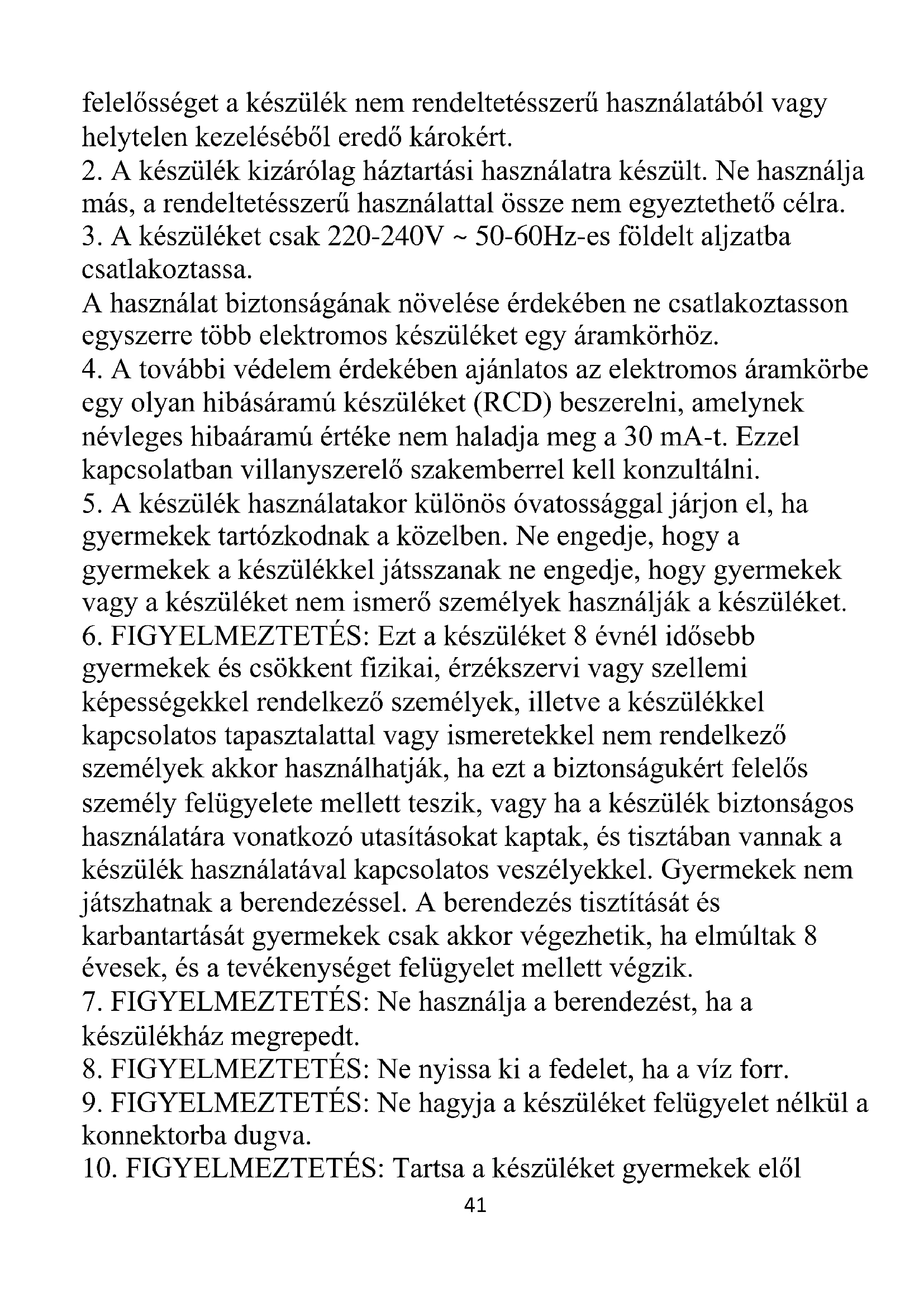 gyermekek és csökkent fizikai, érzékszervi vagy szellemi képességekkel rendelkező személyek, illetve a készülékkel kapcsolatos tapasztalattal vagy ismeretekkel nem rendelkező személyek akkor használhatják, ha ezt a biztonságukért felelős személy felügyelete mellett teszik, vagy ha a készülék biztonságos használatára vonatkozó utasításokat kaptak, és tisztában vannak a készülék használatával kapcsolatos veszélyekkel. Gyermekek nem játszhatnak a berendezéssel. A berendezés tisztítását és karbantartását gyermekek csak akkor végezhetik, ha elmúltak 8 évesek, és a tevékenységet felügyelet mellett végzik.