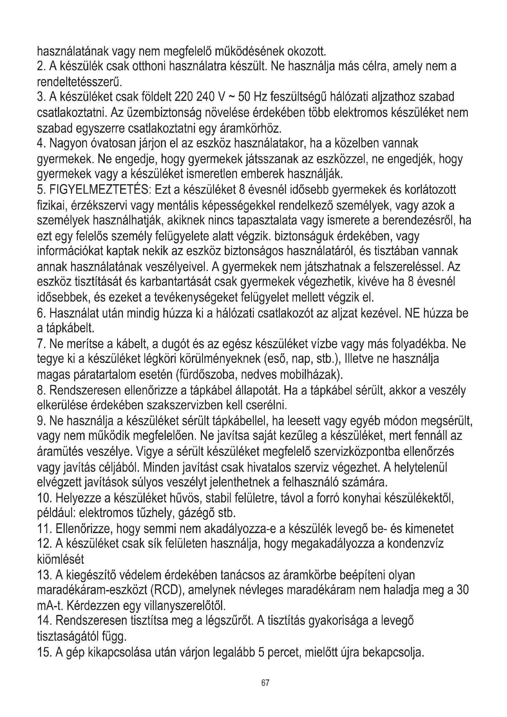fizikai, érzékszervi vagy mentális képességekkel rendelkező személyek, vagy azok a személyek használhatják, akiknek nincs tapasztalata vagy ismerete a berendezésről, ha ezt egy felelős személy felügyelete alatt végzik. biztonságuk érdekében, vagy információkat kaptak nekik az eszköz biztonságos használatáról, és tisztában vannak annak használatának veszélyeivel. A gyermekek nem játszhatnak a felszereléssel. Az eszköz tisztítását és karbantartását csak gyermekek végezhetik, kivéve ha 8 évesnél idősebbek, és ezeket a tevékenységeket felügyelet mellett végzik el.