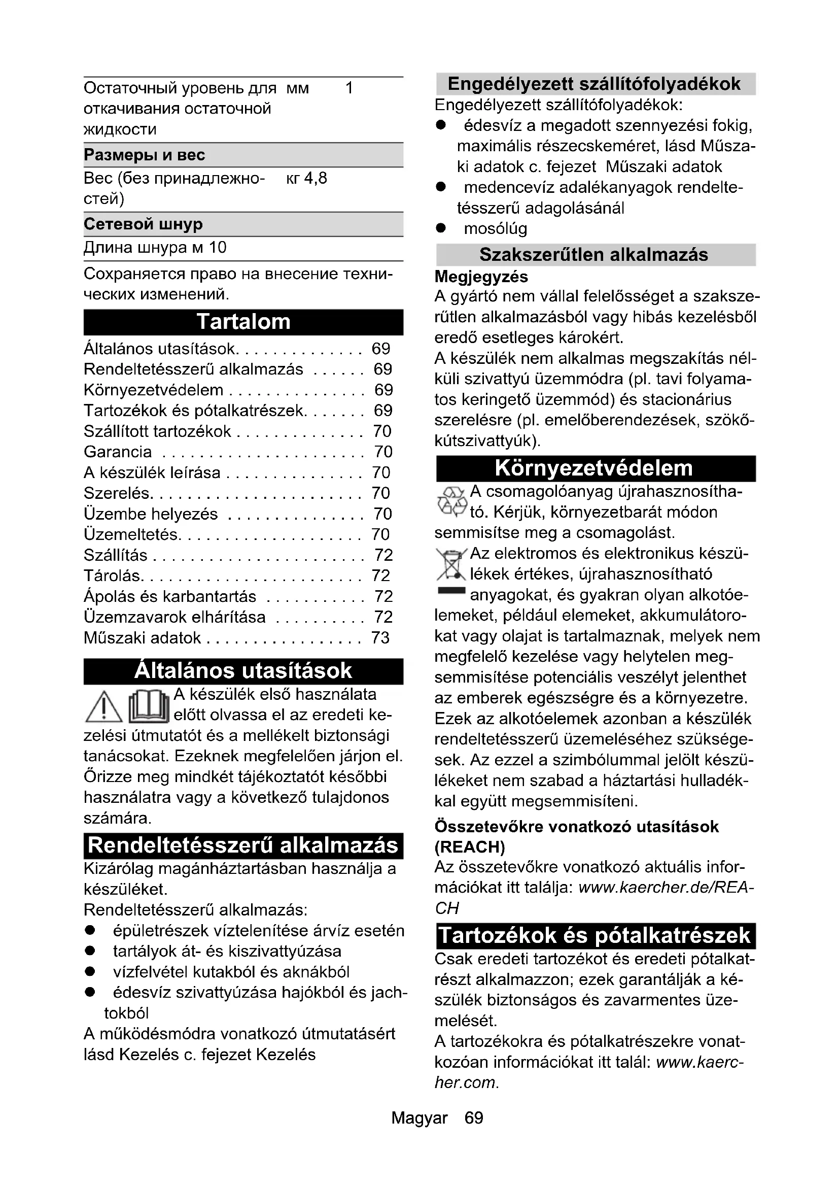 мм 25 Минимальной уровень для откачивания оста- точной жидкости мм 40Magyar 69 Сохраняется право на внесение техни- ческих изменений. Tartalom Általános utasítások A készülék első használata előtt olvassa el az eredeti ke- zelési útmutatót és a mellékelt biztonsági tanácsokat. Ezeknek megfelelően járjon el. Őrizze meg mindkét tájékoztatót későbbi használatra vagy a következő tulajdonos számára. Rendeltetésszerű alkalmazás Kizárólag magánháztartásban használja a készüléket. Rendeltetésszerű alkalmazás: épületrészek víztelenítése árvíz esetén tartályok át- és kiszivattyúzása vízfelvétel kutakból és aknákból édesvíz szivattyúzása hajókból és jach- tokból A működésmódra vonatkozó útmutatásért lásd Kezelés c. fejezet Kezelés Engedélyezett szállítófolyadékok Engedélyezett szállítófolyadékok: édesvíz a megadott szennyezési fokig, maximális részecskeméret, lásd Műsza- ki adatok c. fejezet Műszaki adatok medencevíz adalékanyagok rendelte- tésszerű adagolásánál mosólúg Szakszerűtlen alkalmazás Megjegyzés A gyártó nem vállal felelősséget a szaksze- rűtlen alkalmazásból vagy hibás kezelésből eredő esetleges károkért. A készülék nem alkalmas megszakítás nél- küli szivattyú üzemmódra (pl. tavi folyama- tos keringető üzemmód) és stacionárius szerelésre (pl. emelőberendezések, szökő- kútszivattyúk). Környezetvédelem A csomagolóanyag újrahasznosítha- tó. Kérjük, környezetbarát módon semmisítse meg a csomagolást. Az elektromos és elektronikus készü- lékek értékes, újrahasznosítható anyagokat, és gyakran olyan alkotóe- lemeket, például elemeket, akkumulátoro- kat vagy olajat is tartalmaznak, melyek nem megfelelő kezelése vagy helytelen meg- semmisítése potenciális veszélyt jelenthet az emberek egészségre és a környezetre. Ezek az alkotóelemek azonban a készülék rendeltetésszerű üzemeléséhez szüksége- sek. Az ezzel a szimbólummal jelölt készü- lékeket nem szabad a háztartási hulladék- kal együtt megsemmisíteni. Összetevőkre vonatkozó utasítások (REACH) Az összetevőkre vonatkozó aktuális infor- mációkat itt találja: www.kaercher.de/REA-