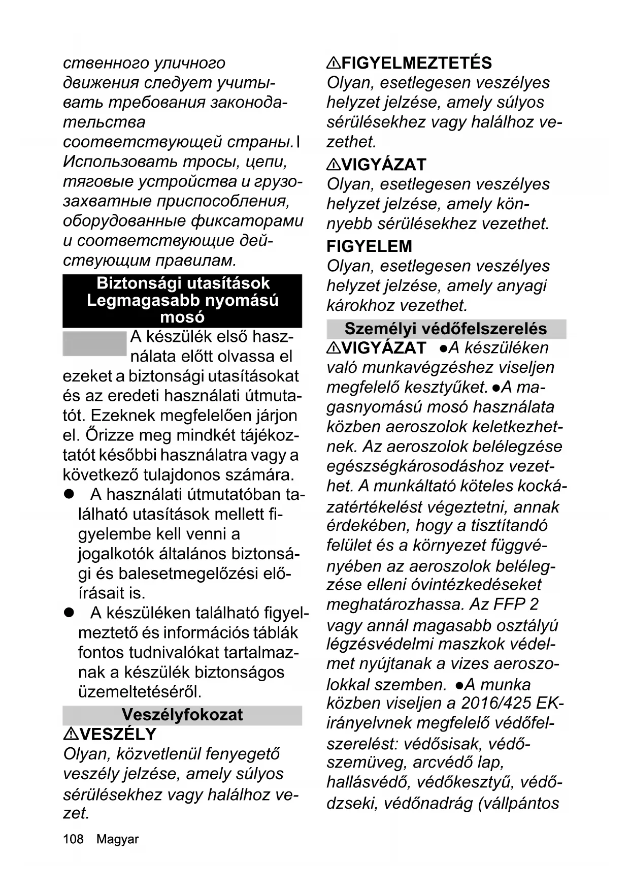 Использовать тросы, цепи, тяговые устройства и грузо- захватные приспособления, оборудованные фиксаторами и соответствующие дей- ствующим правилам. Biztonsági utasítások Legmagasabb nyomású mosó A készülék első hasz- nálata előtt olvassa el ezeket a biztonsági utasításokat és az eredeti használati útmuta- tót. Ezeknek megfelelően járjon el. Őrizze meg mindkét tájékoz- tatót későbbi használatra vagy a következő tulajdonos számára. A használati útmutatóban ta- lálható utasítások mellett fi- gyelembe kell venni a jogalkotók általános biztonsá- gi és balesetmegelőzési elő- írásait is. A készüléken található figyel- meztető és információs táblák fontos tudnivalókat tartalmaz- nak a készülék biztonságos üzemeltetéséről. Veszélyfokozat VESZÉLY Olyan, közvetlenül fenyegető veszély jelzése, amely súlyos sérülésekhez vagy halálhoz ve- zet. 몇 FIGYELMEZTETÉS Olyan, esetlegesen veszélyes helyzet jelzése, amely súlyos sérülésekhez vagy halálhoz ve- zethet. 몇 VIGYÁZAT Olyan, esetlegesen veszélyes helyzet jelzése, amely kön- nyebb sérülésekhez vezethet. FIGYELEM Olyan, esetlegesen veszélyes helyzet jelzése, amely anyagi károkhoz vezethet. Személyi védőfelszerelés 몇 VIGYÁZAT A készüléken való munkavégzéshez viseljen megfelelő kesztyűket. A ma- gasnyomású mosó használata közben aeroszolok keletkezhet- nek. Az aeroszolok belélegzése egészségkárosodáshoz vezet- het. A munkáltató köteles kocká- zatértékelést végeztetni, annak érdekében, hogy a tisztítandó felület és a környezet függvé- nyében az aeroszolok beléleg- zése elleni óvintézkedéseket meghatározhassa. Az FFP 2 vagy annál magasabb osztályú légzésvédelmi maszkok védel- met nyújtanak a vizes aeroszo- lokkal szemben. A munka közben viseljen a 2016/425 EK- irányelvnek megfelelő védőfel- szerelést: védősisak, védő- szemüveg, arcvédő lap, hallásvédő, védőkesztyű, védő- dzseki, védőnadrág (vállpántosMagyar 109 védőnadrág), védőcsizma. A vé- dőruha csak a kifröccsenő vízzel és a kipattanó részekkel szem- ben nyújt védelmet. A magas- nyomású sugárral való közvetlen érintkezés ellen nem nyújt elegendő védelmet. Általános biztonsági utasítások VESZÉLY Fulladásveszély! Tartsa távol a gyermekektől a csomagolást! 몇 FIGYELMEZTETÉS Csak rendeltetésszerűen használja a készüléket. Vegye figyelembe a helyi adottságokat, és a készü- lékkel való munkavégzés során ügyeljen a harmadik személyek, különösen a gyerekek biztonsá- gára. Ez a készülék nem csök- kent fizikai, érzékelési vagy szellemi képességű személyek, illetve tapasztalattal és/vagy is- meretekkel nem rendelkező személyek általi használatra szolgál. A készüléket csak olyan személyek használhatják, akikkel ismertették annak keze- lését, vagy igazolták, hogy ren- delkeznek az annak kezeléséhez szükséges ismere- tekkel, és kifejezetten megbíz- ták őket a készülék használatával. Felügyelje a gyerekeket, és biztosítsa, hogy ne játszhassanak a készülékkel. l Gyermekek és fiatalkorúak nem használhatják a készülé- ket. 몇 VIGYÁZAT A biztonsági be- rendezések az Ön védelmét szolgálják. A biztonsági beren- dezéseket ne módosítsa és ne mellőzze használatukat! Áramütésveszély VESZÉLY Az I. érintésvé- delmi osztályba sorolt készülé- keket csak megfelelő földeléssel ellátott áramforráshoz csatla- koztassa! A típustáblán sze- replő feszültségnek meg kell egyeznie az áramforrás feszült- ségével. Szállítás és tárolás közben vegye figyelembe a ké- szülék súlyát, lásd a használati útmutatóban a Műszaki adatok című fejezetet. Csak hibaá- ram-védőkapocslóval (maxi- mum 30 mA áramerősségen) üzemeltesse a készüléket. A készüléket egy dugó segítségé- vel csatlakoztassa a hálózathoz. Az elektromos hálózatról nem leválasztható csatlakozó felsze- relése tilos. A dugó a hálózatról történő leválasztáshoz szüksé- ges. Soha ne fogja meg a háló- zati dugót vagy az aljzatot nedves kézzel. A hálózati csat- lakozónak és a hosszabbítóká- bel csatlakozó aljzatának víztömörnek kell lennie és azok nem érhetnek bele a vízbe. A csatlakozó aljzat nem fekhet a padlón. Használjon kábeldobot, amely biztosítja, hogy a csatla- kozódugók legalább 60 mm fe-110 Magyar lett legyenek a padlótól. A munkaterület minden, áramot vezető részének védve kell len- nie a vízsugártól. Kizárólag fröcskölő víz elleni védelemmel ellátott, a használati utasításban megadott minimális keresztmet- szetnek megfelelő hosszabbító kábelt használjon. Akadályozza meg, hogy a csatlakozás vízben feküdjön. Ne tisztítsa a készü- léket magasnyomású vagy ala- csonynyomású vízsugárral. 몇 FIGYELMEZTETÉS Csak olyan elektromos csatlakozásra csatlakoztassa a készüléket, amelyet villamos szakember alakított ki IEC 60364-1 szab- ványnak megfelelően. Minden használat előtt ellenőrizze, hogy a hálózati kábel és a hálózati csatlakozó nem károsodott-e. Ha a hálózati kábel károsodott, ne használja a készüléket! A ká- rosodott hálózati kábelt hala- déktalanul cseréltesse ki az ügyfélszolgálaton keresztül / vagy villamos szakemberrel. Ne menjen át a hálózati kábelen és a hosszabbítókábelen, illetve ne hagyja beszorulni és megtör- ni őket stb., mivel megsérülhet- nek, illetve károsodhatnak. Védje a hálózati kábelt a hőtől, olajtól és az élektől. Csak a gyártó által előírt hálózati csatla- kozó vezetéket alkalmazza, ez a vezeték cseréje esetén is alkal- mas. A rendelésszámot és tí- pust lásd a használati utasításban. A nem megfelelő e