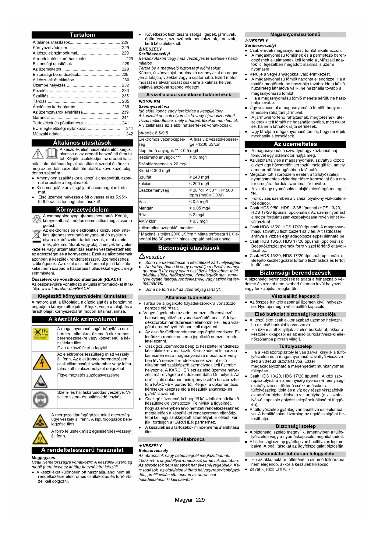 - Környezetvédelem A csomagolóanyag újrahasznosítható. Kérjük, környezetbarát módon semmisítse meg a csoma- golást. Az elektromos és elektronikus készülékek érté- kes újrahasznosítható anyagokat és gyakran olyan alkatrészeket tartalmaznak, mint az ele- mek, akkumulátorok vagy olaj, amelyek helytelen kezelés vagy ártalmatlanítás esetén veszélyeztethetik az egészséget és a környezetet. Ezek az alkotóelemek azonban a készülék rendeltetésszerű üzemeléséhez szükségesek. Az ezzel a szimbólummal jelölt készülé- keket nem szabad a háztartási hulladékkal együtt meg- semmisíteni. Összetevőkre vonatkozó utasítások (REACH) Az összetevőkre vonatkozó aktuális információkat itt ta- lálja: www.kaercher.de/REACH Kiegészítő környezetvédelmi útmutatás A motorolajat, a fűtőolajat, a dízelolajat és a benzint ne engedje a környezetbe jutni. Kérjük, védje a talajt, és a fáradt olajat környezetbarát módon ártalmatlanítsa. A készülék szimbólumai A rendeltetésszerű használat Megjegyzés Csak Németországra vonatkozik: A készülék kizárólag mobil (nem helyhez kötött) használatra készült. ● A készüléket különösen ott használja, ahol nem áll rendelkezésre elektromos csatlakozás és forró víz- zel kell dolgozni. ● Következők tisztítására szolgál: gépek, járművek, építmények, szerszámok, homlokzatok, teraszok, kerti készülékek stb. VESZÉLY Sérülésveszély! Benzinkutakon vagy más veszélyes területeken hasz- nálatos Tartsa be a megfelelő biztonsági előírásokat. Kérem, ásványolajat tartalmazó szennyvizet ne enged- jen a talajba, vizekbe vagy a csatornába. Ezért motor- mosást és alvázmosást csak erre alkalmas helyen, olajleválasztóval szabad végezni A vízellátásra vonatkozó határértékek FIGYELEM Szennyezett víz Idő előtti kopás vagy lerakódás a készülékben A készüléket csak olyan tiszta vagy újrahasznosított vízzel működtesse, mely a határértékeket nem lépi át. A vízellátásra az alábbi határértékek vonatkoznak: Biztonsági utasítások VESZÉLY ● Soha ne üzemeltesse a készüléket zárt helyiségben. ● Ne tartsa, öntse ki vagy használja a dízelüzemanya- got nyitott tűz vagy olyan eszközök közelében, mint például sütők, fűtőkazánok, vízmelegítők stb., ame- lyek gyújtó lánggal rendelkeznek, vagy szikrákat ter- melhetnek. ● Soha ne töltse túl az üzemanyag tartályt. Általános tudnivalók ● Tartsa be a jogalkotó folyadékszórókra vonatkozó nemzeti előírásait. ● Vegye figyelembe az adott nemzeti törvényhozó balesetmegelőzésre vonatkozó előírásait. A folya- dékszórókat rendszeresen ellenőrizni kell, és a vizs- gálat eredményét írásban kell rögzíteni. ● Az eszköz fűtőberendezése egy égési rendszer. El- lenőrizze rendszeresen a jogalkotó nemzeti rende- letei szerint. ● Csak gőz üzemmódú beépítő készlettel rendelkező készülékekre vonatkozik: Kereskedelmi felhaszná- lás esetén ezt a magasnyomású mosót az érvény- ben lévő nemzeti rendelkezések szerint első alkalommal szakképzett személynek kell üzembe helyeznie. A KÄRCHER ezt az első üzembe helye- zést már elvégezte és dokumentálta Ön helyett. Az erről szóló dokumentáció igény esetén beszerezhe- tő a KÄRCHER partnertől. Kérjük, a dokumentáció kérésekor készítse elő a készülék alkatrész- és gyártási számát. ● Csak gőz üzemmódú beépítő készlettel rendelkező készülékekre vonatkozik: Felhívjuk a figyelmét, hogy az érvényben lévő nemzeti rendelkezéseknek megfelelően a készüléket rendszeresen ellenőriz- tetni kell egy szakképzett személlyel. E célból, kér- jük, forduljon a KÄRCHER partnerhez. ● A készülék és a tartozékok mindennemű átalakítása tilos. Kerékabroncs VESZÉLY Balesetveszély Az abroncsok nagy sebességnél meglazulhatnak. 100 km/h-s engedéllyel rendelkező járművek esetében: Az abroncsok nem lehetnek hat évesnél régebbiek. Ká- rosodások, az oldalfalon látható hólyag-/repedésképző- dés, profilleválás stb. esetén az abroncsot haladéktalanul ki kell cserélni. Magasnyomású tömlő VESZÉLY Sérülésveszély! ● Csak eredeti magasnyomású tömlőt alkalmazzon. ● A magasnyomású tömlőnek és a permetező beren- dezésnek alkalmasnak kell lennie a „Műszaki ada- tok” c. fejezetben megadott maximális üzemi nyomásra. ● Kerülje a vegyi anyagokkal való érintkezést. ● A magasnyomású tömlőt naponta ellenőrizze. Ha a tömlők megtörtek, ne használja tovább. Ha a külső huzalréteg láthatóvá válik, ne használja tovább a magasnyomású tömlőt. ● Ha a magasnyomású tömlő menete sérült, ne hasz- nálja tovább. ● Úgy vezesse el a magasnyomású tömlőt, hogy ne lehessen ráhajtani járművel. ● A járművel történő ráhajtásnak, megtörésnek, üté- seknek kitett tömlőt ne használja tovább, még akkor se, ha nem láthatók rajta sérülések. ● Úgy tárolja a magasnyomású tömlőt, hogy ne érjék mechanikus terhelések. Az üzemeltetés ● A magasnyomású szivattyút egy közbenső haj- tóművel egy dízelmotor hajtja meg. ● Az úszótartály és a magasnyomású szivattyú között a vizet egy hőcserélőn keresztül melegíti fel, amely a motor hűtőkeringésében található. ● Megszakított szóróüzem esetén a túlfolyószelep nyomásmentes vízkeringetésre kapcsol át és a mo- tor üresjárat fordulatszámmal jár tovább. ● A vizet egy nyomásoldali olajtüzelésű égő melegíti fel. ● Forróvizes üzemben a vízhez folyékony vízkőtelení- tőt adagol. ● Csak HDS 9/50, HDS 13/35 típusnál (HDS 13/20, HDS 17/20 típusnál opcionális): Az üzemi nyomást a motor fordulatszám-szabályozása révén lehet ki- választani. ● Csak HDS 13/20, HDS 17/20 típusnál: A magasnyo- mású szivattyú