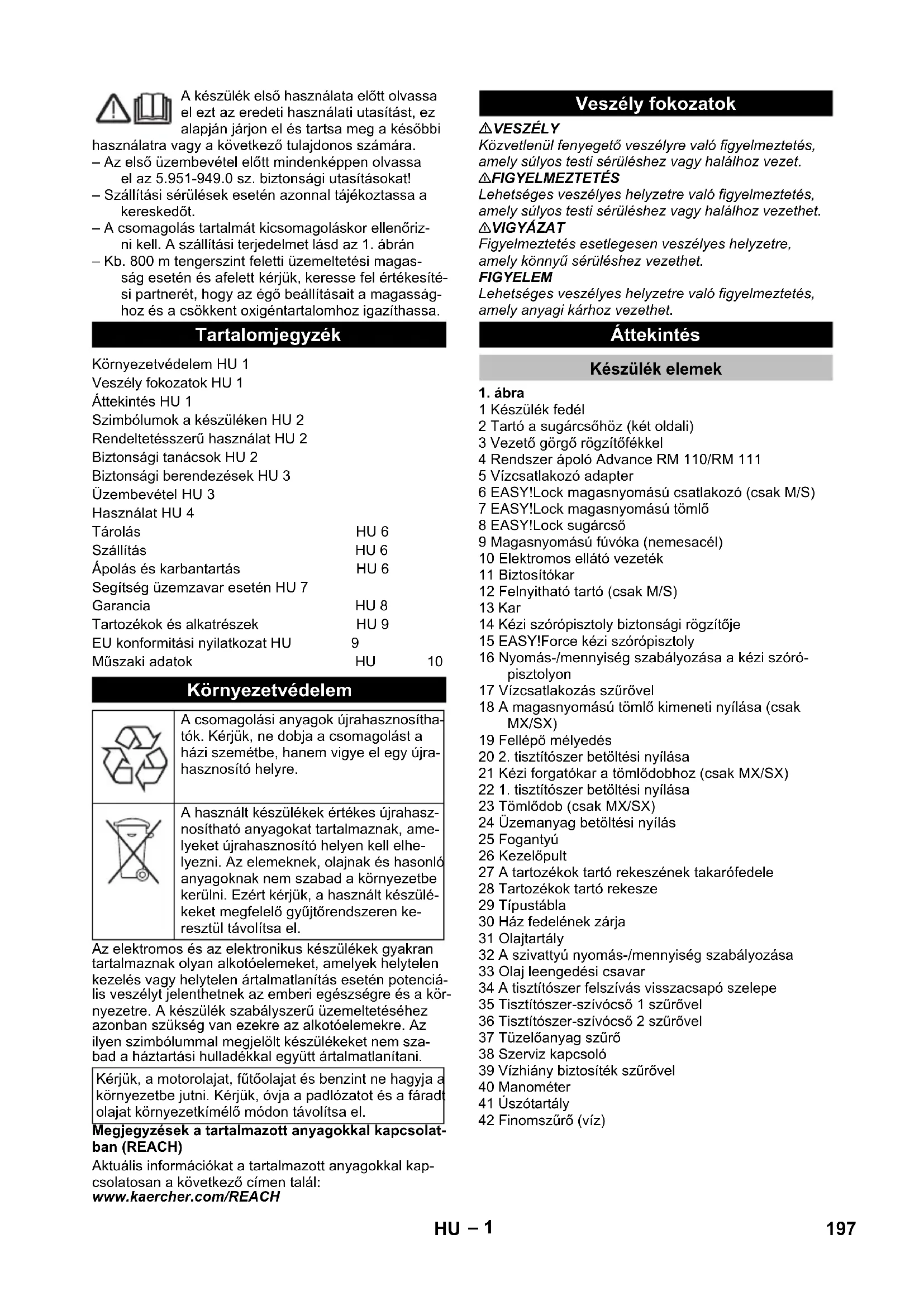 1 Készülék fedél 2 Tartó a sugárcsőhöz (két oldali) 3 Vezető görgő rögzítőfékkel 4 Rendszer ápoló Advance RM 110/RM 111 5 Vízcsatlakozó adapter 6 EASY!Lock magasnyomású csatlakozó (csak M/S) 7 EASY!Lock magasnyomású tömlő 8 EASY!Lock sugárcső 9 Magasnyomású fúvóka (nemesacél) 10 Elektromos ellátó vezeték 11 Biztosítókar 12 Felnyitható tartó (csak M/S) 13 Kar 14 Kézi szórópisztoly biztonsági rögzítője 15 EASY!Force kézi szórópisztoly 16 Nyomás-/mennyiség szabályozása a kézi szóró- pisztolyon 17 Vízcsatlakozás szűrővel 18 A magasnyomású tömlő kimeneti nyílása (csak MX/SX) 19 Fellépő mélyedés 20 2. tisztítószer betöltési nyílása 21 Kézi forgatókar a tömlődobhoz (csak MX/SX) 22 1. tisztítószer betöltési nyílása 23 Tömlődob (csak MX/SX) 24 Üzemanyag betöltési nyílás 25 Fogantyú 26 Kezelőpult 27 A tartozékok tartó rekeszének takarófedele 28 Tartozékok tartó rekesze 29 Típustábla 30 Ház fedelének zárja 31 Olajtartály 32 A szivattyú nyomás-/mennyiség szabályozása 33 Olaj leengedési csavar 34 A tisztítószer felszívás visszacsapó szelepe 35 Tisztítószer-szívócső 1 szűrővel 36 Tisztítószer-szívócső 2 szűrővel 37 Tüzelőanyag szűrő 38 Szerviz kapcsoló 39 Vízhiány biztosíték szűrővel 40 Manométer 41 Úszótartály 42 Finomszűrő (víz) Tartalomjegyzék Környezetvédelem HU 1 Veszély fokozatok HU 1 Áttekintés HU 1 Szimbólumok a készüléken HU 2 Rendeltetésszerű használat HU 2 Biztonsági tanácsok HU 2 Biztonsági berendezések HU 3 Üzembevétel HU 3 Használat HU 4 Tárolás HU 6 Szállítás HU 6 Ápolás és karbantartás HU 6 Segítség üzemzavar esetén HU 7 Garancia HU 8 Tartozékok és alkatrészek HU 9 EU konformitási nyilatkozat HU 9 Műszaki adatok HU 10 Környezetvédelem A csomagolási anyagok újrahasznosítha- tók. Kérjük, ne dobja a csomagolást a házi szemétbe, hanem vigye el egy újra- hasznosító helyre. A használt készülékek értékes újrahasz- nosítható anyagokat tartalmaznak, ame- lyeket újrahasznosító helyen kell elhe- lyezni. Az elemeknek, olajnak és hasonló anyagoknak nem szabad a környezetbe kerülni. Ezért kérjük, a használt készülé- keket megfelelő gyűjtőrendszeren ke- resztül távolítsa el. Kérjük, a motorolajat, fűtőolajat és benzint ne hagyja a környezetbe jutni. Kérjük, óvja a padlózatot és a fáradt olajat környezetkímélő módon távolítsa el. Veszély fokozatok Áttekintés Készülék elemek 197HU– 2