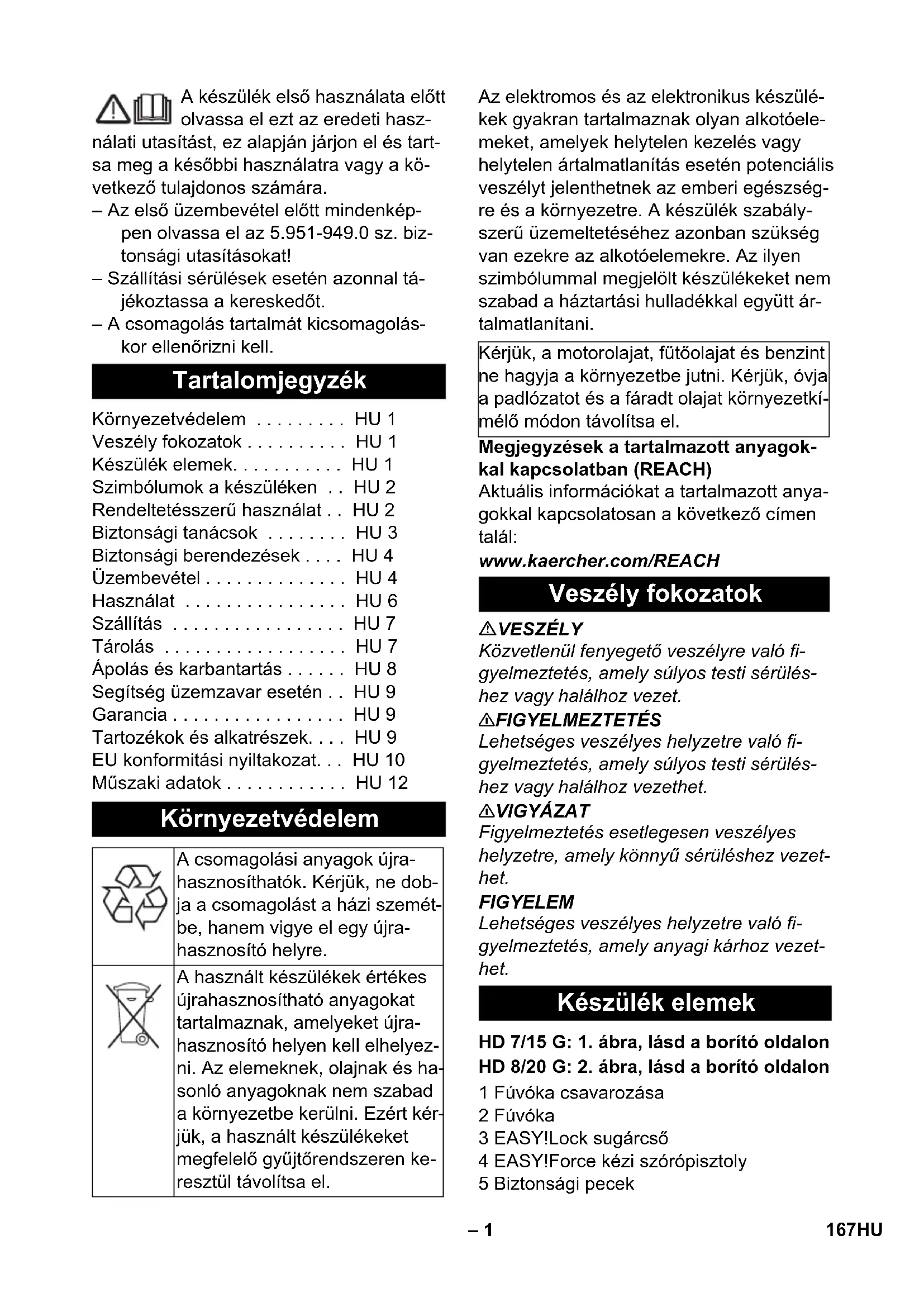 0,6 0,7 166 RU– 1 A készülék első használata előtt olvassa el ezt az eredeti hasz- nálati utasítást, ez alapján járjon el és tart- sa meg a későbbi használatra vagy a kö- vetkező tulajdonos számára. – Az első üzembevétel előtt mindenkép- pen olvassa el az 5.951-949.0 sz. biz- tonsági utasításokat! – Szállítási sérülések esetén azonnal tá- jékoztassa a kereskedőt. – A csomagolás tartalmát kicsomagolás- kor ellenőrizni kell. Az elektromos és az elektronikus készülé- kek gyakran tartalmaznak olyan alkotóele- meket, amelyek helytelen kezelés vagy helytelen ártalmatlanítás esetén potenciális veszélyt jelenthetnek az emberi egészség- re és a környezetre. A készülék szabály- szerű üzemeltetéséhez azonban szükség van ezekre az alkotóelemekre. Az ilyen szimbólummal megjelölt készülékeket nem szabad a háztartási hulladékkal együtt ár- talmatlanítani. Megjegyzések a tartalmazott anyagok- kal kapcsolatban (REACH) Aktuális információkat a tartalmazott anya- gokkal kapcsolatosan a következő címen talál: www.kaercher.com/REACH VESZÉLY Közvetlenül fenyegető veszélyre való fi- gyelmeztetés, amely súlyos testi sérülés- hez vagy halálhoz vezet. 몇 FIGYELMEZTETÉS Lehetséges veszélyes helyzetre való fi- gyelmeztetés, amely súlyos testi sérülés- hez vagy halálhoz vezethet. 몇 VIGYÁZAT Figyelmeztetés esetlegesen veszélyes helyzetre, amely könnyű sérüléshez vezet- het. FIGYELEM Lehetséges veszélyes helyzetre való fi- gyelmeztetés, amely anyagi kárhoz vezet- het. 1 Fúvóka csavarozása 2 Fúvóka 3 EASY!Lock sugárcső 4 EASY!Force kézi szórópisztoly 5 Biztonsági pecek Tartalomjegyzék Környezetvédelem . . . . . . . . . HU 1 Veszély fokozatok . . . . . . . . . . HU 1 Készülék elemek. . . . . . . . . . . HU 1 Szimbólumok a készüléken . . HU 2 Rendeltetésszerű használat . . HU 2 Biztonsági tanácsok . . . . . . . . HU 3 Biztonsági berendezések . . . . HU 4 Üzembevétel . . . . . . . . . . . . . . HU 4 Használat . . . . . . . . . . . . . . . . HU 6 Szállítás . . . . . . . . . . . . . . . . . HU 7 Tárolás . . . . . . . . . . . . . . . . . . HU 7 Ápolás és karbantartás . . . . . . HU 8 Segítség üzemzavar esetén . . HU 9 Garancia . . . . . . . . . . . . . . . . . HU 9 Tartozékok és alkatrészek. . . . HU 9 EU konformitási nyiltakozat. . . HU 10 Műszaki adatok . . . . . . . . . . . . HU 12 Környezetvédelem A csomagolási anyagok újra- hasznosíthatók. Kérjük, ne dob- ja a csomagolást a házi szemét- be, hanem vigye el egy újra- hasznosító helyre. A használt készülékek értékes újrahasznosítható anyagokat tartalmaznak, amelyeket újra- hasznosító helyen kell elhelyez- ni. Az elemeknek, olajnak és ha- sonló anyagoknak nem szabad a környezetbe kerülni. Ezért kér- jük, a használt készülékeket megfelelő gyűjtőrendszeren ke- resztül távolítsa el. Kérjük, a motorolajat, fűtőolajat és benzint ne hagyja a környezetbe jutni. Kérjük, óvja a padlózatot és a fáradt olajat környezetkí- mélő módon távolítsa el. Veszély fokozatok Készülék elemek HD 7/15 G: 1. ábra, lásd a borító oldalon HD 8/20 G: 2. ábra, lásd a borító oldalon 167HU– 2 6 Kar 7 Biztosítókar 8 EASY!Lock magasnyomású tömlő 9 Olajtartály 10 Nyomásmérő * 11 Üzemanyag csap 12 Kézi indítási berendezés 13 Olajleeresztő csavar (Motor) 14 Szórófej tartó egy szórófej tárolására 15 Vízszűrő 16 Tisztítószer szívótömlő állítható szűrő- vel (adagolószelep) 17 Vízcsatlakozás 18 Szivattyú olajleeresztő csavarja 19 EASY!Lock magasnyomású csatlakozó 20 Olajfigyelő ablak * 21 Nyomás/mennyiség szabályozása * 22 Sugárcső tartó 23 Nagynyomású szivattyú 24 Olajmérő pálca (Motor) 25 Motor 26 Motorkapcsoló 27 Üzemanyag tartály 28 A tolókengyel csillagmarkolata 29 Kézi szórópisztoly tartója 30 Tömlő tartó 31 Tolókengyel A Hollandi anya B Szűrőtálca C O-gyűrű D Szűrőbetét