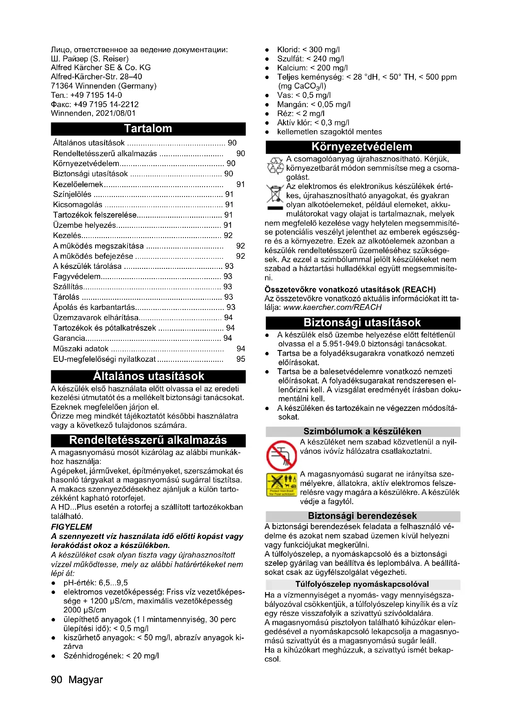 - /l) ● Vas: < 0,5 mg/l ● Mangán: < 0,05 mg/l ● Réz: < 2 mg/l ● Aktív klór: < 0,3 mg/l ● kellemetlen szagoktól mentes Környezetvédelem A csomagolóanyag újrahasznosítható. Kérjük, környezetbarát módon semmisítse meg a csoma- golást. Az elektromos és elektronikus készülékek érté- kes, újrahasznosítható anyagokat, és gyakran olyan alkotóelemeket, például elemeket, akku- mulátorokat vagy olajat is tartalmaznak, melyek nem megfelelő kezelése vagy helytelen megsemmisíté- se potenciális veszélyt jelenthet az emberek egészség- re és a környezetre. Ezek az alkotóelemek azonban a készülék rendeltetésszerű üzemeléséhez szüksége- sek. Az ezzel a szimbólummal jelölt készülékeket nem szabad a háztartási hulladékkal együtt megsemmisíte- ni. Összetevőkre vonatkozó utasítások (REACH) Az összetevőkre vonatkozó aktuális információkat itt ta- lálja: www.kaercher.com/REACH Biztonsági utasítások ● A készülék első üzembe helyezése előtt feltétlenül olvassa el a 5.951-949.0 biztonsági tanácsokat. ● Tartsa be a folyadéksugarakra vonatkozó nemzeti előírásokat. ● Tartsa be a balesetvédelemre vonatkozó nemzeti előírásokat. A folyadéksugarakat rendszeresen el- lenőrizni kell. A vizsgálat eredményét írásban doku- mentálni kell. ● A készüléken és tartozékain ne végezzen módosítá- sokat. Szimbólumok a készüléken A készüléket nem szabad közvetlenül a nyil- vános ivóvíz hálózatra csatlakoztatni. A magasnyomású sugarat ne irányítsa sze- mélyekre, állatokra, aktív elektromos felsze- relésre vagy magára a készülékre. A készülék védje a fagytól. Biztonsági berendezések A biztonsági berendezések feladata a felhasználó vé- delme és azokat nem szabad üzemen kívül helyezni vagy funkciójukat megkerülni. A túlfolyószelep, a nyomáskapcsoló és a biztonsági szelep gyárilag van beállítva és leplombálva. A beállítá- sokat csak az ügyfélszolgálat végezheti. Túlfolyószelep nyomáskapcsolóval Ha a vízmennyiséget a nyomás- vagy mennyiségsza- bályozóval csökkentjük, a túlfolyószelep kinyílik és a víz egy része visszafolyik a szivattyú szívóoldalára. A magasnyomású pisztolyon található kihúzókar elen- gedésével a nyomáskapcsoló lekapcsolja a magasnyo- mású szivattyút és a magasnyomású sugár leáll. Ha a kihúzókart meghúzzuk, a szivattyú ismét bekap- csol. Általános utasítások p. 90