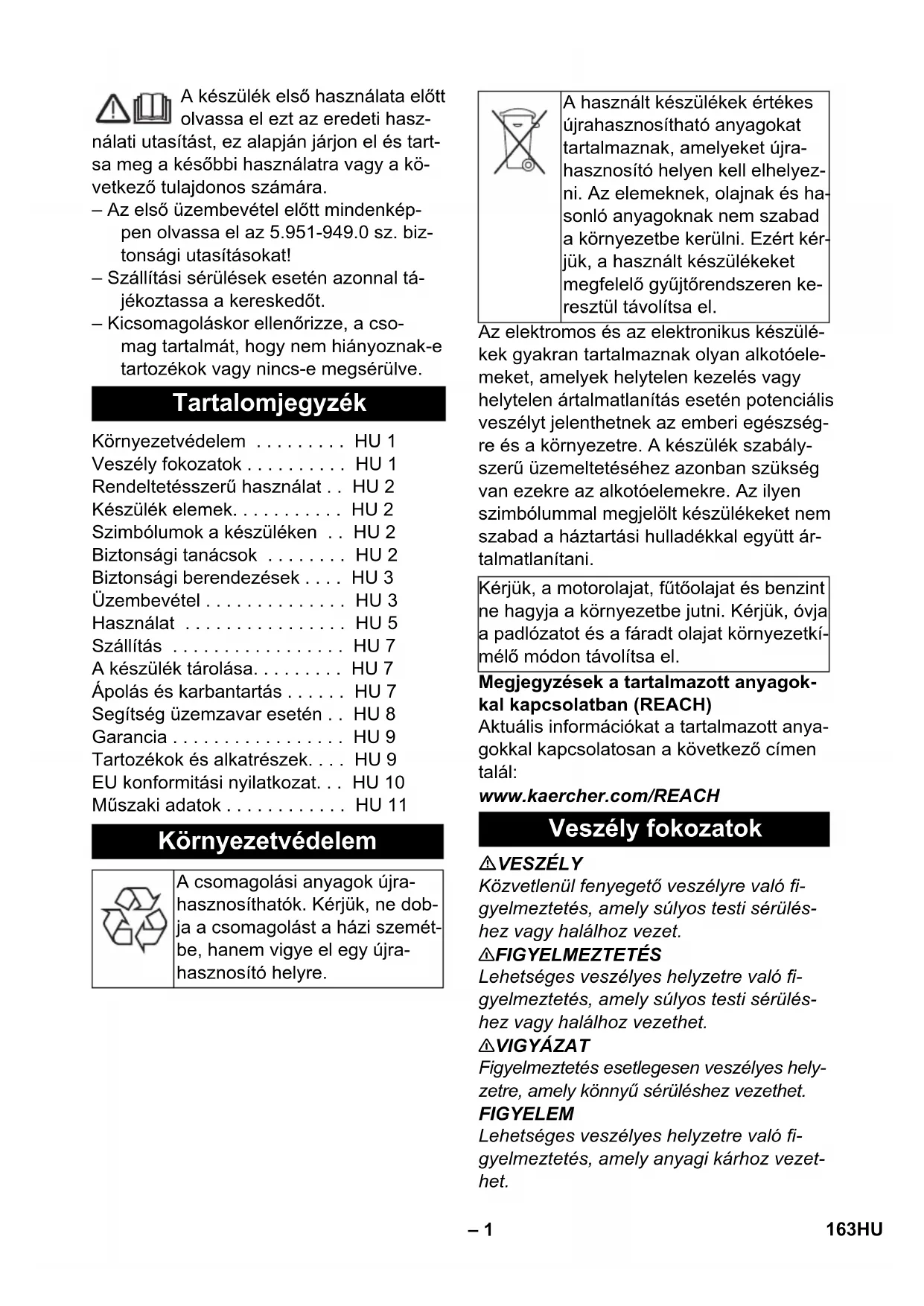 дБ(А) 93 97 96 162 RU– 1 A készülék első használata előtt olvassa el ezt az eredeti hasz- nálati utasítást, ez alapján járjon el és tart- sa meg a későbbi használatra vagy a kö- vetkező tulajdonos számára. – Az első üzembevétel előtt mindenkép- pen olvassa el az 5.951-949.0 sz. biz- tonsági utasításokat! – Szállítási sérülések esetén azonnal tá- jékoztassa a kereskedőt. – Kicsomagoláskor ellenőrizze, a cso- mag tartalmát, hogy nem hiányoznak-e tartozékok vagy nincs-e megsérülve. Az elektromos és az elektronikus készülé- kek gyakran tartalmaznak olyan alkotóele- meket, amelyek helytelen kezelés vagy helytelen ártalmatlanítás esetén potenciális veszélyt jelenthetnek az emberi egészség- re és a környezetre. A készülék szabály- szerű üzemeltetéséhez azonban szükség van ezekre az alkotóelemekre. Az ilyen szimbólummal megjelölt készülékeket nem szabad a háztartási hulladékkal együtt ár- talmatlanítani. Megjegyzések a tartalmazott anyagok- kal kapcsolatban (REACH) Aktuális információkat a tartalmazott anya- gokkal kapcsolatosan a következő címen talál: www.kaercher.com/REACH VESZÉLY Közvetlenül fenyegető veszélyre való fi- gyelmeztetés, amely súlyos testi sérülés- hez vagy halálhoz vezet. 몇 FIGYELMEZTETÉS Lehetséges veszélyes helyzetre való fi- gyelmeztetés, amely súlyos testi sérülés- hez vagy halálhoz vezethet. 몇 VIGYÁZAT Figyelmeztetés esetlegesen veszélyes hely- zetre, amely könnyű sérüléshez vezethet. FIGYELEM Lehetséges veszélyes helyzetre való fi- gyelmeztetés, amely anyagi kárhoz vezet- het. Tartalomjegyzék Környezetvédelem . . . . . . . . . HU 1 Veszély fokozatok . . . . . . . . . . HU 1 Rendeltetésszerű használat . . HU 2 Készülék elemek. . . . . . . . . . . HU 2 Szimbólumok a készüléken . . HU 2 Biztonsági tanácsok . . . . . . . . HU 2 Biztonsági berendezések . . . . HU 3 Üzembevétel . . . . . . . . . . . . . . HU 3 Használat . . . . . . . . . . . . . . . . HU 5 Szállítás . . . . . . . . . . . . . . . . . HU 7 A készülék tárolása. . . . . . . . . HU 7 Ápolás és karbantartás . . . . . . HU 7 Segítség üzemzavar esetén . . HU 8 Garancia . . . . . . . . . . . . . . . . . HU 9 Tartozékok és alkatrészek. . . . HU 9 EU konformitási nyilatkozat. . . HU 10 Műszaki adatok . . . . . . . . . . . . HU 11 Környezetvédelem A csomagolási anyagok újra- hasznosíthatók. Kérjük, ne dob- ja a csomagolást a házi szemét- be, hanem vigye el egy újra- hasznosító helyre. A használt készülékek értékes újrahasznosítható anyagokat tartalmaznak, amelyeket újra- hasznosító helyen kell elhelyez- ni. Az elemeknek, olajnak és ha- sonló anyagoknak nem szabad a környezetbe kerülni. Ezért kér- jük, a használt készülékeket megfelelő gyűjtőrendszeren ke- resztül távolítsa el. Kérjük, a motorolajat, fűtőolajat és benzint ne hagyja a környezetbe jutni. Kérjük, óvja a padlózatot és a fáradt olajat környezetkí- mélő módon távolítsa el. Veszély fokozatok 163HU– 2 Ez a magasnyomású tisztítóberendezés ki- zárólag a következőkre használható: – gépek, járművek, építmények, szerszá- mok tisztítására. – a Kärcher által jóváhagyott tartozékok- kal és alkatrészekkel. Az ábrához lásd a 2. oldalt. 1 EASY!Force kézi szórópisztoly 2 Biztonsági pecek 3 Kar 4 Biztosítókar 5 Forgó csőbilincs (a HD 16/15-4 Cage esetén nem) 6 EASY!Lock magasnyomású tömlő 7 Üzemóra-számláló (opcióként) 8 Sugárcső tartó 9 Tolókengyel 10 Tömlő-/kábel tartó 11 Készülékkapcsoló 12 Dugó 13 Üzemállapot / üzemzavar kontroll lám-