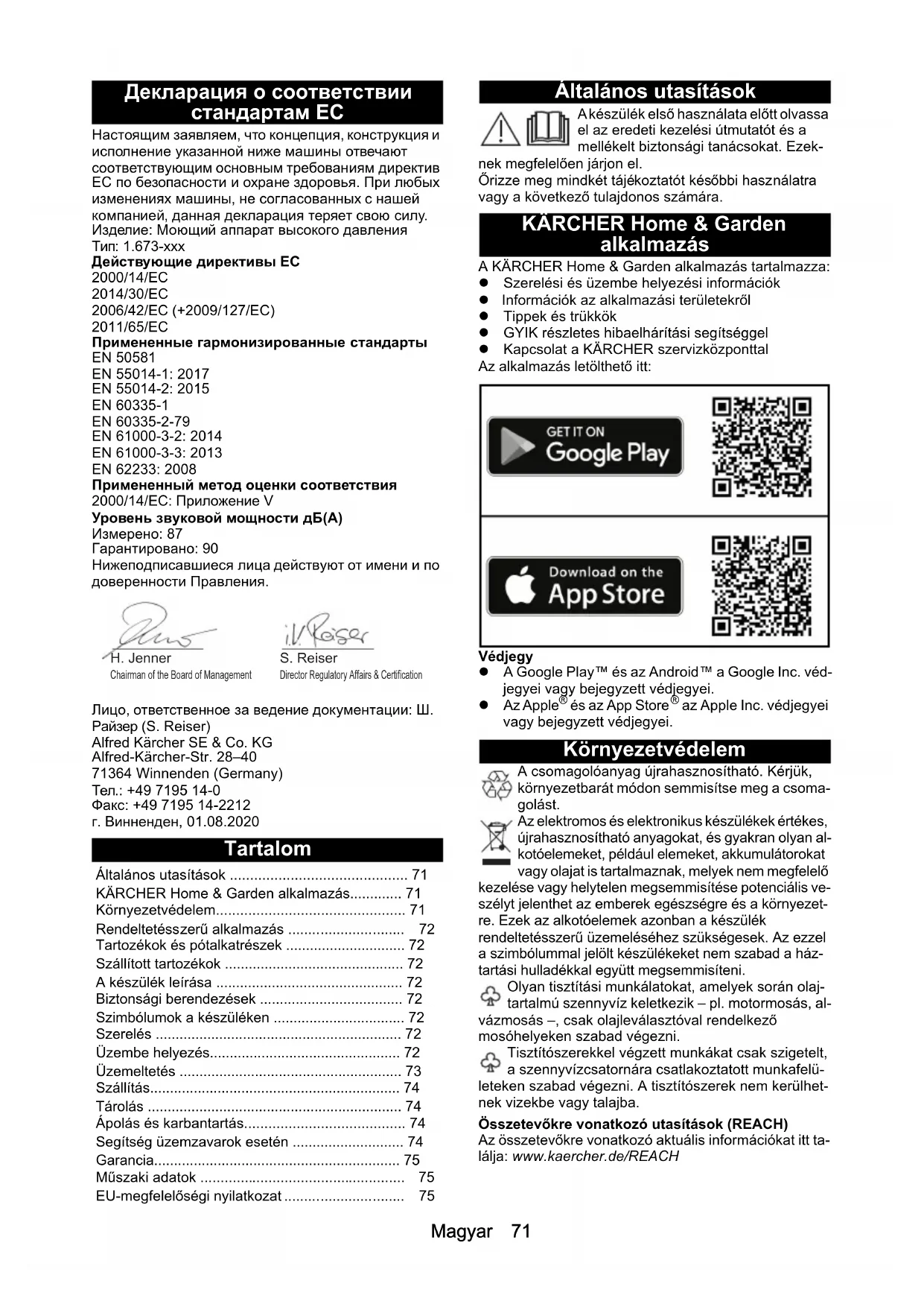 EN 50581 EN 55014-1: 2017 EN 55014-2: 2015 EN 60335-1 EN 60335-2-79 EN 61000-3-2: 2014 EN 61000-3-3: 2013 EN 62233: 2008 Примененный метод оценки соответствия 2000/14/ЕС: Приложение V Уровень звуковой мощности дБ(A) Измерено: 87 Гарантировано: 90 Нижеподписавшиеся лица действуют от имени и по доверенности Правления. Лицо, ответственное за ведение документации: Ш. Райзер (S. Reiser) Alfred Kärcher SE & Co. KG Alfred-Kärcher-Str. 28–40 71364 Winnenden (Germany) Тел.: +49 7195 14-0 Факс: +49 7195 14-2212 г. Винненден, 01.08.2020 Tartalom Általános utasítások A készülék első használata előtt olvassa el az eredeti kezelési útmutatót és a mellékelt biztonsági tanácsokat. Ezek- nek megfelelően járjon el. Őrizze meg mindkét tájékoztatót későbbi használatra vagy a következő tulajdonos számára. KÄRCHER Home & Garden alkalmazás A KÄRCHER Home & Garden alkalmazás tartalmazza: Szerelési és üzembe helyezési információk Információk az alkalmazási területekről Tippek és trükkök GYIK részletes hibaelhárítási segítséggel Kapcsolat a KÄRCHER szervizközponttal Az alkalmazás letölthető itt: Védjegy A Google Play™ és az Android™ a Google Inc. véd- jegyei vagy bejegyzett védjegyei. Az Apple
