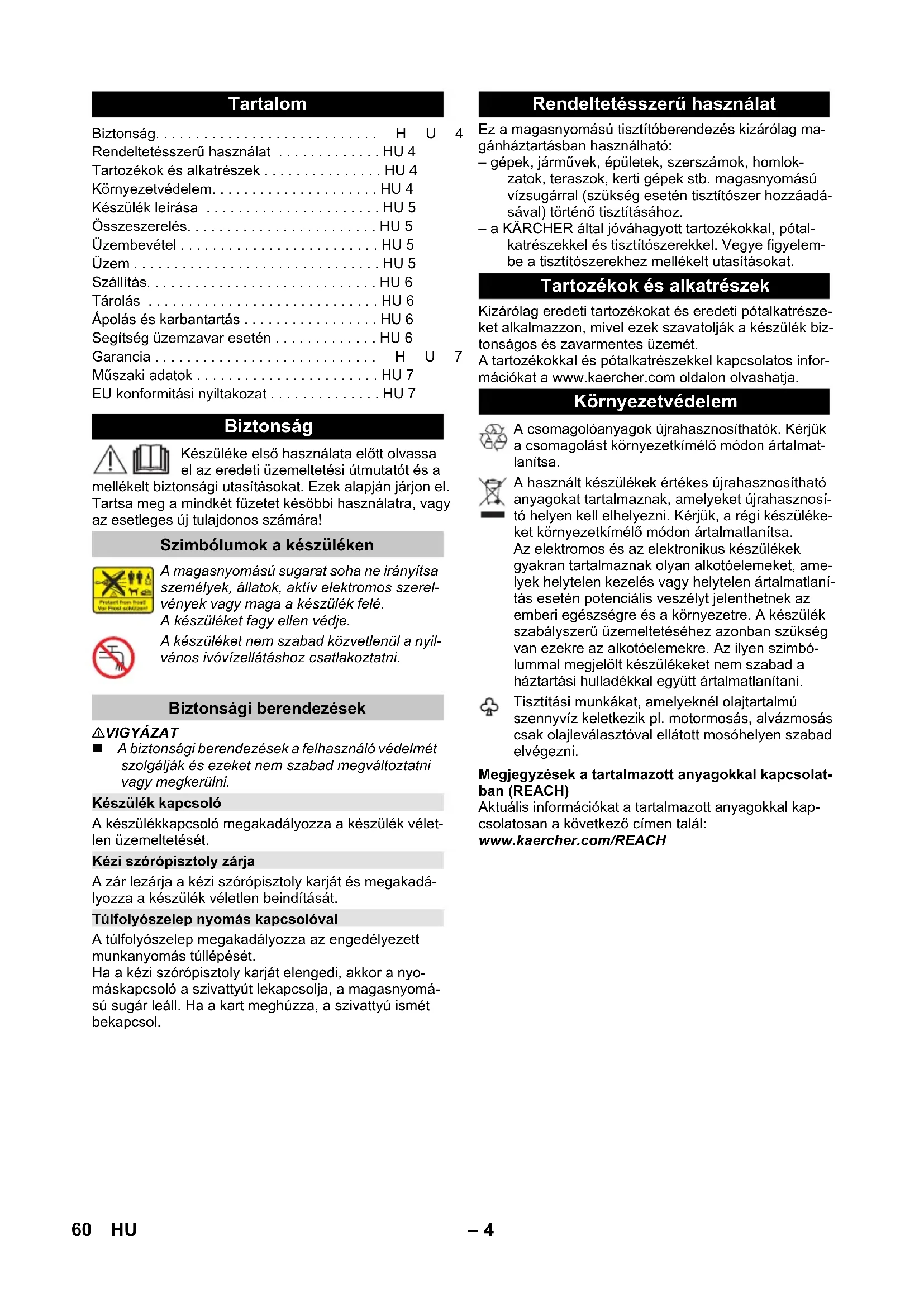 91 dB(A) 59RU– 4 Készüléke első használata előtt olvassa el az eredeti üzemeltetési útmutatót és a mellékelt biztonsági utasításokat. Ezek alapján járjon el. Tartsa meg a mindkét füzetet későbbi használatra, vagy az esetleges új tulajdonos számára! 몇 VIGYÁZAT A biztonsági berendezések a felhasználó védelmét szolgálják és ezeket nem szabad megváltoztatni vagy megkerülni. A készülékkapcsoló megakadályozza a készülék vélet- len üzemeltetését. A zár lezárja a kézi szórópisztoly karját és megakadá- lyozza a készülék véletlen beindítását. A túlfolyószelep megakadályozza az engedélyezett munkanyomás túllépését. Ha a kézi szórópisztoly karját elengedi, akkor a nyo- máskapcsoló a szivattyút lekapcsolja, a magasnyomá- sú sugár leáll. Ha a kart meghúzza, a szivattyú ismét bekapcsol. Ez a magasnyomású tisztítóberendezés kizárólag ma- gánháztartásban használható: – gépek, járművek, épületek, szerszámok, homlok- zatok, teraszok, kerti gépek stb. magasnyomású vízsugárral (szükség esetén tisztítószer hozzáadá- sával) történő tisztításához. – a KÄRCHER által jóváhagyott tartozékokkal, pótal- katrészekkel és tisztítószerekkel. Vegye figyelem- be a tisztítószerekhez mellékelt utasításokat. Kizárólag eredeti tartozékokat és eredeti pótalkatrésze- ket alkalmazzon, mivel ezek szavatolják a készülék biz- tonságos és zavarmentes üzemét. A tartozékokkal és pótalkatrészekkel kapcsolatos infor- mációkat a www.kaercher.com oldalon olvashatja. Megjegyzések a tartalmazott anyagokkal kapcsolat- ban (REACH) Aktuális információkat a tartalmazott anyagokkal kap- csolatosan a következő címen talál: www.kaercher.com/REACH Tartalom Biztonság. . . . . . . . . . . . . . . . . . . . . . . . . . . .HU4 Rendeltetésszerű használat . . . . . . . . . . . . . HU 4 Tartozékok és alkatrészek . . . . . . . . . . . . . . . HU 4 Környezetvédelem. . . . . . . . . . . . . . . . . . . . . HU 4 Készülék leírása . . . . . . . . . . . . . . . . . . . . . . HU 5 Összeszerelés. . . . . . . . . . . . . . . . . . . . . . . . HU 5 Üzembevétel . . . . . . . . . . . . . . . . . . . . . . . . . HU 5 Üzem . . . . . . . . . . . . . . . . . . . . . . . . . . . . . . . HU 5 Szállítás. . . . . . . . . . . . . . . . . . . . . . . . . . . . . HU 6 Tárolás . . . . . . . . . . . . . . . . . . . . . . . . . . . . . HU 6 Ápolás és karbantartás . . . . . . . . . . . . . . . . . HU 6 Segítség üzemzavar esetén . . . . . . . . . . . . . HU 6 Garancia . . . . . . . . . . . . . . . . . . . . . . . . . . . .HU7 Műszaki adatok . . . . . . . . . . . . . . . . . . . . . . . HU 7 EU konformitási nyiltakozat . . . . . . . . . . . . . . HU 7 Biztonság Szimbólumok a készüléken A magasnyomású sugarat soha ne irányítsa személyek, állatok, aktív elektromos szerel- vények vagy maga a készülék felé. A készüléket fagy ellen védje. A készüléket nem szabad közvetlenül a nyil- vános ivóvízellátáshoz csatlakoztatni. Biztonsági berendezések Készülék kapcsoló Kézi szórópisztoly zárja Túlfolyószelep nyomás kapcsolóval Rendeltetésszerű használat Tartozékok és alkatrészek Környezetvédelem A csomagolóanyagok újrahasznosíthatók. Kérjük a csomagolást környezetkímélő módon ártalmat- lanítsa. A használt készülékek értékes újrahasznosítható anyagokat tartalmaznak, amelyeket újrahasznosí- tó helyen kell elhelyezni. Kérjük, a régi készüléke- ket környezetkímélő módon ártalmatlanítsa. Az elektromos és az elektronikus készülékek gyakran tartalmaznak olyan alkotóelemeket, ame- lyek helytelen kezelés vagy helytelen ártalmatlaní- tás esetén potenciális veszélyt jelenthetnek az emberi egészségre és a környezetre. A készülék szabályszerű üzemeltetéséhez azonban szükség van ezekre az alkotóelemekre. Az ilyen szimbó- lummal megjelölt készülékeket nem szabad a háztartási hulladékkal együtt ártalmatlanítani. Tisztítási munkákat, amelyeknél olajtartalmú szennyvíz keletkezik pl. motormosás, alvázmosás csak olajleválasztóval ellátott mosóhelyen szabad elvégezni. 60 HU– 5 A készülék szállítási terjedelme fel van tüntetve a cso- magoláson. Kicsomagoláskor ellenőrizze a csomagolás tartalmát, hogy megvan-e minden alkatrész. Hiányzó tartozék vagy szállítási sérülés esetén kérem, értesítse a kereskedőt. Ábrákat lásd a 2. oldalon 1 Vízcsatlakozás beépített szűrővel 2 Csatlakozóelem a vízcsatlakozáshoz 3 Magasnyomású csatlakozás 4 Tartozékok rekesze 5 Fogantyú 6 Hálózati csatlakozóvezeték hálózati csatlakozóval 7 Kábelkapocs 8 A hálózati csatlakozóvezeték tárolója 9 Készülékkapcsoló „0/OFF“ / „I/ON“ 10 Kézi szórópisztoly 11 Kézi szórópisztoly zárja 12 Kapocs a magasnyomású tömlőhöz 13 Reteszelő hüvely 14 Sugárcső hosszabbítás 15 Sugárcső nyomásszabályozóval (Vario Power) A munkanyomás fokozatmentesen „SOFT”-ról „HARD”-ra növelhető. A munkanyomás átállításá- hoz engedje el a nagynyomású pisztoly karját, és forgassa a szórócsövet a kívánt állásba. 16 Magasnyomású tömlő Üzembevétel előtt szerelje fel a mellékelt különálló al- katrészeket. Ábrákat lásd a 3. oldalon Ábra Csavarozza a szállított csatlakozó alkatrészt a ké- szülék vízcsatlakozójára. Ábra A magasnyomású tömlő kapcsát húzza ki a kézi szórópisztolyból. Ábra Helyezze a magasnyomású tömlőt a kézi szóró- pisztolyba. Nyomja be a kapcsot, amíg bekattan. A biztos csat- lakozást a magasnyomású tömlő meghúzásával ellenőrizni. A készüléket sík területre állítsa. Ábra A magasnyomású tömlőt a berendezés magasnyo- mású csatlakozásával összekapcsolni. A biztos csatlakozást a magasnyomású tömlő meghúzásával ellenőrizni. Dugja b