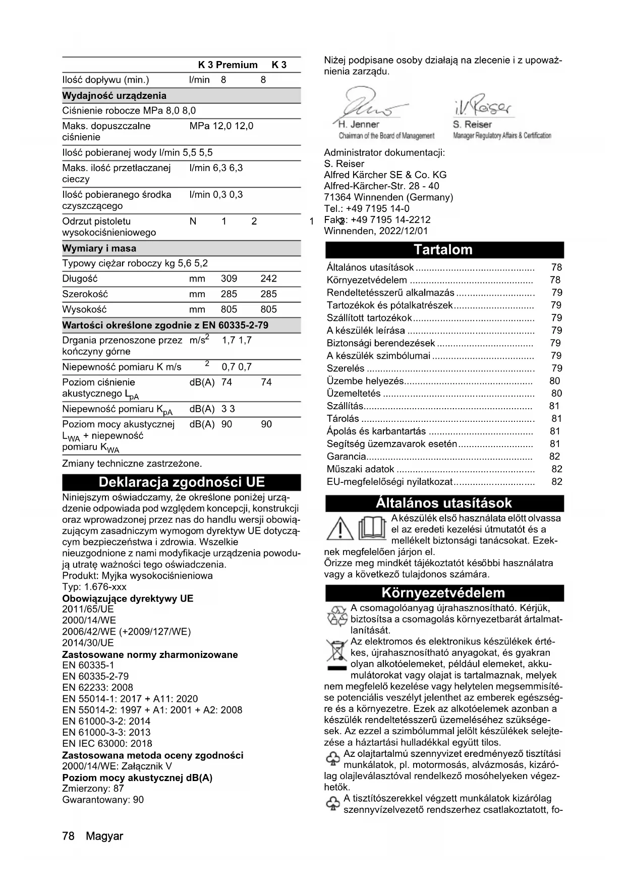 tószer szívótömlőjén. Garancia Minden országban az illetékes értékesítő társaságunk által megadott garanciális feltételek vannak érvényben. A készüléknél felmerülő esetleges zavarokat a garanci- aidőn belül díjmentesen orvosoljuk, amennyiben anyag- , illetve gyártási hibáról van szó. Garanciális esetben kérjük, a számlával együtt forduljon kereskedőjéhez vagy a legközelebbi, arra jogosult ügyfélszolgálati iro- dához. (A címet lásd a hátoldalon) Műszaki adatok A műszaki változtatások jogát fenntartjuk. EU-megfelelőségi nyilatkozat Ezúton kijelentjük, hogy az alább megjelölt gép tervezé- se és felépítése alapján, valamint az általunk forgalom- ba hozott kivitelben megfelel a vonatkozó EU- irányelvek alapvető biztonsági és egészségügyi köve- telményeinek. A gépen végzett, de velünk nem egyez- tetett módosítás esetén jelen nyilatkozat érvényét veszti. Termék: Magasnyomású mosó Típus: 1.676-xxx Vonatkozó EU-irányelvek 2011/65/EU 2000/14/EK 2006/42/EK (+2009/127/EK) 2014/30/EU Alkalmazott harmonizált szabványok EN 60335-1 EN 60335-2-79 EN 62233: 2008 EN 55014-1: 2017 + A11: 2020 EN 55014-2: 1997 + A1: 2001 + A2: 2008 EN 61000-3-2: 2014 EN 61000-3-3: 2013 EN IEC 63000: 2018 Alkalmazott megfelelőségértékelési eljárások 2000/14/EK: V. melléklet K 3 Premium K 3 Elektromos csatlakozás Feszültség V 220-240 220-240 Fázis ~ 1 1 Frekvencia Hz 50-60 50-60 Áramfelvétel A 6 6 Védettség IPX5 IPX5 Érintésvédelmi osztály II II Hálózati biztosíték (lassú ki- oldású) A10 10 Vízcsatlakozás Hozzáfolyási nyomás (max.) MPa 1,2 1,2 Hozzáfolyási hőmérséklet (max.) °C 40 40 Hozzáfolyási mennyiség (min.) l/min 8 8 A készülék teljesítményre vonatkozó adatai Üzemi nyomás MPa 8,0 8,0 Max. engedélyezett nyomás MPa 12,0 12,0 Szállítási mennyiség, víz l/min 5,5 5,5 Max. szállítási mennyiség l/min 6,3 6,3 Szállítási mennyiség, tisztítószer l/min 0,3 0,3 A magasnyomású pisztoly visszalökőereje N12 12 Méretek és súlyok Jellemző üzemi súly kg 5,6 5,2 Hosszúság mm 309 242 Szélesség mm 285 285 Magasság mm 805 805 Az EN 60335-2-79 szerint meghatározott értékek Kéz-kar-vibrációs érték m/s
