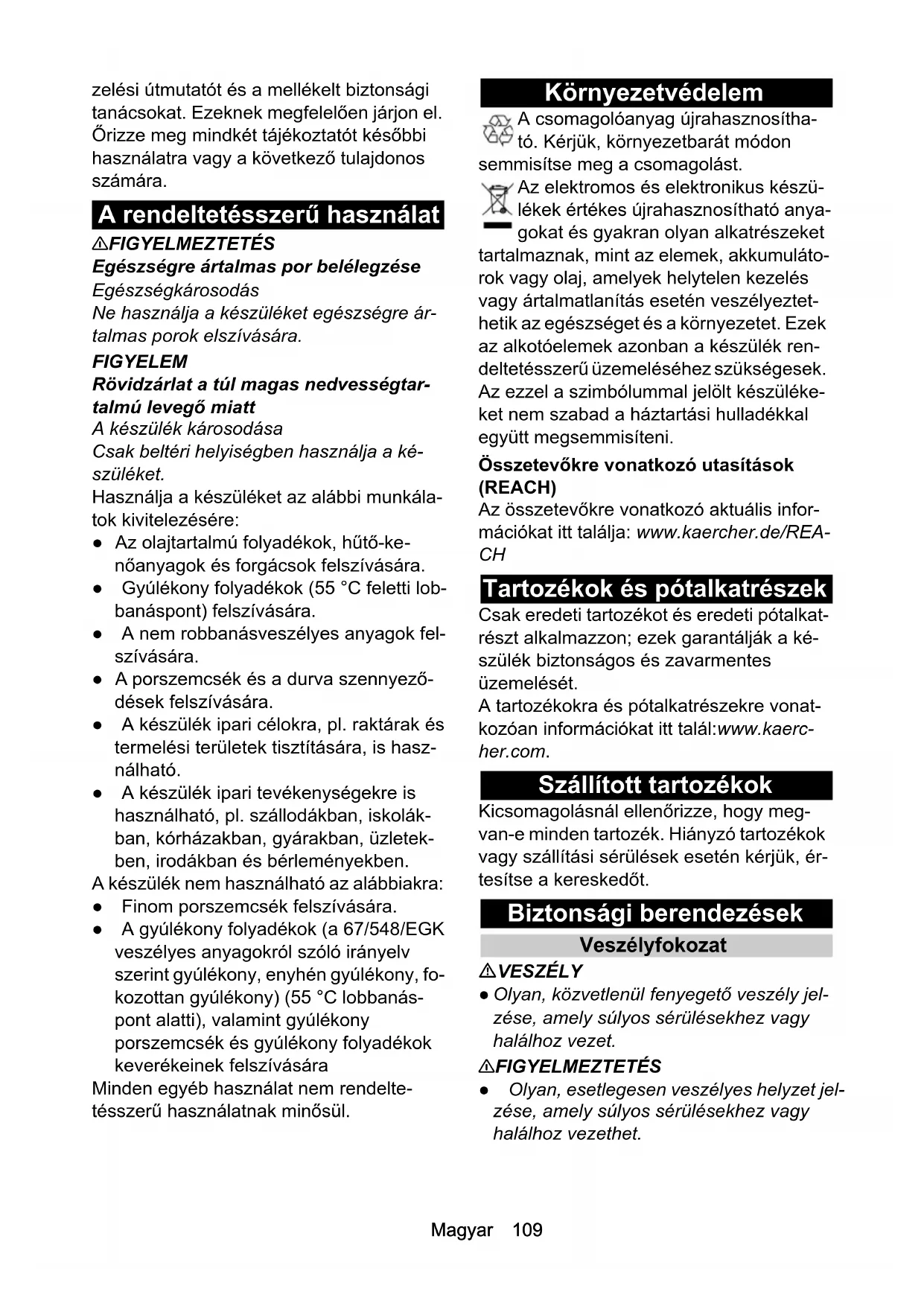 - EU-megfelelőségi nyilatkozat Magyar 109 zelési útmutatót és a mellékelt biztonsági tanácsokat. Ezeknek megfelelően járjon el. Őrizze meg mindkét tájékoztatót későbbi használatra vagy a következő tulajdonos számára. A rendeltetésszerű használat 몇 FIGYELMEZTETÉS Egészségre ártalmas por belélegzése Egészségkárosodás Ne használja a készüléket egészségre ár- talmas porok elszívására. FIGYELEM Rövidzárlat a túl magas nedvességtar- talmú levegő miatt A készülék károsodása Csak beltéri helyiségben használja a ké- szüléket. Használja a készüléket az alábbi munkála- tok kivitelezésére: ● Az olajtartalmú folyadékok, hűtő-ke- nőanyagok és forgácsok felszívására. ● Gyúlékony folyadékok (55 °C feletti lob- banáspont) felszívására. ● A nem robbanásveszélyes anyagok fel- szívására. ● A porszemcsék és a durva szennyező- dések felszívására. ● A készülék ipari célokra, pl. raktárak és termelési területek tisztítására, is hasz- nálható. ● A készülék ipari tevékenységekre is használható, pl. szállodákban, iskolák- ban, kórházakban, gyárakban, üzletek- ben, irodákban és bérleményekben. A készülék nem használható az alábbiakra: ● Finom porszemcsék felszívására. ● A gyúlékony folyadékok (a 67/548/EGK veszélyes anyagokról szóló irányelv szerint gyúlékony, enyhén gyúlékony, fo- kozottan gyúlékony) (55 °C lobbanás- pont alatti), valamint gyúlékony porszemcsék és gyúlékony folyadékok keverékeinek felszívására Minden egyéb használat nem rendelte- tésszerű használatnak minősül. Környezetvédelem A csomagolóanyag újrahasznosítha- tó. Kérjük, környezetbarát módon semmisítse meg a csomagolást. Az elektromos és elektronikus készü- lékek értékes újrahasznosítható anya- gokat és gyakran olyan alkatrészeket tartalmaznak, mint az elemek, akkumuláto- rok vagy olaj, amelyek helytelen kezelés vagy ártalmatlanítás esetén veszélyeztet- hetik az egészséget és a környezetet. Ezek az alkotóelemek azonban a készülék ren- deltetésszerű üzemeléséhez szükségesek. Az ezzel a szimbólummal jelölt készüléke- ket nem szabad a háztartási hulladékkal együtt megsemmisíteni. Összetevőkre vonatkozó utasítások (REACH) Az összetevőkre vonatkozó aktuális infor- mációkat itt találja: www.kaercher.de/REA- p. 114