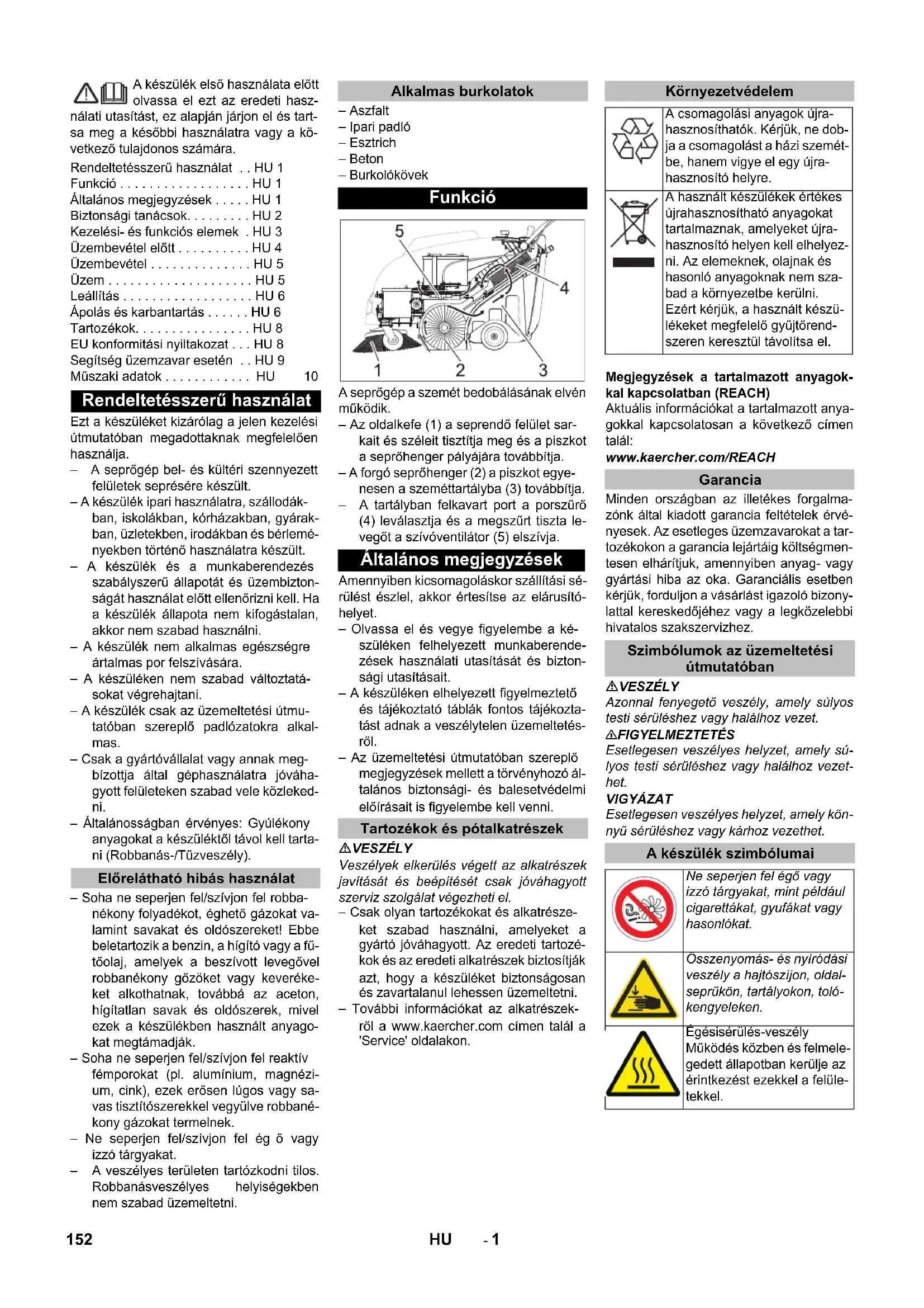 0,2 0,2 151RU- 1 A készülék első használata előtt olvassa el ezt az eredeti hasz- nálati utasítást, ez alapján járjon el és tart- sa meg a későbbi használatra vagy a kö- vetkező tulajdonos számára. Ezt a készüléket kizárólag a jelen kezelési útmutatóban megadottaknak megfelelően használja. – A seprőgép bel- és kültéri szennyezett felületek seprésére készült. – A készülék ipari használatra, szállodák- ban, iskolákban, kórházakban, gyárak- ban, üzletekben, irodákban és bérlemé- nyekben történő használatra készült. – A készülék és a munkaberendezés szabályszerű állapotát és üzembizton- ságát használat előtt ellenőrizni kell. Ha a készülék állapota nem kifogástalan, akkor nem szabad használni. – A készülék nem alkalmas egészségre ártalmas por felszívására. – A készüléken nem szabad változtatá- sokat végrehajtani. – A készülék csak az üzemeltetési útmu- tatóban szereplő padlózatokra alkal- mas. – Csak a gyártóvállalat vagy annak meg- bízottja által géphasználatra jóváha- gyott felületeken szabad vele közleked- ni. – Általánosságban érvényes: Gyúlékony anyagokat a készüléktől távol kell tarta- ni (Robbanás-/Tűzveszély). – Soha ne seperjen fel/szívjon fel robba- nékony folyadékot, éghető gázokat va- lamint savakat és oldószereket! Ebbe beletartozik a benzin, a hígító vagy a fű- tőolaj, amelyek a beszívott levegővel robbanékony gőzöket vagy keveréke- ket alkothatnak, továbbá az aceton, hígítatlan savak és oldószerek, mivel ezek a készülékben használt anyago- kat megtámadják. – Soha ne seperjen fel/szívjon fel reaktív fémporokat (pl. alumínium, magnézi- um, cink), ezek erősen lúgos vagy sa- vas tisztítószerekkel vegyülve robbané- kony gázokat termelnek. – Ne seperjen fel/szívjon fel ég ő vagy izzó tárgyakat.