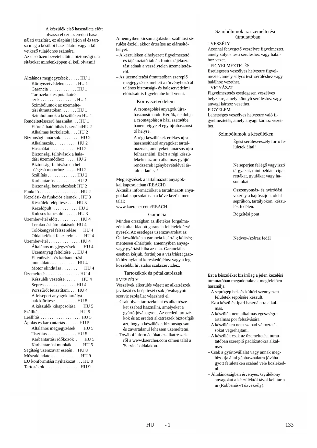 2000/14/ЕС: Приложение V Уровень мощности звука дБ(A) Измерено: 82 Гарантировано: 83 Chairman of the Board of Management Director Regulatory Affairs & Certification 132 RU- 1 A készülék első használata előtt olvassa el ezt az eredeti hasz- nálati utasítást, ez alapján járjon el és tart- sa meg a későbbi használatra vagy a kö- vetkező tulajdonos számára. Az első üzembevétel előtt a biztonsági uta- sításokat mindenképpen el kell olvasni! Amennyiben kicsomagoláskor szállítási sé- rülést észlel, akkor értesítse az elárusító- helyet. – A készüléken elhelyezett figyelmeztető és tájékoztató táblák fontos tájékozta- tást adnak a veszélytelen üzemeltetés- ről. – Az üzemeltetési útmutatóban szereplő megjegyzések mellett a törvényhozó ál- talános biztonsági- és balesetvédelmi előírásait is figyelembe kell venni. Megjegyzések a tartalmazott anyagok- kal kapcsolatban (REACH) Aktuális információkat a tartalmazott anya- gokkal kapcsolatosan a következő címen talál: www.kaercher.com/REACH Minden országban az illetékes forgalma- zónk által kiadott garancia feltételek érvé- nyesek. Az esetleges üzemzavarokat az Ön készülékén a garancia lejártáig költség- mentesen elhárítjuk, amennyiben anyag- vagy gyártási hiba az oka. Garanciális esetben kérjük, forduljon a vásárlást igazo- ló bizonylattal kereskedőjéhez vagy a leg- közelebbi hivatalos szakszervizhez. VESZÉLY Veszélyek elkerülés végett az alkatrészek javítását és beépítését csak jóváhagyott szerviz szolgálat végezheti el. – Csak olyan tartozékokat és alkatrésze- ket szabad használni, amelyeket a gyártó jóváhagyott. Az eredeti tartozé- kok és az eredeti alkatrészek biztosítják azt, hogy a készüléket biztonságosan és zavartalanul lehessen üzemeltetni. – További információkat az alkatrészek- ről a www.kaercher.com címen talál a 'Service' oldalakon. VESZÉLY Azonnal fenyegető veszélyre figyelmeztet, amely súlyos testi sérüléshez vagy halál- hoz vezet. 몇 FIGYELMEZTETÉS Esetlegesen veszélyes helyzetre figyel- meztet, amely súlyos testi sérüléshez vagy halálhoz vezethet. 몇 VIGYÁZAT Figyelmeztetés esetlegesen veszélyes helyzetre, amely könnyű sérüléshez vagy anyagi kárhoz vezethet. FIGYELEM Lehetséges veszélyes helyzetre való fi- gyelmeztetés, amely anyagi kárhoz vezet- het. Ezt a készüléket kizárólag a jelen kezelési útmutatóban megadottaknak megfelelően használja. – A seprőgép bel- és kültéri szennyezett felületek seprésére készült. – Ez a készülék ipari használatra alkal- mas. – A készülék nem alkalmas egészségre ártalmas por felszívására. – A készüléken nem szabad változtatá- sokat végrehajtani. – A készülék csak az üzemeltetési útmu- tatóban szereplő padlózatokra alkal- mas. – Csak a gyártóvállalat vagy annak meg- bízottja által géphasználatra jóváha- gyott felületeken szabad vele közleked- ni. – Általánosságban érvényes: Gyúlékony anyagokat a készüléktől távol kell tarta- ni (Robbanás-/Tűzveszély). Tartalomjegyzék Általános megjegyzések . . . . . HU 1 Környezetvédelem . . . . . HU 1 Garancia . . . . . . . . . . . . HU 1 Tartozékok és pótalkatré- szek . . . . . . . . . . . . . . . . HU 1 Szimbólumok az üzemelte- tési útmutatóban . . . . . . HU 1 Szimbólumok a készüléken HU 1 Rendeltetésszerű használat . . HU 1 Előrelátható hibás használatHU 2 Alkalmas burkolatok. . . . HU 2 Biztonsági tanácsok. . . . . . . . . HU 2 Alkalmazás. . . . . . . . . . . HU 2 Használat. . . . . . . . . . . . HU 2 Biztonsági felhívások a hala- dási üzemmódhoz . . . . . HU 2 Biztonsági felhívások a bel- sőégésű motorhoz . . . . . HU 2 Szállítás . . . . . . . . . . . . . HU 2 Karbantartás . . . . . . . . . HU 2 Biztonsági berendezések HU 2 Funkció . . . . . . . . . . . . . . . . . . HU 2 Kezelési- és funkciós elemek . HU 3 Készülék felépítése . . . . HU 3 Kezelőpult . . . . . . . . . . . HU 3 Kulcsos kapcsoló . . . . . . HU 3 Üzembevétel előtt . . . . . . . . . . HU 4 Lerakodási útmutatások. HU 4 Tolókengyel felszerelése HU 4 Oldalkeféket felszerelni . HU 4 Üzembevétel . . . . . . . . . . . . . . HU 4 Általános megjegyzések HU 4 Üzemanyag feltöltése . . HU 4 Ellenőrzési- és karbantartási munkálatok. . . . . . . . . . . HU 4 Motor elindítása . . . . . . . HU 4 Üzemeltetés. . . . . . . . . . . . . . . HU 4 Készülék vezetése. . . . . HU 4 Seprés . . . . . . . . . . . . . . HU 4 Porszűrőt letisztítani. . . . HU 4 A felsepert anyagok tartályá- nak kiürítése. . . . . . . . . . HU 5 A készülék kikapcsolása HU 5 Szállítás. . . . . . . . . . . . . . . . . . HU 5 Leállítás . . . . . . . . . . . . . . . . . . HU 5 Ápolás és karbantartás . . . . . . HU 5 Általános megjegyzések HU 5 Tisztítás . . . . . . . . . . . . . HU 5 Karbantartási időközök . HU 5 Karbantartási munkák . . HU 5 Segítség üzemzavar esetén . . HU 8 Műszaki adatok . . . . . . . . . . . . HU 9 EU konformitási nyiltakozat . . . HU 9 Tartozékok. . . . . . . . . . . . . . . . HU 9 Általános megjegyzések Környezetvédelem A csomagolási anyagok újra- hasznosíthatók. Kérjük, ne dobja a csomagolást a házi szemétbe, hanem vigye el egy újrahasznosí- tó helyre. A régi készülékek értékes újra- hasznosítható anyagokat tartal- maznak, amelyeket tanácsos újra felhasználni. Ezért a régi készü- lékeket az arra alkalmas gyűjtő- rendszerek igénybevételével ár- talmatlanítsa! Garancia Tartozékok és pótalkatrészek Szimbólumok az üzemeltetési útmutatóban Szimbólumok a készüléken Égési sérülésveszély forró fe- lületek által! Ne seperjen fel égő vagy izzó tárgyakat, mint például ciga- rettákat, gyufákat vagy ha- sonlókat