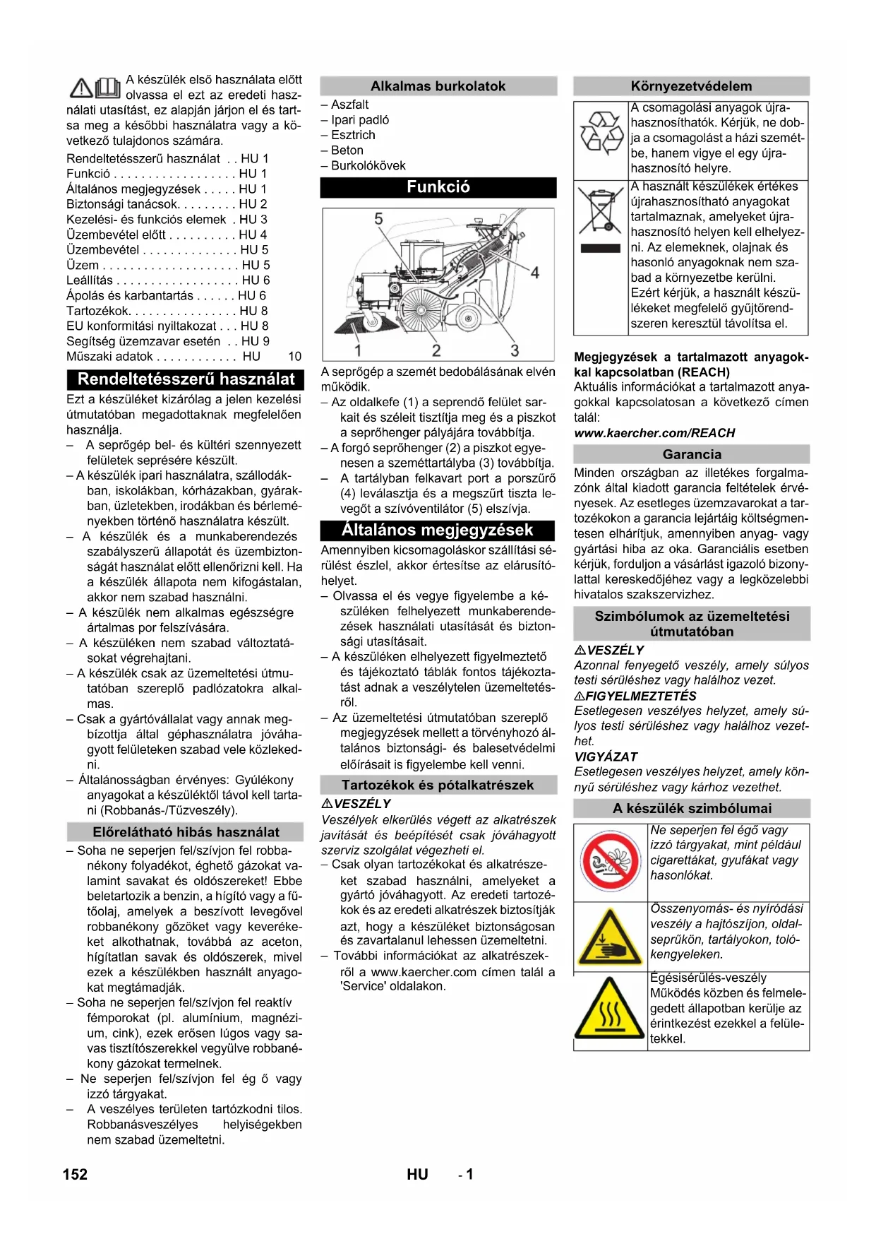 A veszélyes területen tartózkodni tilos. Robbanásveszélyes helyiségekben nem szabad üzemeltetni. – Aszfalt – Ipari padló – Esztrich – Beton – Burkolókövek A seprőgép a szemét bedobálásának elvén működik. – Az oldalkefe (1) a seprendő felület sar- kait és széleit tisztítja meg és a piszkot a seprőhenger pályájára továbbítja. – A forgó seprőhenger (2) a piszkot egye- nesen a szeméttartályba (3) továbbítja. – A tartályban felkavart port a porszűrő (4) leválasztja és a megszűrt tiszta le- vegőt a szívóventilátor (5) elszívja. Amennyiben kicsomagoláskor szállítási sé- rülést észlel, akkor értesítse az elárusító- helyet. – Olvassa el és vegye figyelembe a ké- szüléken felhelyezett munkaberende- zések használati utasítását és bizton- sági utasításait. – A készüléken elhelyezett figyelmeztető és tájékoztató táblák fontos tájékozta- tást adnak a veszélytelen üzemeltetés- ről. – Az üzemeltetési útmutatóban szereplő megjegyzések mellett a törvényhozó ál- talános biztonsági- és balesetvédelmi előírásait is figyelembe kell venni. VESZÉLY Veszélyek elkerülés végett az alkatrészek javítását és beépítését csak jóváhagyott szerviz szolgálat végezheti el. – Csak olyan tartozékokat és alkatrésze- ket szabad használni, amelyeket a gyártó jóváhagyott. Az eredeti tartozé- kok és az eredeti alkatrészek biztosítják azt, hogy a készüléket biztonságosan és zavartalanul lehessen üzemeltetni. – További információkat az alkatrészek- ről a www.kaercher.com címen talál a 'Service' oldalakon. Megjegyzések a tartalmazott anyagok- kal kapcsolatban (REACH) Aktuális információkat a tartalmazott anya- gokkal kapcsolatosan a következő címen talál: www.kaercher.com/REACH Minden országban az illetékes forgalma- zónk által kiadott garancia feltételek érvé- nyesek. Az esetleges üzemzavarokat a tar- tozékokon a garancia lejártáig költségmen- tesen elhárítjuk, amennyiben anyag- vagy gyártási hiba az oka. Garanciális esetben kérjük, fordul jon a vásárlást igazoló bizony- lattal kereskedőjéhez vagy a legközelebbi hivatalos szakszervizhez. VESZÉLY Azonnal fenyegető veszély, amely súlyos testi sérüléshez vagy halálhoz vezet. 몇 FIGYELMEZTETÉS Esetlegesen veszélyes helyzet, amely sú- lyos testi sérüléshez vagy halálhoz vezet- het. VIGYÁZAT Esetlegesen veszélyes helyzet, amely kön- nyű sérüléshez vagy kárhoz vezethet. Rendeltetésszerű használat . . HU 1 Funkció . . . . . . . . . . . . . . . . . . HU 1 Általános megjegyzések . . . . . HU 1 Biztonsági tanácsok. . . . . . . . . HU 2 Kezelési- és funkciós elemek . HU 3 Üzembevétel előtt . . . . . . . . . . HU 4 Üzembevétel . . . . . . . . . . . . . . HU 5 Üzem . . . . . . . . . . . . . . . . . . . . HU 5 Leállítás . . . . . . . . . . . . . . . . . . HU 6 Ápolás és karbantartás . . . . . . HU 6 Tartozékok. . . . . . . . . . . . . . . . HU 8 EU konformitási nyiltakozat . . . HU 8 Segítség üzemzavar esetén . . HU 9 Műszaki adatok . . . . . . . . . . . . HU 10 Rendeltetésszerű használat Előrelátható hibás használat Alkalmas burkolatok Funkció Általános megjegyzések Tartozékok és pótalkatrészek Környezetvédelem A csomagolási anyagok újra- hasznosíthatók. Kérjük, ne dob- ja a csomagolást a házi szemét- be, hanem vigye el egy újra- hasznosító helyre. A használt készülékek értékes újrahasznosítható anyagokat tartalmaznak, amelyeket újra- hasznosító helyen kell elhelyez- ni. Az elemeknek, olajnak és hasonló anyagoknak nem sza- bad a környezetbe kerülni. Ezért kérjük, a használt készü- lékeket megfelelő gyűjtőrend- szeren keresztül távolítsa el. Garancia Szimbólumok az üzemeltetési útmutatóban A készülék szimbólumai Ne seperjen fel égő vagy izzó tárgyakat, mint például cigarettákat, gyufákat vagy hasonlókat. Összenyomás- és nyíródási veszély a hajtószíjon, oldal- seprűkön, tartályokon, toló- kengyeleken. Égésisérülés-veszély Működés közben és felmele- gedett állapotban kerülje az érintkezést ezekkel a felüle- tekkel. 152 HU- 2 – A készülék és a munkaberendezés szabályszerű állapotát és üzembizton- ságát használat előtt ellenőrizni kell. Ha a készülék állapota nem kifogástalan, akkor nem szabad használni. – A készülék veszélyes területen (például benzinkútnál) történő használatakor fi- gyelembe kell venni a megfelelő bizton- sági előírásokat. Tilos a készüléket rob- banásveszélyes helyiségekben működ- tetni. – A kezelőszemélynek a készüléket ren- deltetésszerűen kell használni. Figye- lembe kell vennie a helyi adottságokat, és a készülékkel való munka közben fi- gyelnie kell a harmadik személyekre, különösen a gyermekekre. – A munka megkezdése előtt a kez- előszemélynek meg kell győződnie ar- ról, hogy minden biztonsági berende- zés előírásszerűen fel van-e helyezve és működik-e. – A készülék kezelőszemélye felel más személyeket vagy az ő tulajdonaikat ért balesetért. – Ügyelni kell arra, hogy a kezelőszemély szűk ruházatot viseljen. Erős cipőt kell viselni és kerülni kell a lazán hordott ru- házatot. – Odahajtás előtt ellenőrizni kell a közeli területet (pl. gyermekek). Ügyelni kell a megfelelő látási viszonyokra! – A készülék jogosulatlan használatának elkerülés ére a kulcsot ki kell húzni. – Ha elmegy a készülék közeléből, bizto- sítsa véletlen mozgatás ellen. – A készüléket csak olyan személyek használhatják, akiket a kezelésre kiok- tattak vagy igazolni tudják, hogy képe- sek a készülék kezelésére és akiket a használattal kifejezetten megbíztak. – Ezt a készüléket csökkent fizikai, érzé- kelő vagy szellemi képességgel rendel- kező személyek (ideértve