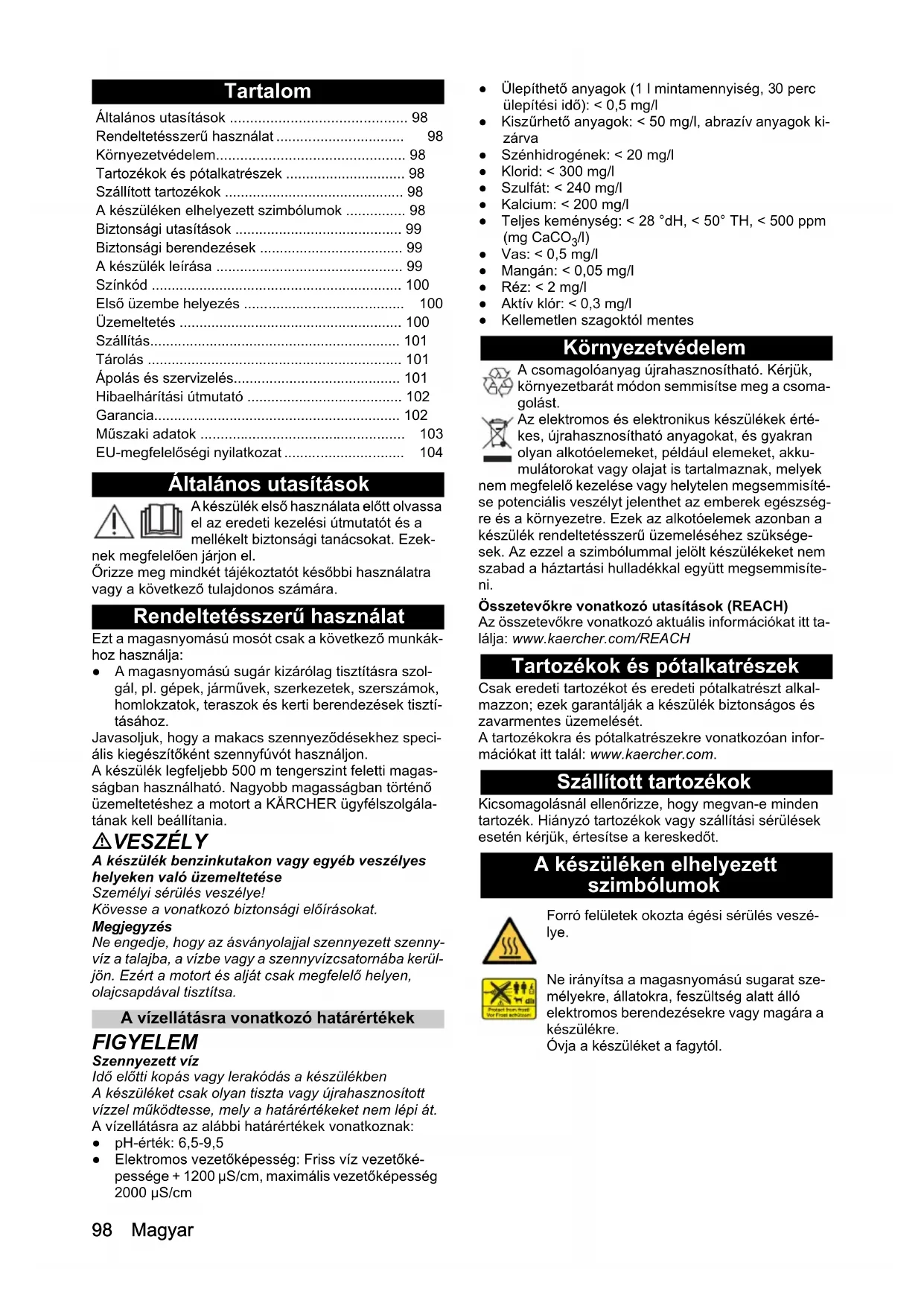 - /l) ● Vas: < 0,5 mg/l ● Mangán: < 0,05 mg/l ● Réz: < 2 mg/l ● Aktív klór: < 0,3 mg/l ● Kellemetlen szagoktól mentes Környezetvédelem A csomagolóanyag újrahasznosítható. Kérjük, környezetbarát módon semmisítse meg a csoma- golást. Az elektromos és elektronikus készülékek érté- kes, újrahasznosítható anyagokat, és gyakran olyan alkotóelemeket, például elemeket, akku- mulátorokat vagy olajat is tartalmaznak, melyek nem megfelelő kezelése vagy helytelen megsemmisíté- se potenciális veszélyt jelenthet az emberek egészség- re és a környezetre. Ezek az alkotóelemek azonban a készülék rendeltetésszerű üzemeléséhez szüksége- sek. Az ezzel a szimbólummal jelölt készülékeket nem szabad a háztartási hulladékkal együtt megsemmisíte- ni. Összetevőkre vonatkozó utasítások (REACH) Az összetevőkre vonatkozó aktuális információkat itt ta- lálja: www.kaercher.com/REACH Tartozékok és pótalkatrészek Csak eredeti tartozékot és eredeti pótalkatrészt alkal- mazzon; ezek garantálják a készülék biztonságos és zavarmentes üzemelését. A tartozékokra és pótalkatrészekre vonatkozóan infor- mációkat itt talál: www.kaercher.com. Szállított tartozékok Kicsomagolásnál ellenőrizze, hogy megvan-e minden tartozék. Hiányzó tartozékok vagy szállítási sérülések esetén kérjük, értesítse a kereskedőt. A készüléken elhelyezett szimbólumok Általános utasítások p. 98
