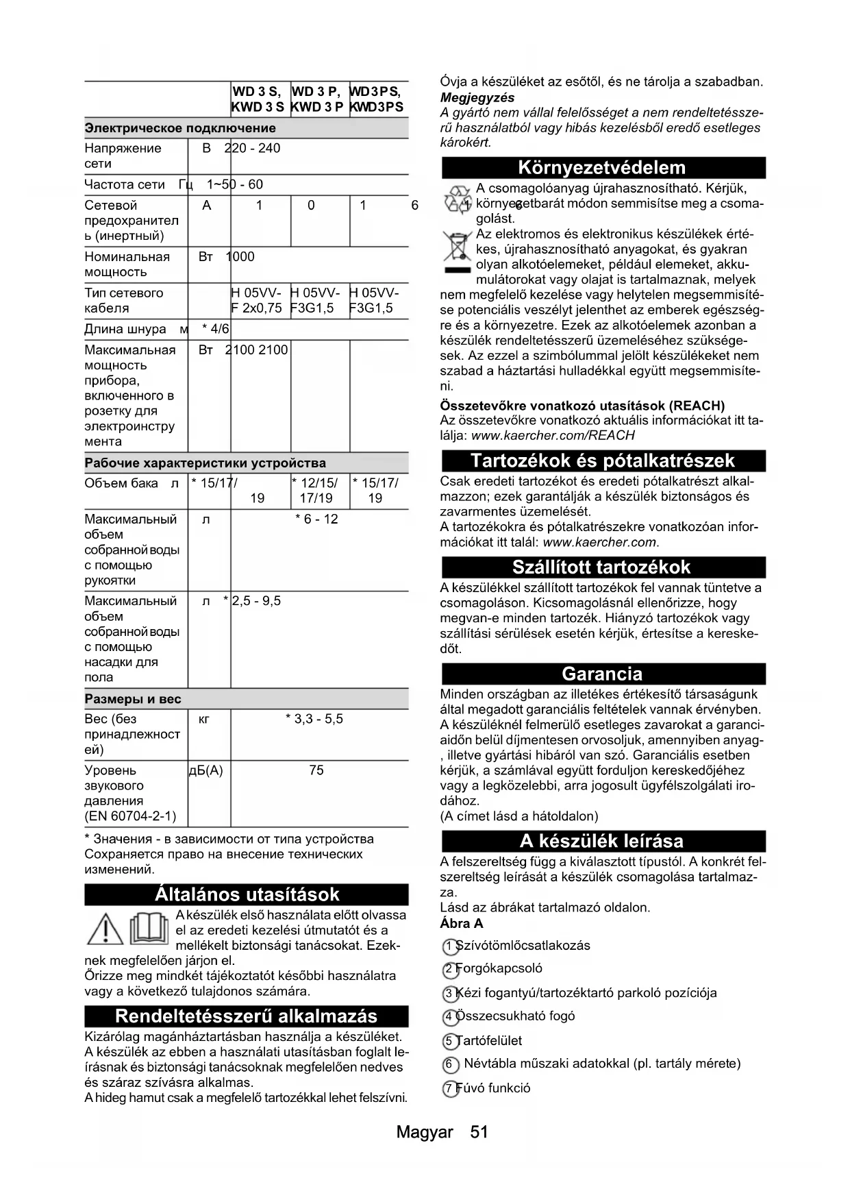 Általános utasítások A készülék első használata előtt olvassa el az eredeti kezelési útmutatót és a mellékelt biztonsági tanácsokat. Ezek- nek megfelelően járjon el. Őrizze meg mindkét tájékoztatót későbbi használatra vagy a következő tulajdonos számára. Rendeltetésszerű alkalmazás Kizárólag magánháztartásban használja a készüléket. A készülék az ebben a használati utasításban foglalt le- írásnak és biztonsági tanácsoknak megfelelően nedves és száraz szívásra alkalmas. A hideg hamut csak a megfelelő tartozékkal lehet felszívni. Óvja a készüléket az esőtől, és ne tárolja a szabadban. Megjegyzés A gyártó nem vállal felelősséget a nem rendeltetéssze- rű használatból vagy hibás kezelésből eredő esetleges károkért. Környezetvédelem A csomagolóanyag újrahasznosítható. Kérjük, környezetbarát módon semmisítse meg a csoma- golást. Az elektromos és elektronikus készülékek érté- kes, újrahasznosítható anyagokat, és gyakran olyan alkotóelemeket, például elemeket, akku- mulátorokat vagy olajat is tartalmaznak, melyek nem megfelelő kezelése vagy helytelen megsemmisíté- se potenciális veszélyt jelenthet az emberek egészség- re és a környezetre. Ezek az alkotóelemek azonban a készülék rendeltetésszerű üzemeléséhez szüksége- sek. Az ezzel a szimbólummal jelölt készülékeket nem szabad a háztartási hulladékkal együtt megsemmisíte- ni. Összetevőkre vonatkozó utasítások (REACH) Az összetevőkre vonatkozó aktuális információkat itt ta- lálja: www.kaercher.com/REACH Tartozékok és pótalkatrészek Csak eredeti tartozékot és eredeti pótalkatrészt alkal- mazzon; ezek garantálják a készülék biztonságos és zavarmentes üzemelését. A tartozékokra és pótalkatrészekre vonatkozóan infor- mációkat itt talál: www.kaercher.com. Szállított tartozékok A készülékkel szállított tartozékok fel vannak tüntetve a csomagoláson. Kicsomagolásnál ellenőrizze, hogy megvan-e minden tartozék. Hiányzó tartozékok vagy szállítási sérülések esetén kérjük, értesítse a kereske- dőt. Garancia Minden országban az illetékes értékesítő társaságunk által megadott garanciális feltételek vannak érvényben. A készüléknél felmerülő esetleges zavarokat a garanci- aidőn belül díjmentesen orvosoljuk, amennyiben anyag- , illetve gyártási hibáról van szó. Garanciális esetben kérjük, a számlával együtt forduljon kereskedőjéhez vagy a legközelebbi, arra jogosult ügyfélszolgálati iro- dához. (A címet lásd a hátoldalon) A készülék leírása A felszereltség függ a kiválasztott típustól. A konkrét fel- szereltség leírását a készülék csomagolása tartalmaz- za. Lásd az ábrákat tartalmazó oldalon. Ábra A 1 Szívótömlőcsatlakozás 2 Forgókapcsoló 3 Kézi fogantyú/tartozéktartó parkoló pozíciója 4 Összecsukható fogó 5 Tartófelület 6 Névtábla műszaki adatokkal (pl. tartály mérete) 7 Fúvó funkció WD 3 S, KWD 3 S WD 3 P, KWD 3 P WD 3 P S,